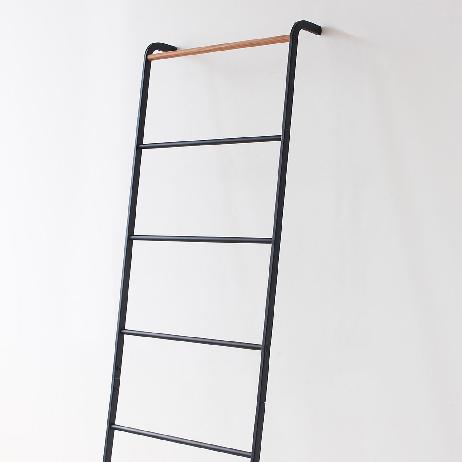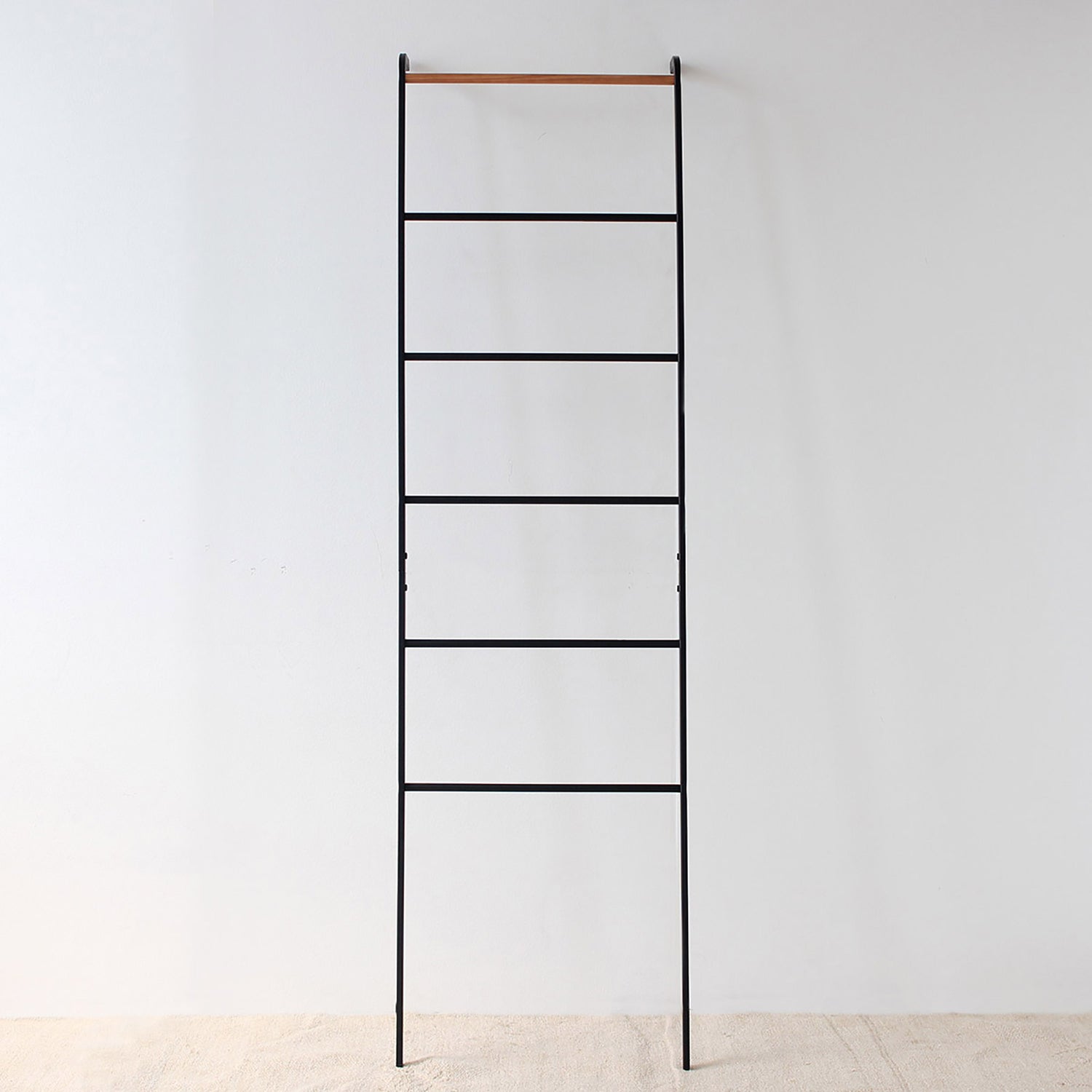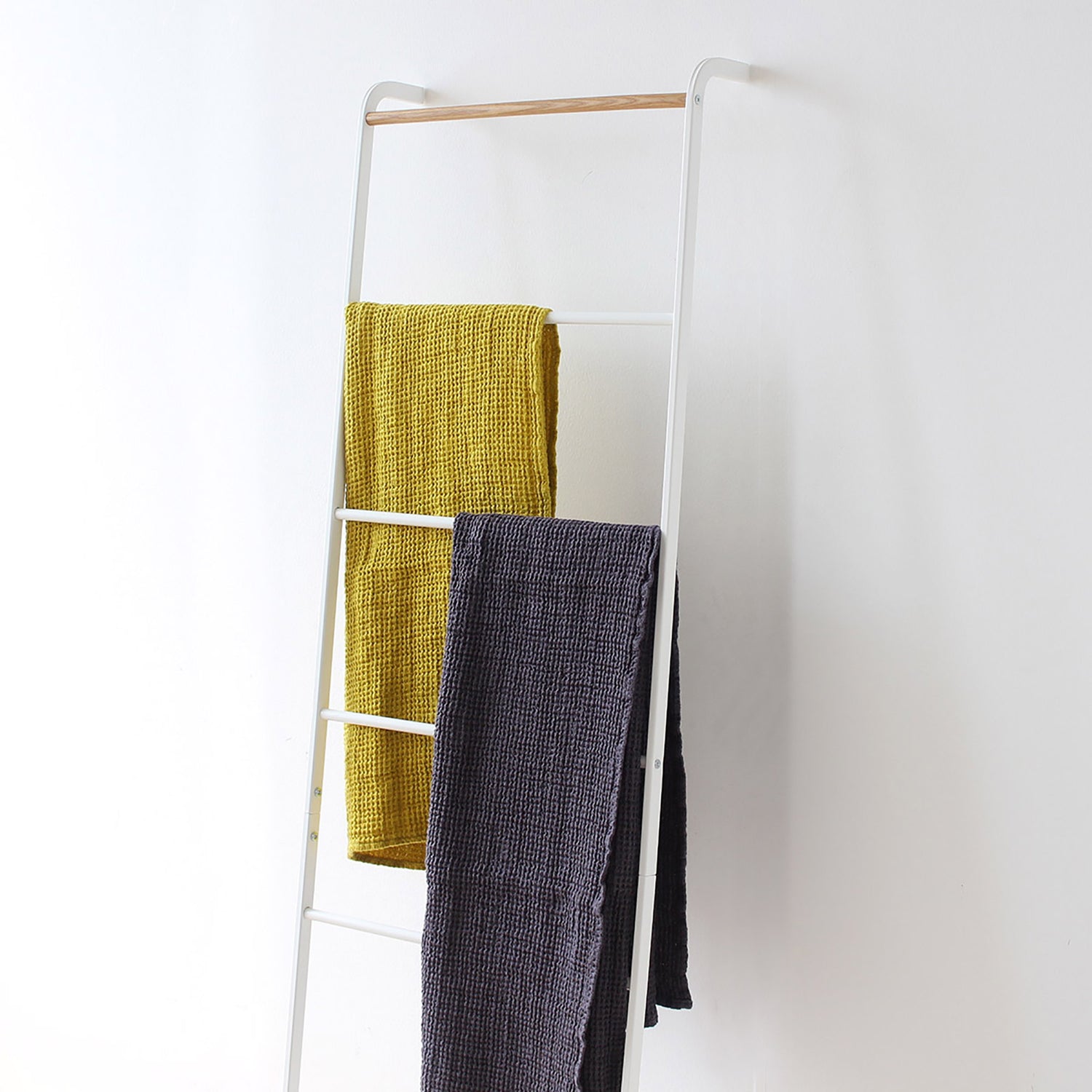 壁に立て掛けるだけでブランケットやバスタオル、洋服やストールなどの収納ができるスチール製のリーニングラダー。ツヤを抑えたマットな質感のフレームに、トップのバーのみ天然木の組み合わせが全体のアクセントに。優しい印象で、どんな空間にもすんなりと馴染みます。 リビングやベッドルーム、バスルームやエントランスといった室内のあらゆるスペースで活躍してくれるストレージアイテムです。