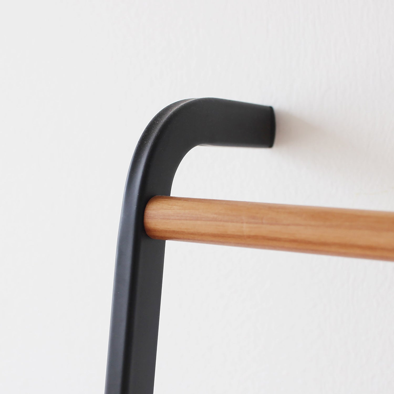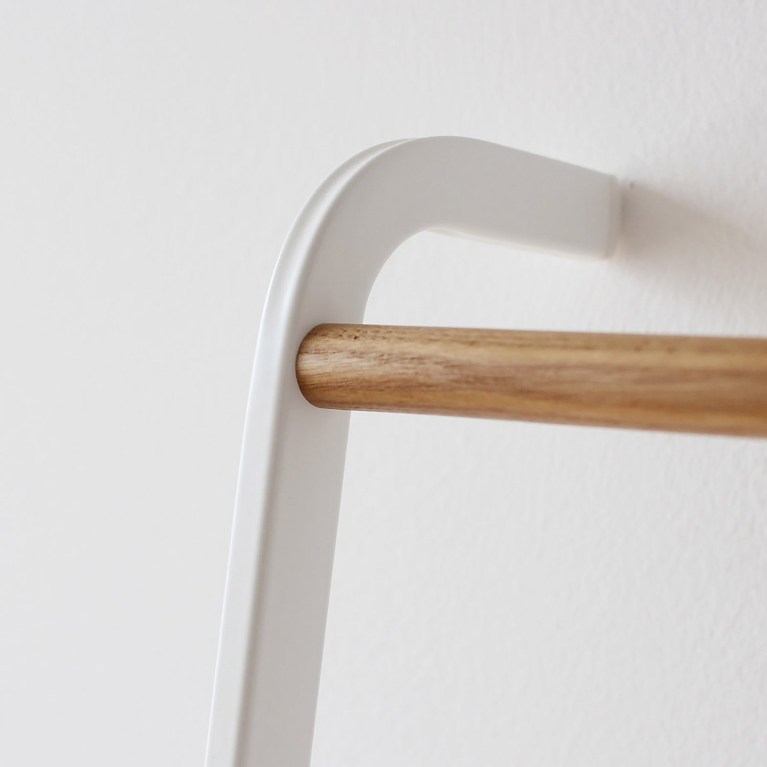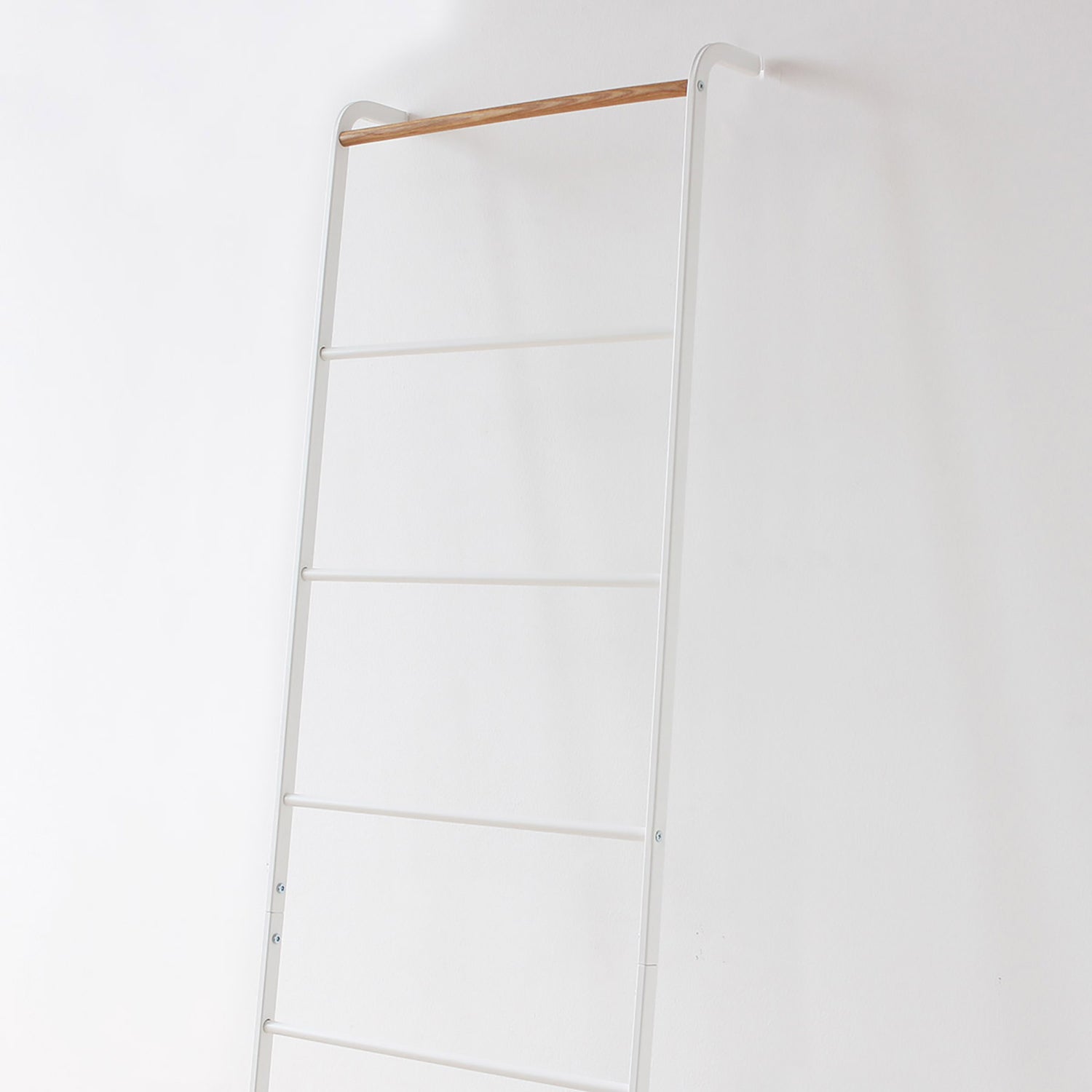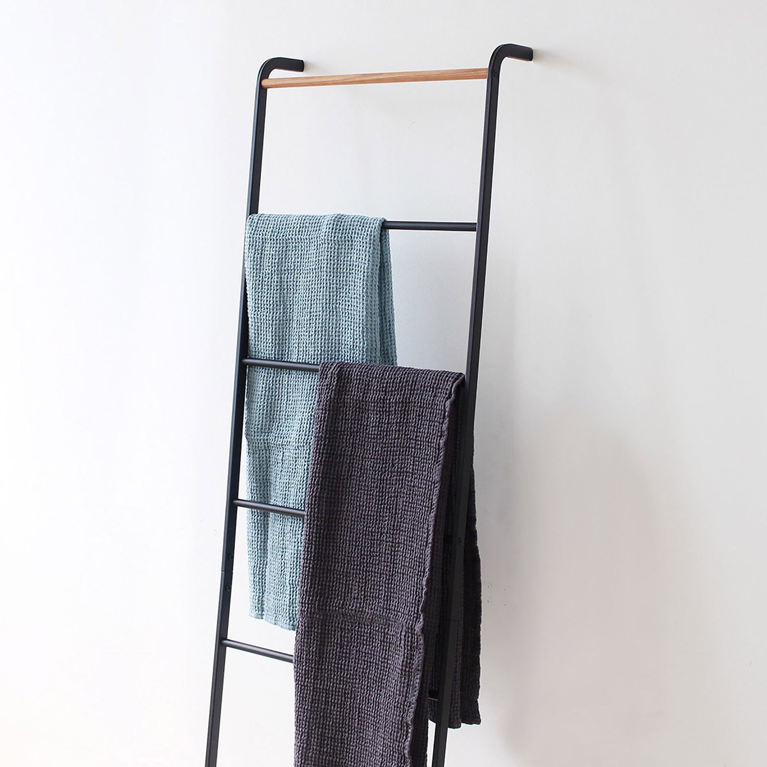 壁に立て掛けるだけでブランケットやバスタオル、洋服やストールなどの収納ができるスチール製のリーニングラダー。ツヤを抑えたマットな質感のフレームに、トップのバーのみ天然木の組み合わせが全体のアクセントに。優しい印象で、どんな空間にもすんなりと馴染みます。 リビングやベッドルーム、バスルームやエントランスといった室内のあらゆるスペースで活躍してくれるストレージアイテムです。