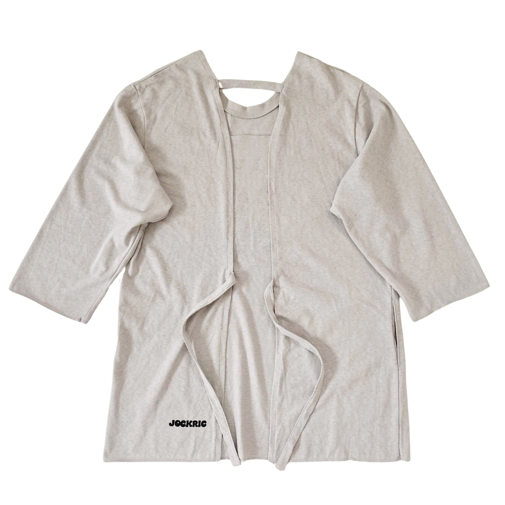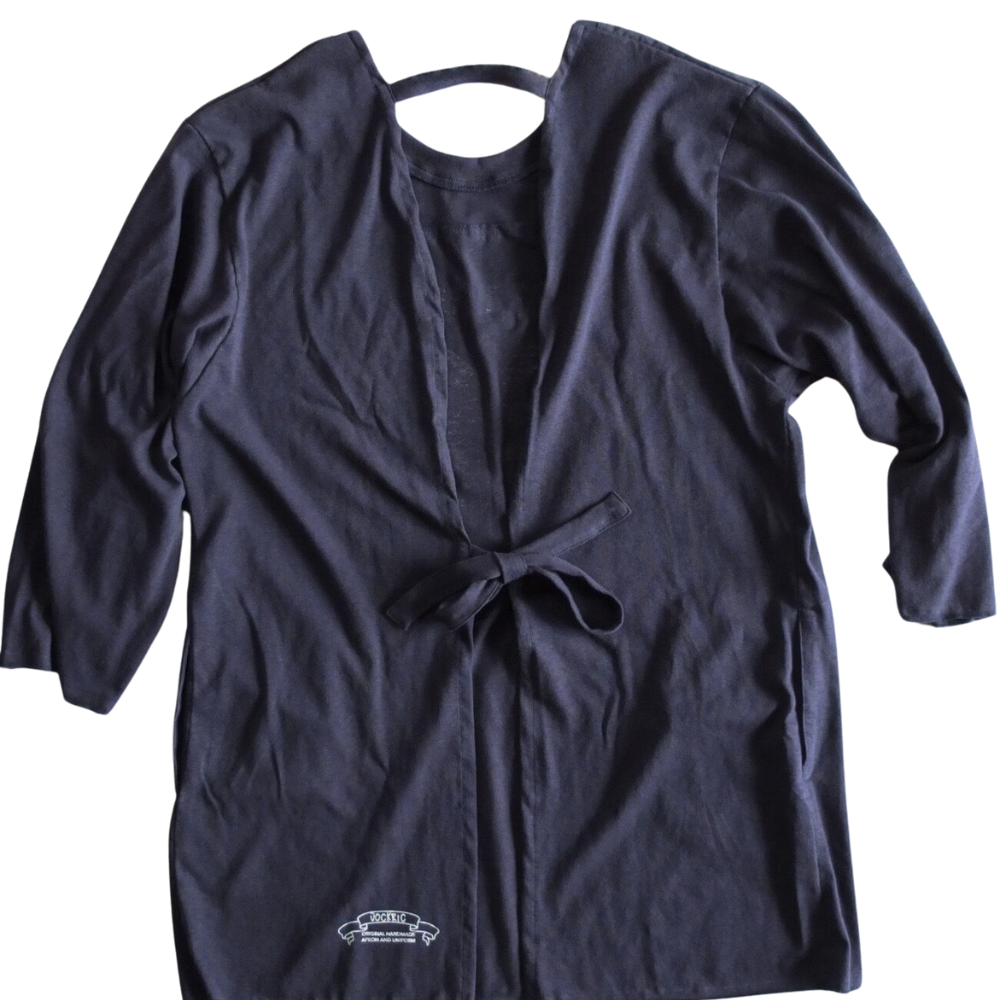 袖口のゴムを無くして切りっぱなし加工にしました。着心地の良いカットソー地で、左右の脇にはポケットも付いています。ガーデニング、日曜大工、料理、キャンプ、ハイキング、川遊びなど、様々なシチュエーションでご利用ください。割烹着なので背中が開いていて涼しいので長時間の作業でも熱が篭らず快適です。もちろん街着として着たままで買い物などお出かけしても大丈夫です。ぜひ日常着としてもご利用ください。ポケット/サイド×2