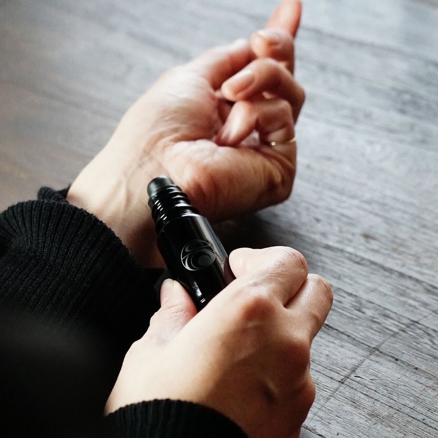 ロールオンアロマのベースオイルは、肌への親和性が高いホホバオイルのほか、椿オイルを配合 椿オイルもまた、人の皮脂に含まれる脂肪酸を多く含み、古くから髪や頭皮、肌の手入れに用いられてきたオイルであり、香りを楽しみながらケアに取り入れても。