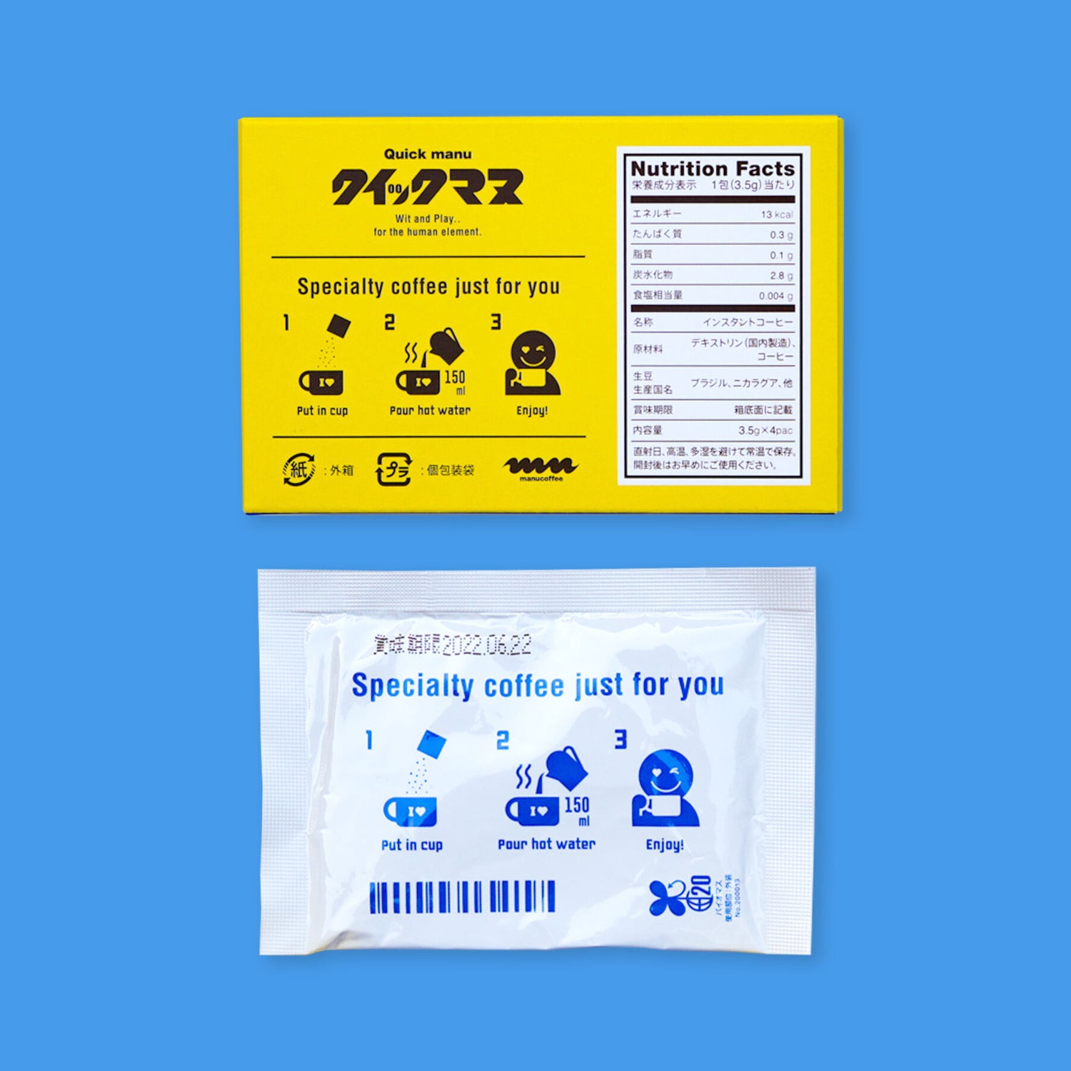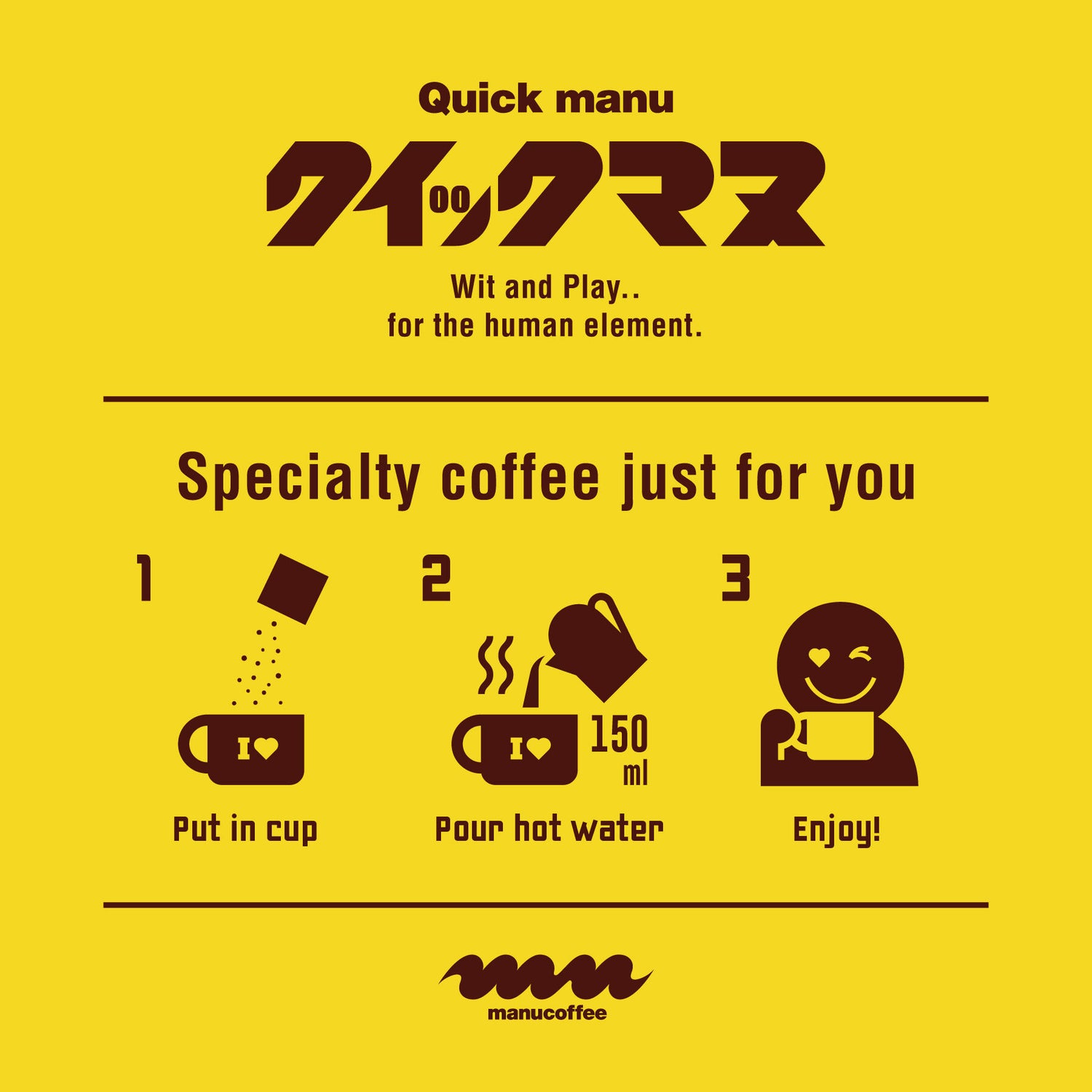 「クイックマヌ」はお湯を注ぐだけでスペシャルティコーヒーを味わえるインスタントコーヒー。いつものクジラブレンドの味が、簡単に、そして素早く(クイックに)楽しめます。1箱に4pac(4杯分)入り。