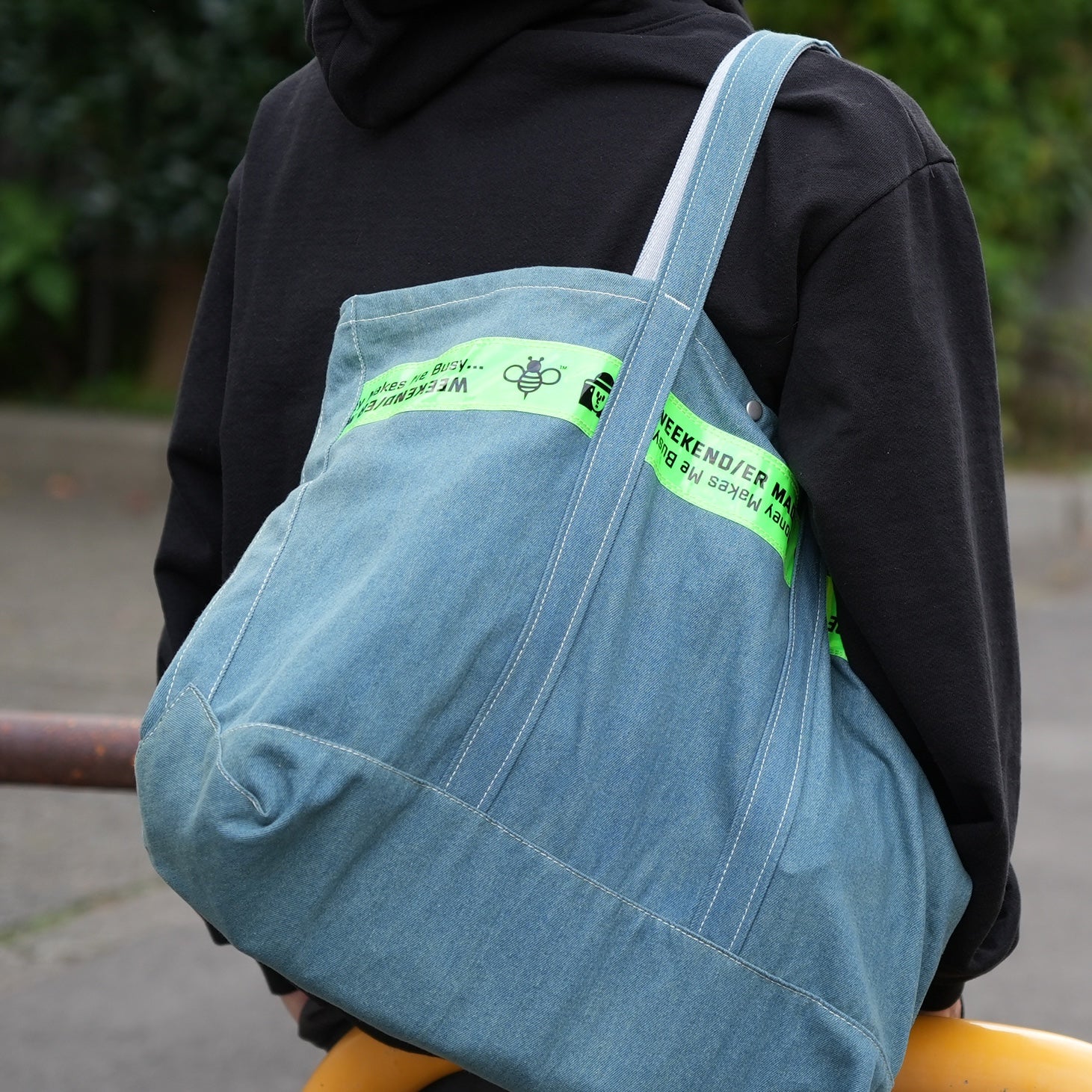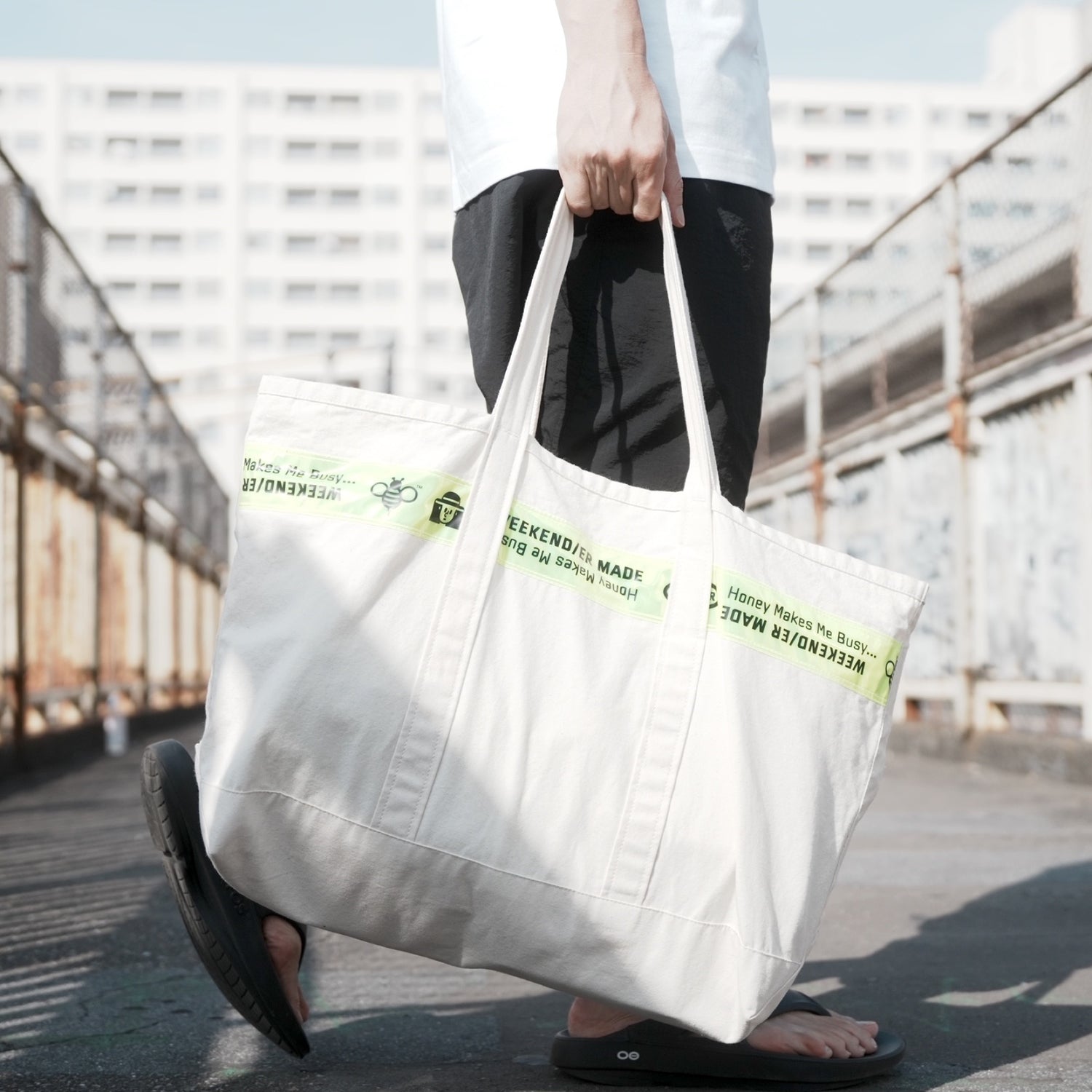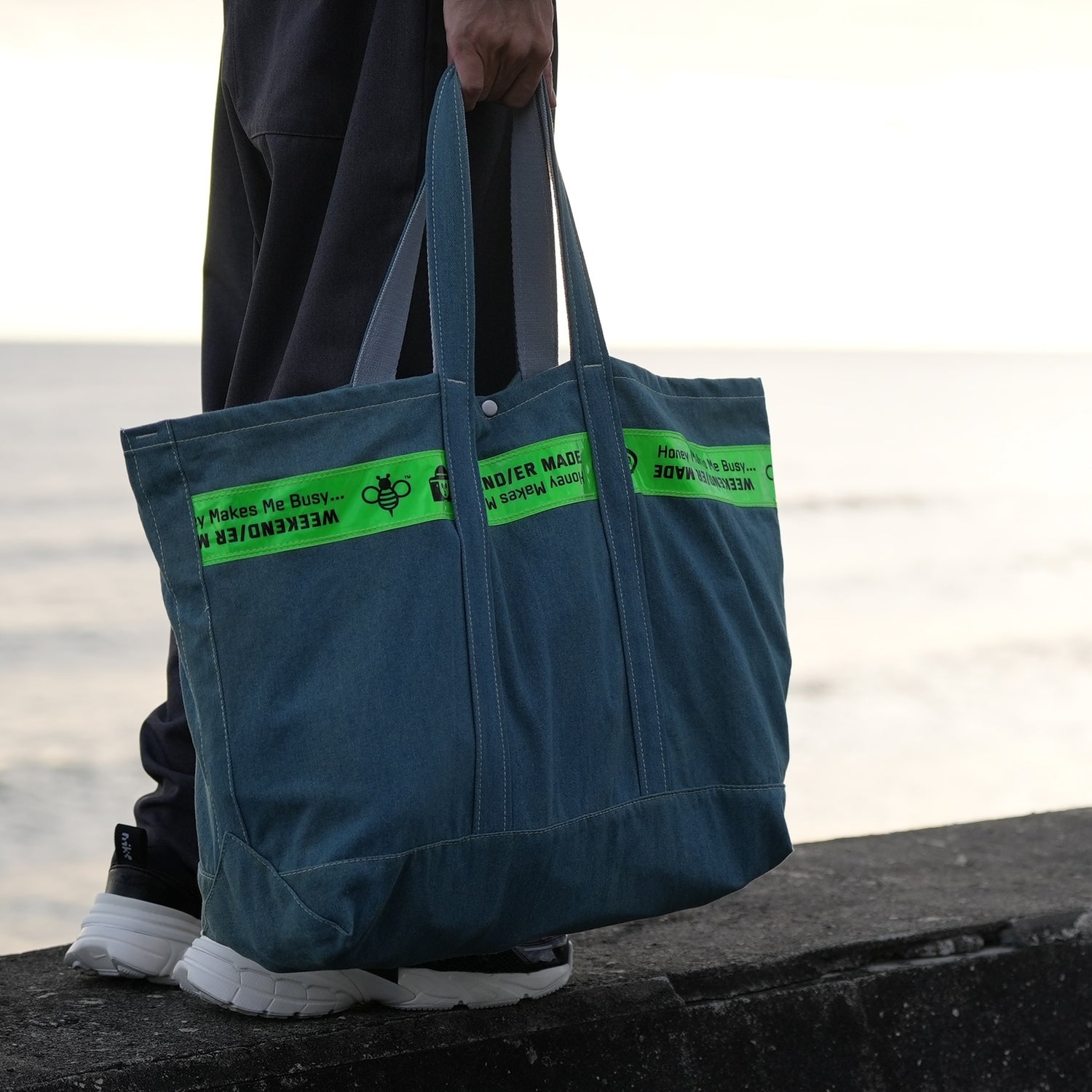 HATCHオリジナルブブランド【Honey Makes Me Busy … 】のトートバッグ。HATCH限定商品です。内ポケットはPCを完全に守るものではありません。デニムはボタン付き。