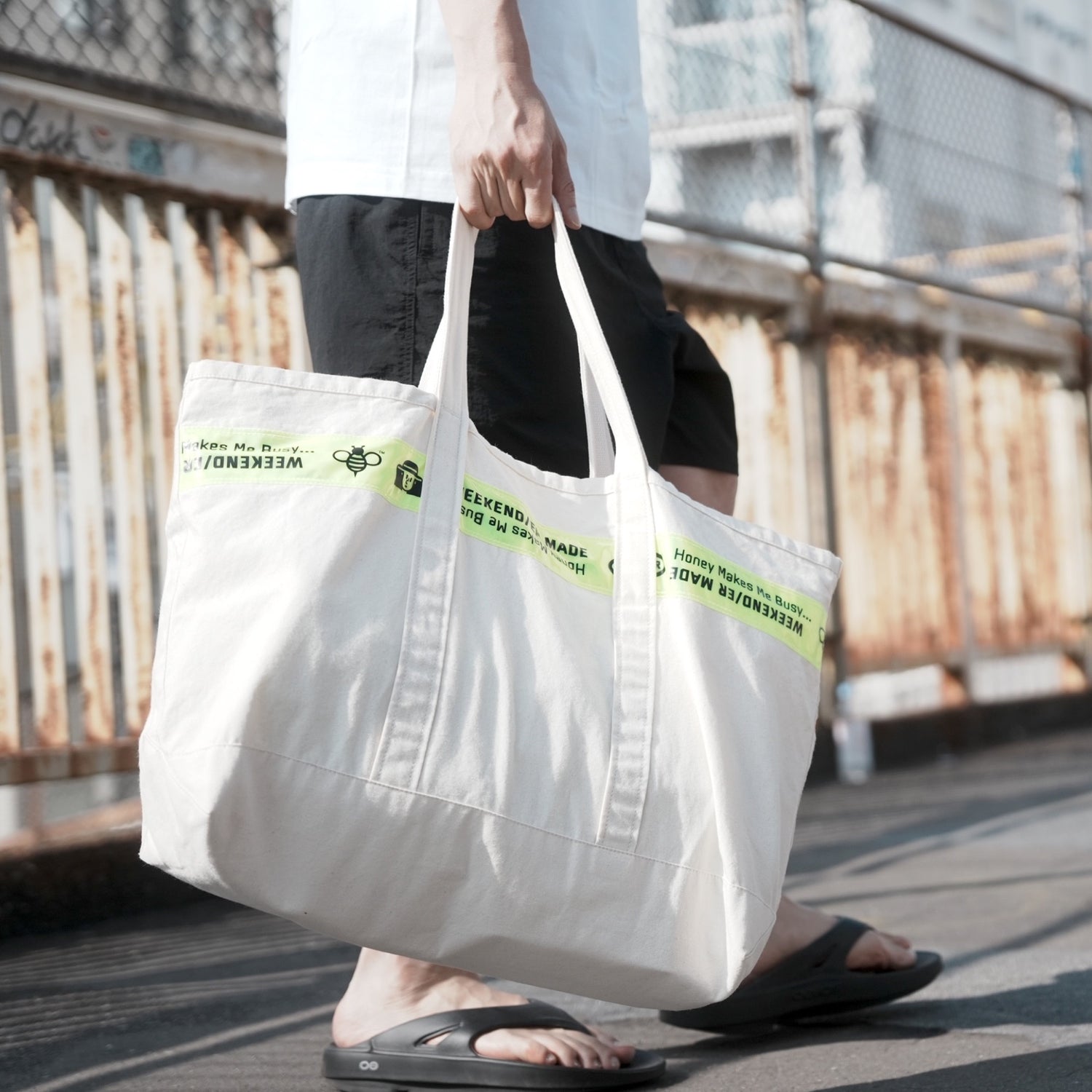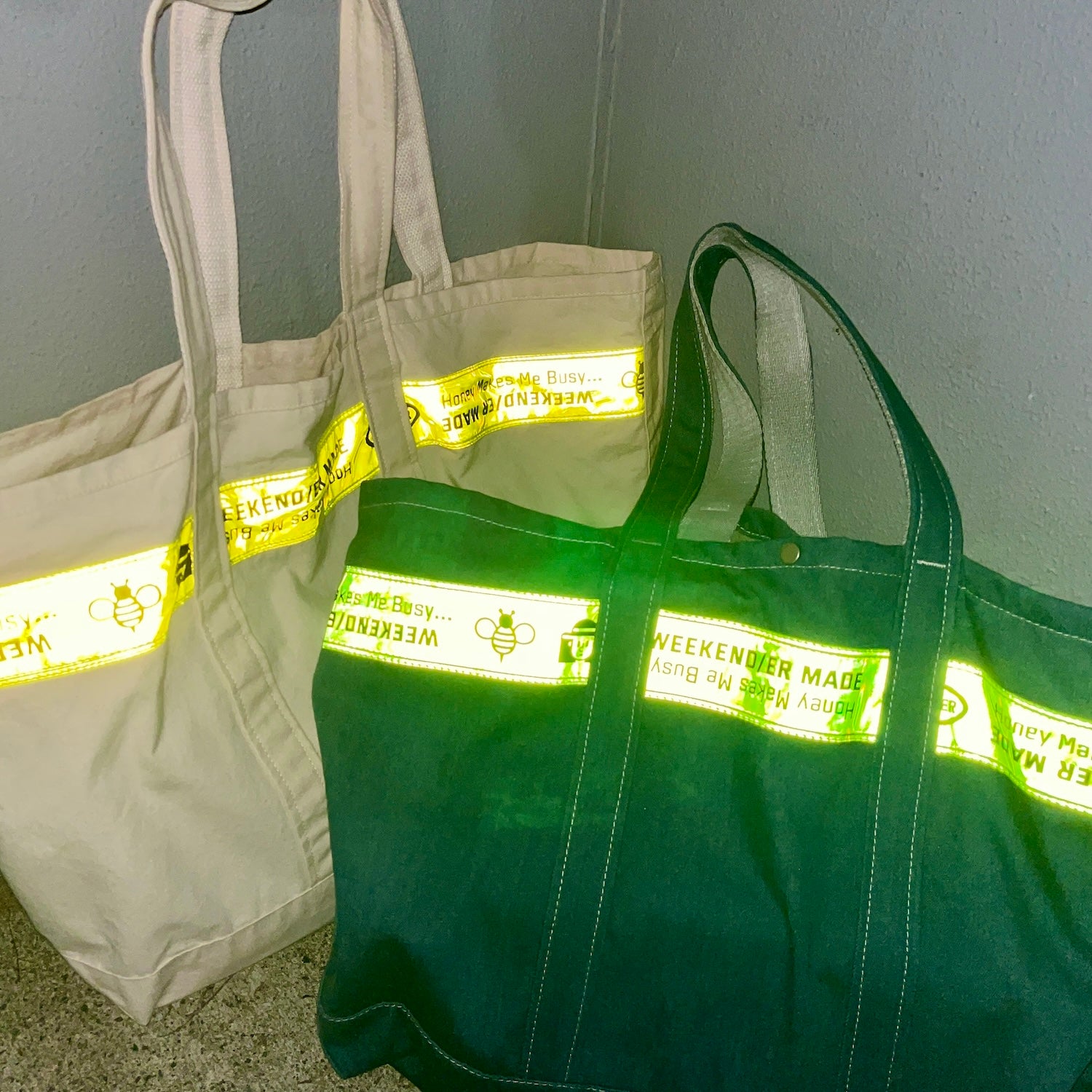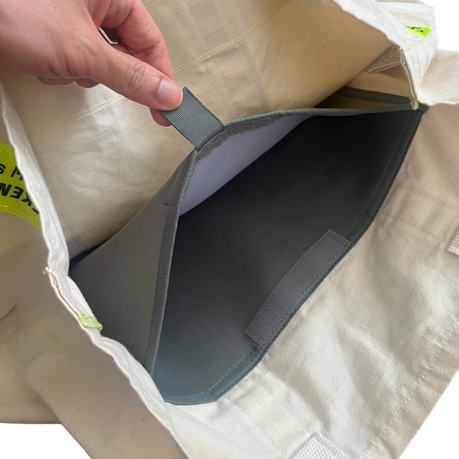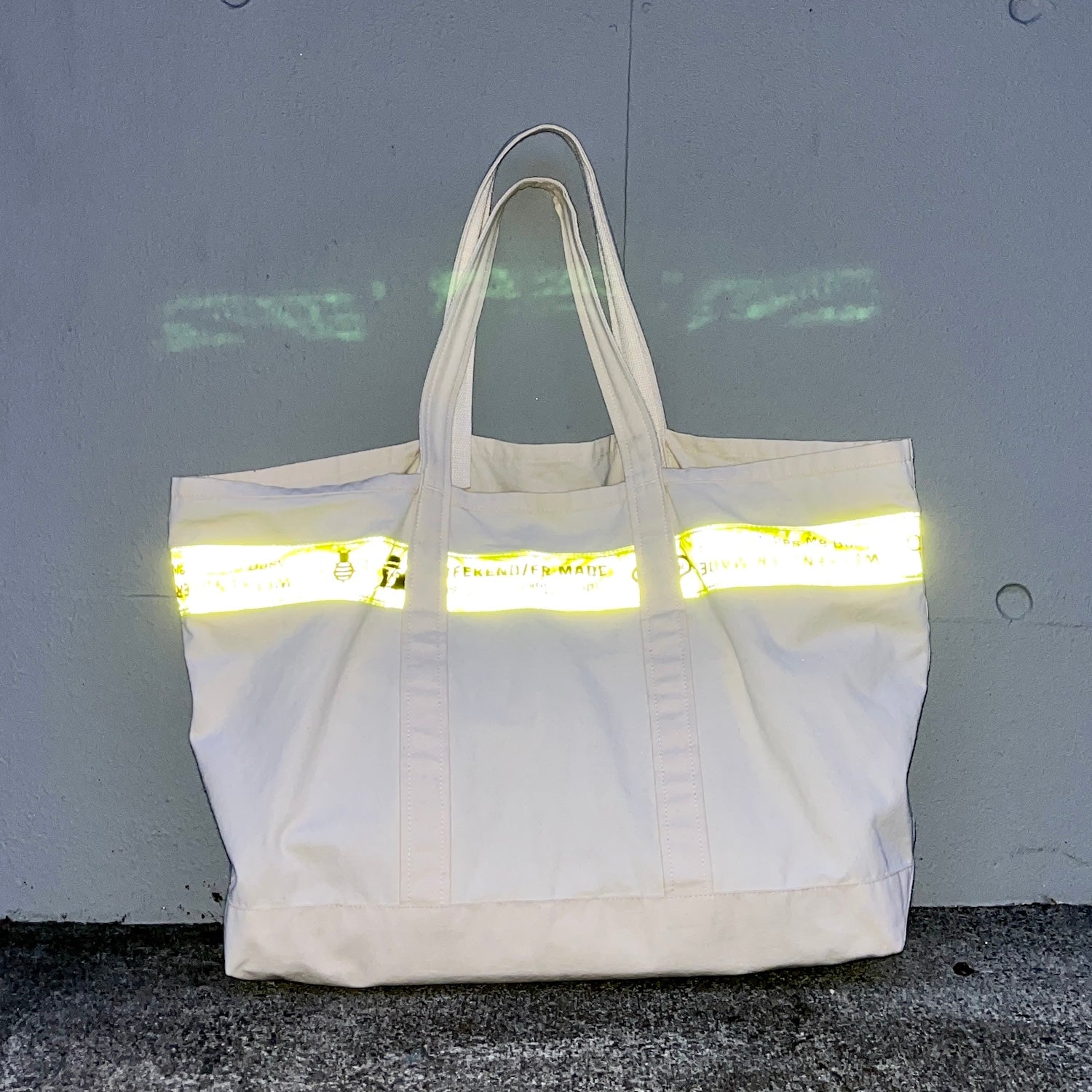 トート好きに応えるためにつくった1枚。シンプルだけど、ありそうでなかったデザイン。軽量オンスのコットン帆布に、リフレクターテープを大胆に組み合わせた、ミスマッチな素材使いが新しいトートバッグです。サイズ感はたっぷり大容量。仕事帰りのジムも、2泊くらいの旅行も余裕。内ポケットには、ウェットスーツのような合成ゴム素材を採用。タブレットやPCの持ち運びにも安心なつくりにしました。使いやすさも、価格も、しっかり優秀。新しいトートを買っても、結局これが一番使うやつでしょう。