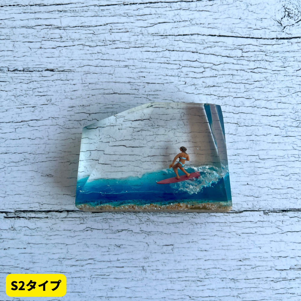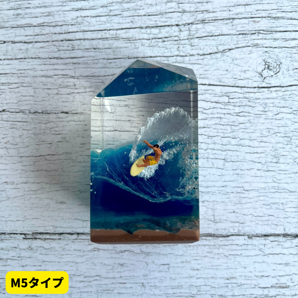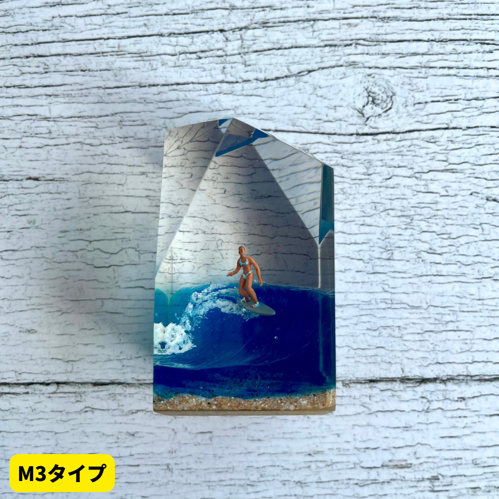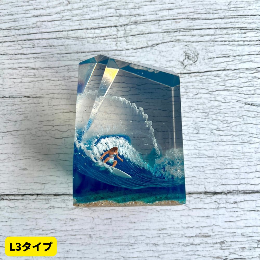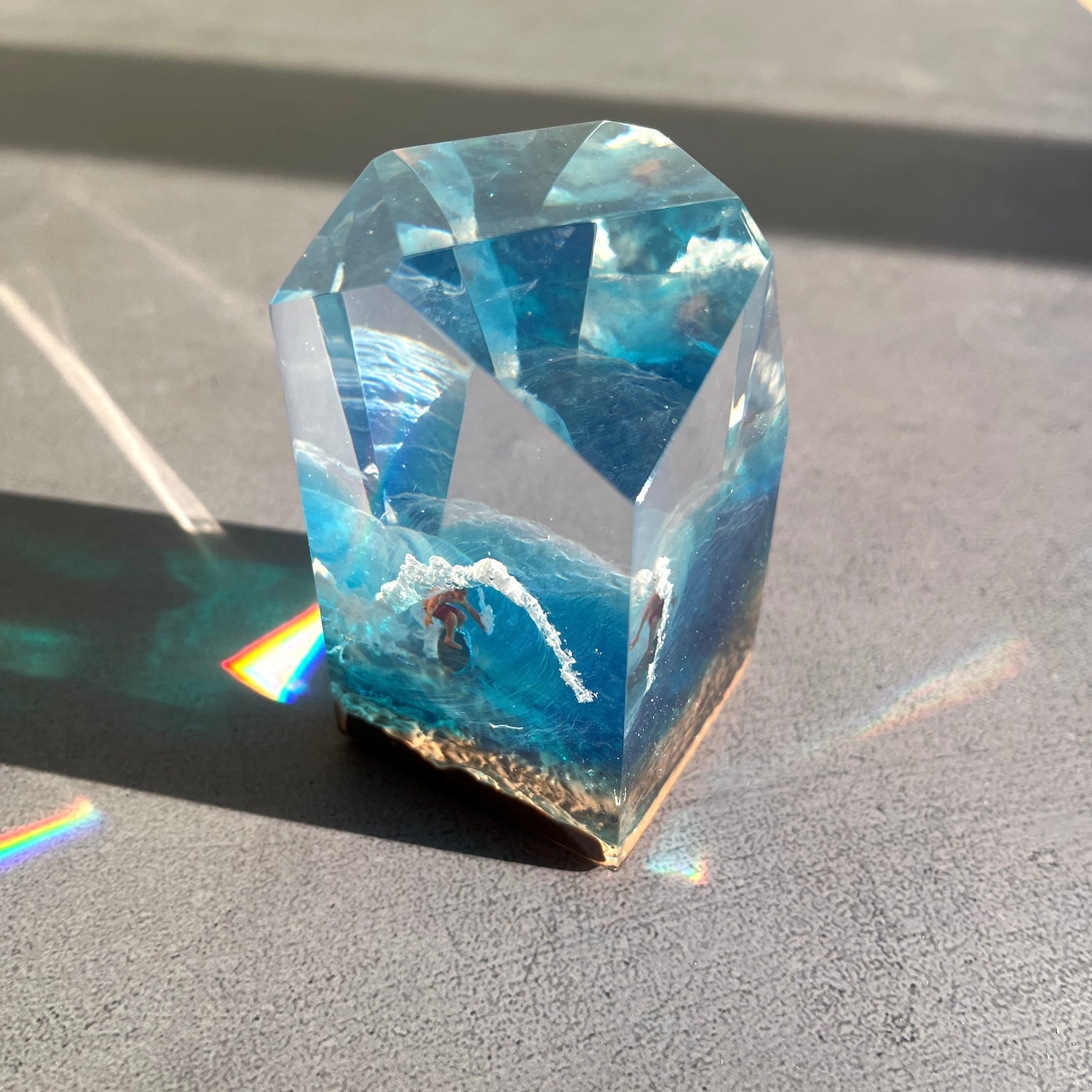 サーファーと板と波が一体となった瞬間を切り取り、ブレイクする波、さまざまな形の板、 サーファーのスタイル、ライダーの精神が表現される波上でのダンスをこの小さな世界で表現 。手に取った人がそこからサーフィンの何かを感じられるよう、1点1点ハンドメイドで丁寧に制作しています。サーファーであれば誰もが持っている波に乗る特別な喜び、その瞬間の感情がクリスタルキューブに閉じ込められています。クリスタルキューブを側に置くことで、様々な感情を無意識に統合することができればミッションは成功です。