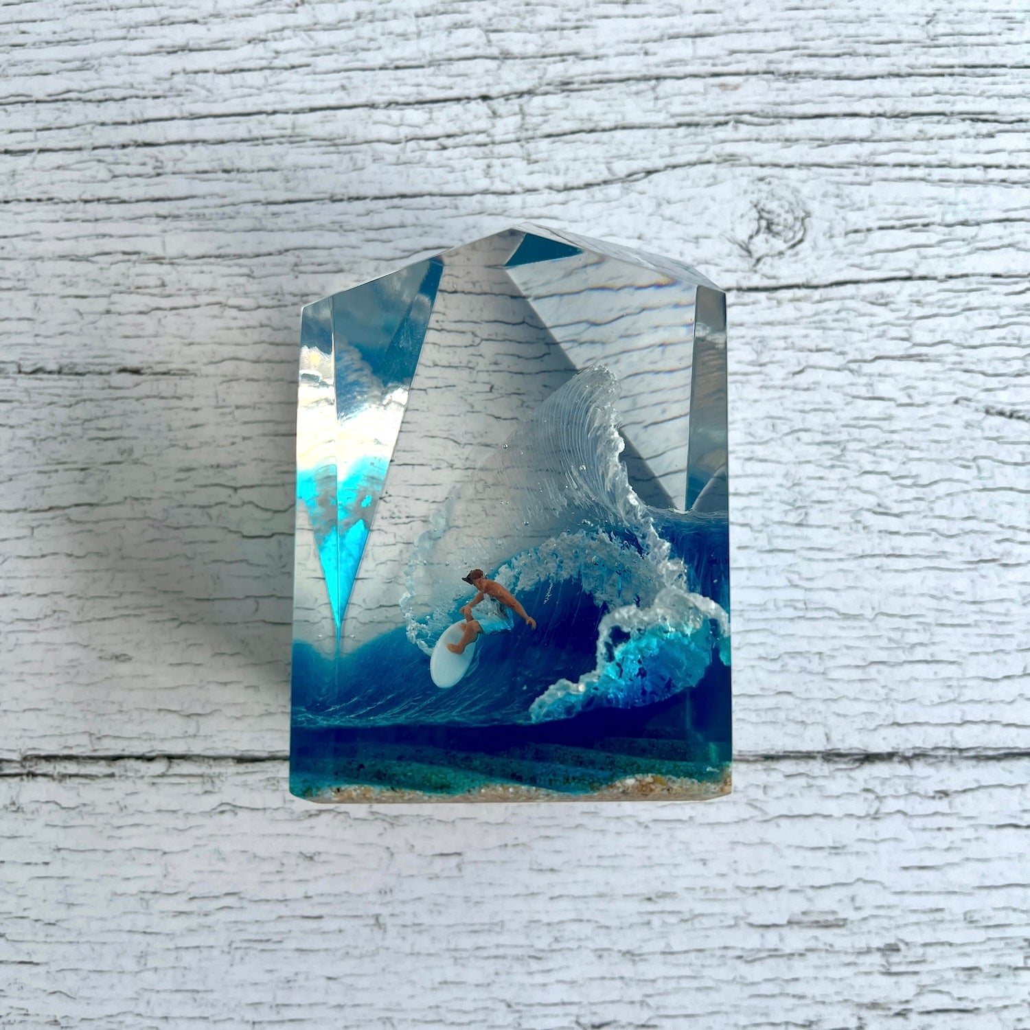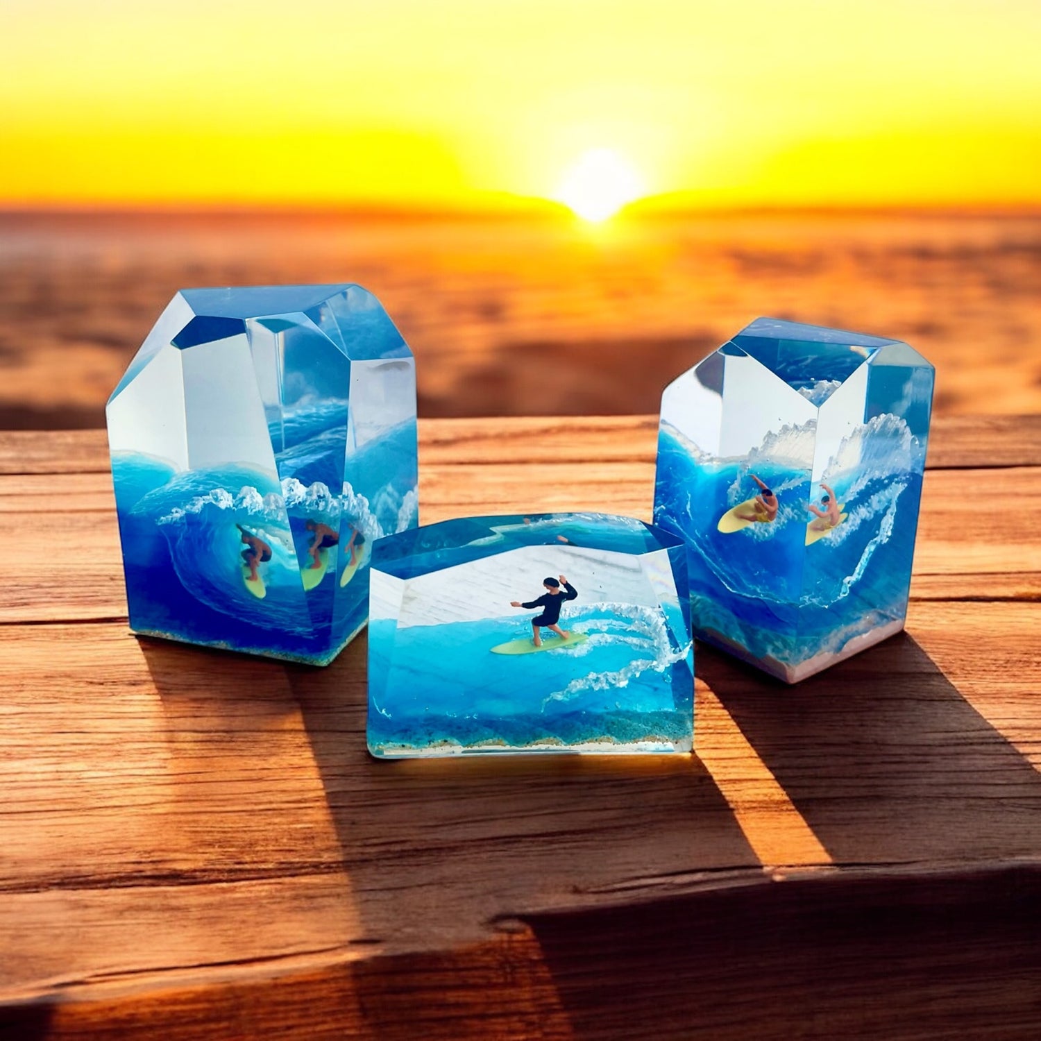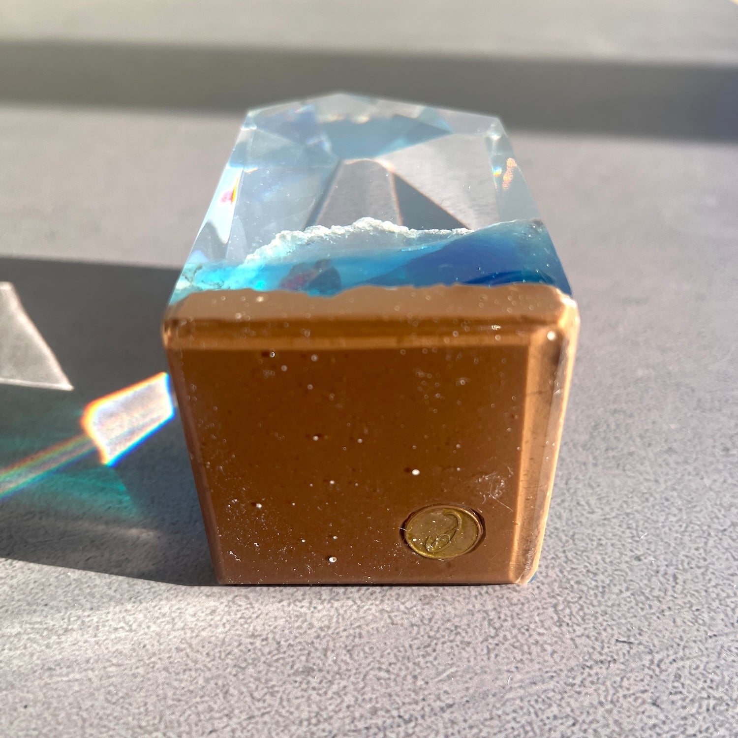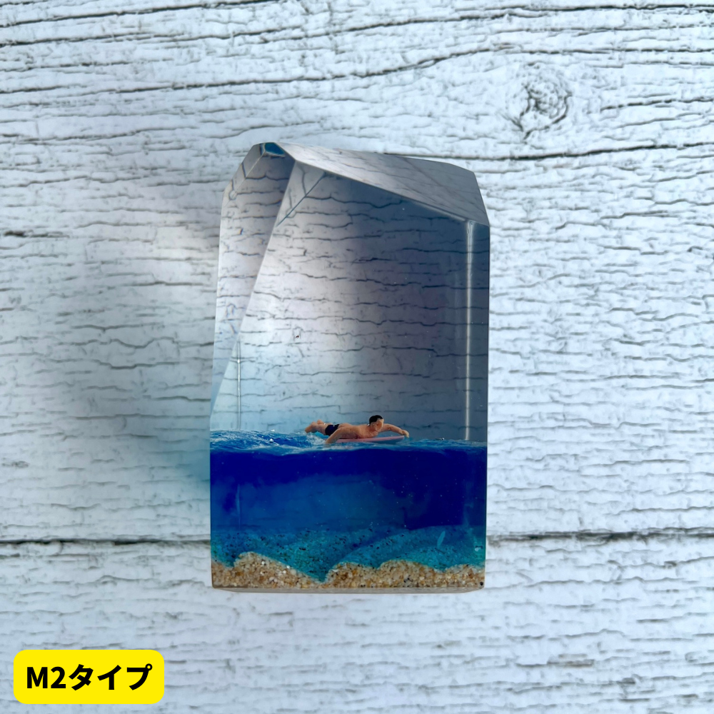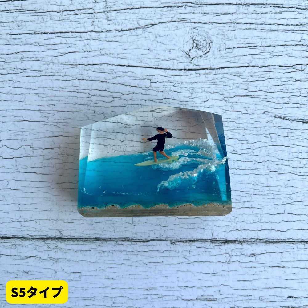 サーファーと板と波が一体となった瞬間を切り取り、ブレイクする波、さまざまな形の板、 サーファーのスタイル、ライダーの精神が表現される波上でのダンスをこの小さな世界で表現 。手に取った人がそこからサーフィンの何かを感じられるよう、1点1点ハンドメイドで丁寧に制作しています。サーファーであれば誰もが持っている波に乗る特別な喜び、その瞬間の感情がクリスタルキューブに閉じ込められています。クリスタルキューブを側に置くことで、様々な感情を無意識に統合することができればミッションは成功です。