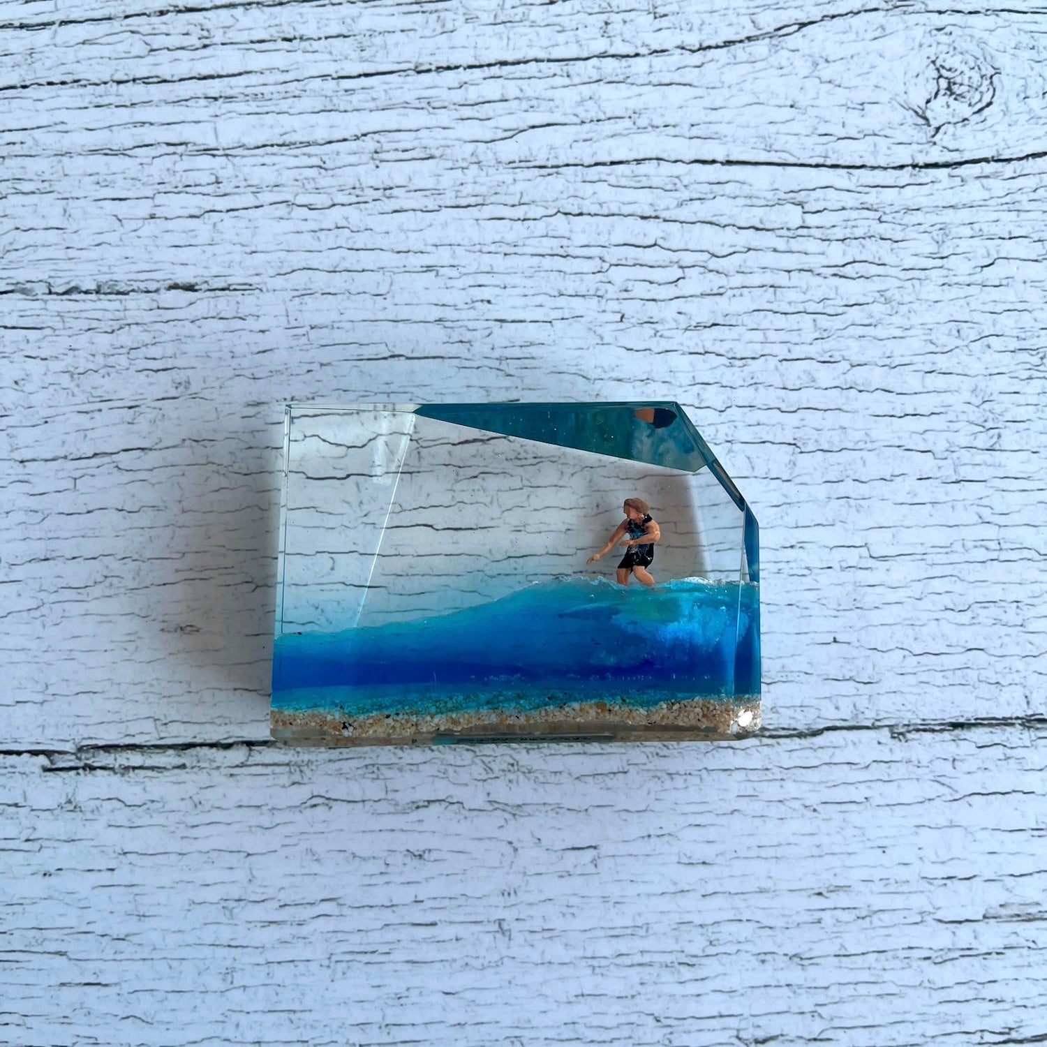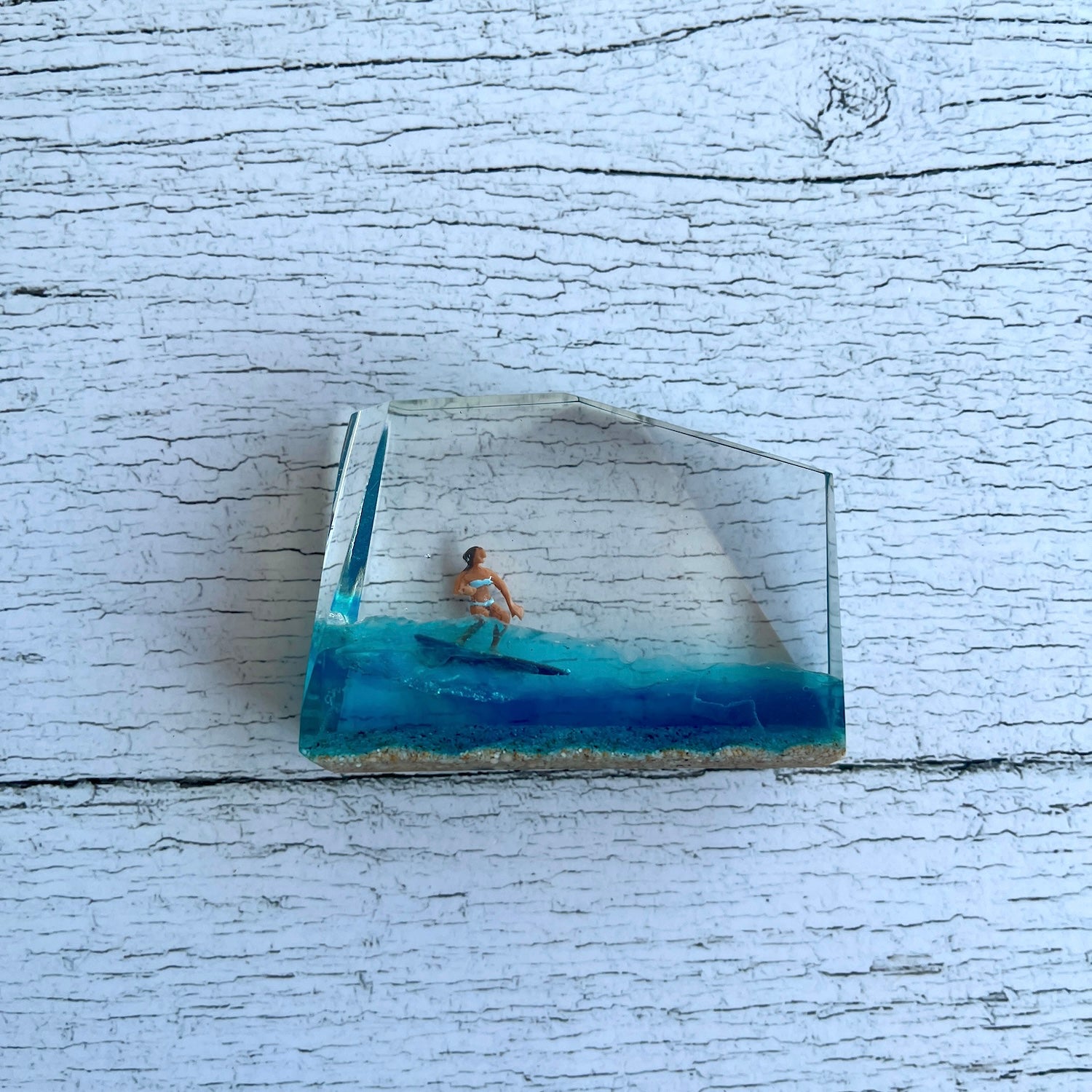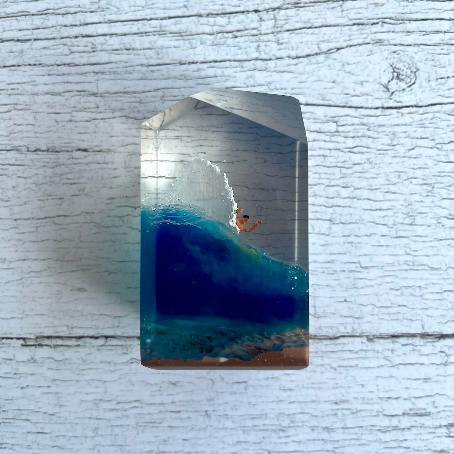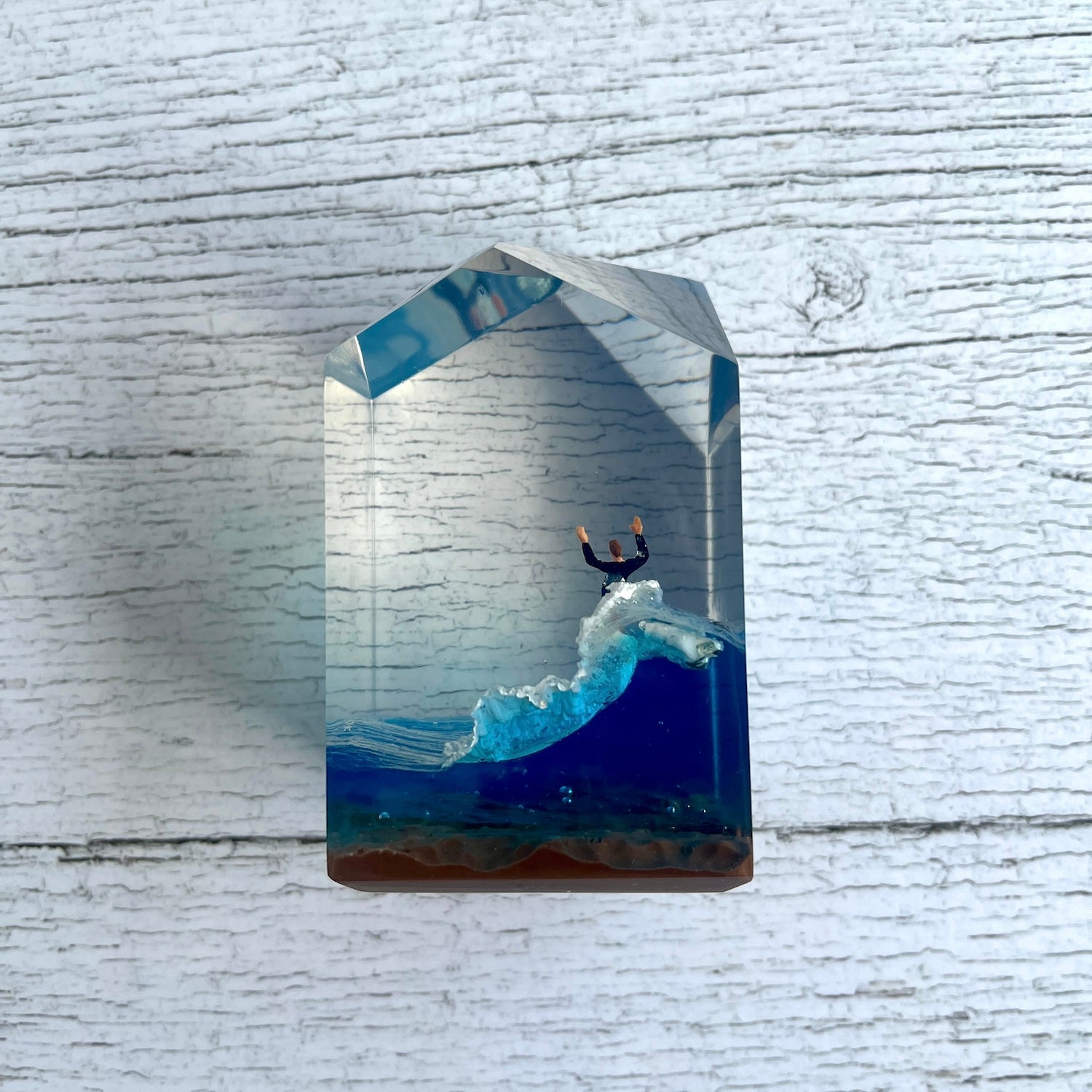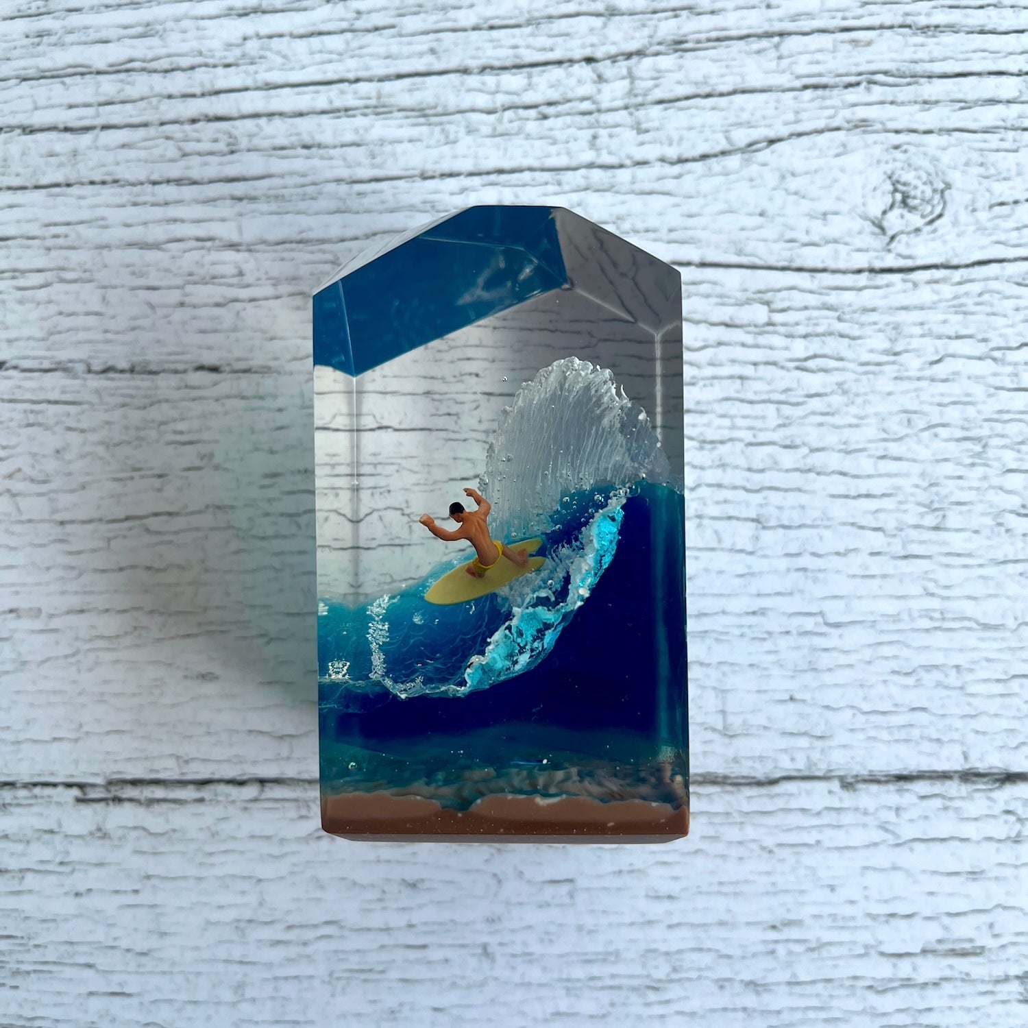 サーファーと板と波が一体となった瞬間を切り取り、ブレイクする波、さまざまな形の板、 サーファーのスタイル、ライダーの精神が表現される波上でのダンスをこの小さな世界で表現 。手に取った人がそこからサーフィンの何かを感じられるよう、1点1点ハンドメイドで丁寧に制作しています。サーファーであれば誰もが持っている波に乗る特別な喜び、その瞬間の感情がクリスタルキューブに閉じ込められています。クリスタルキューブを側に置くことで、様々な感情を無意識に統合することができればミッションは成功です。