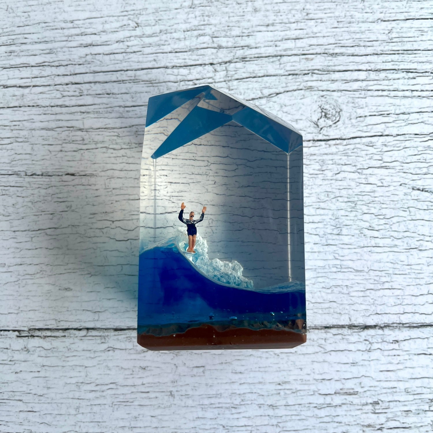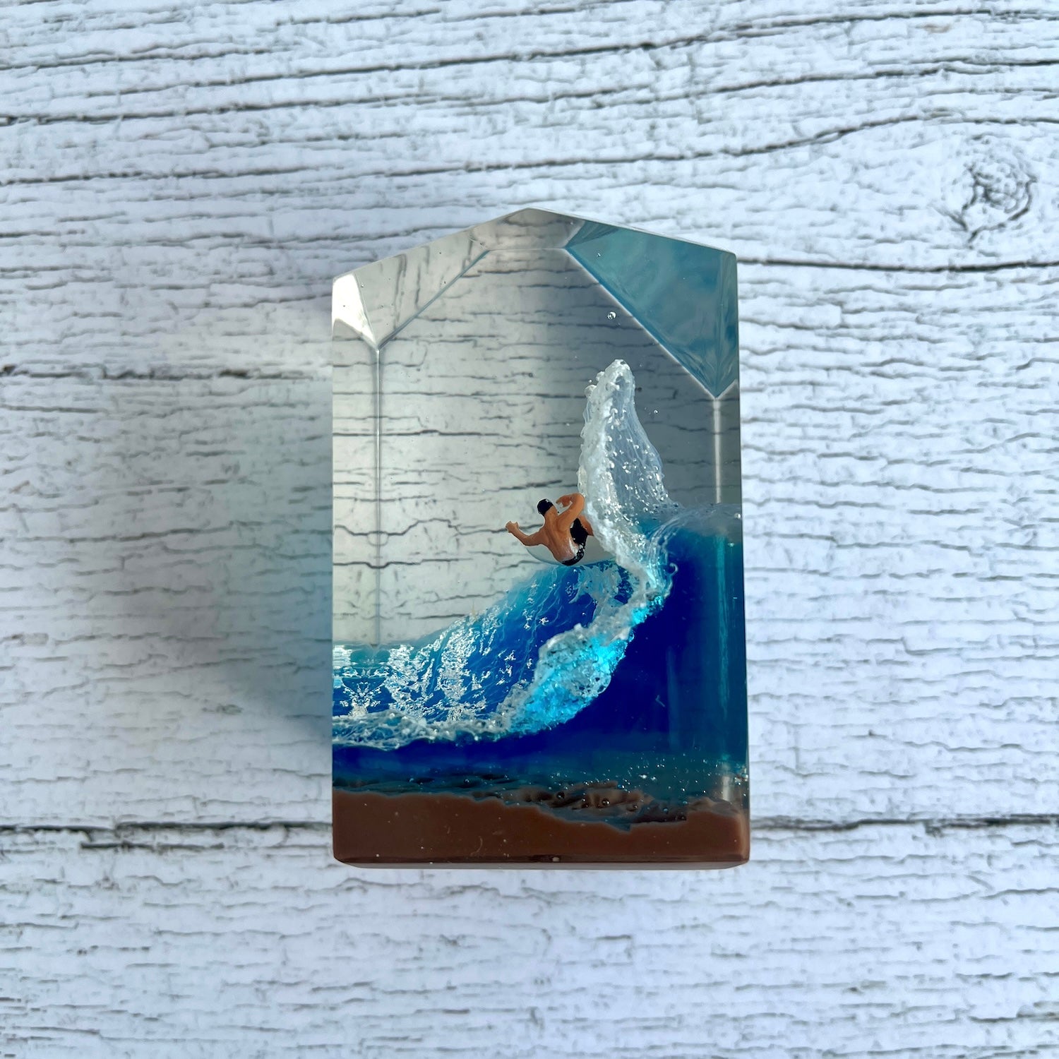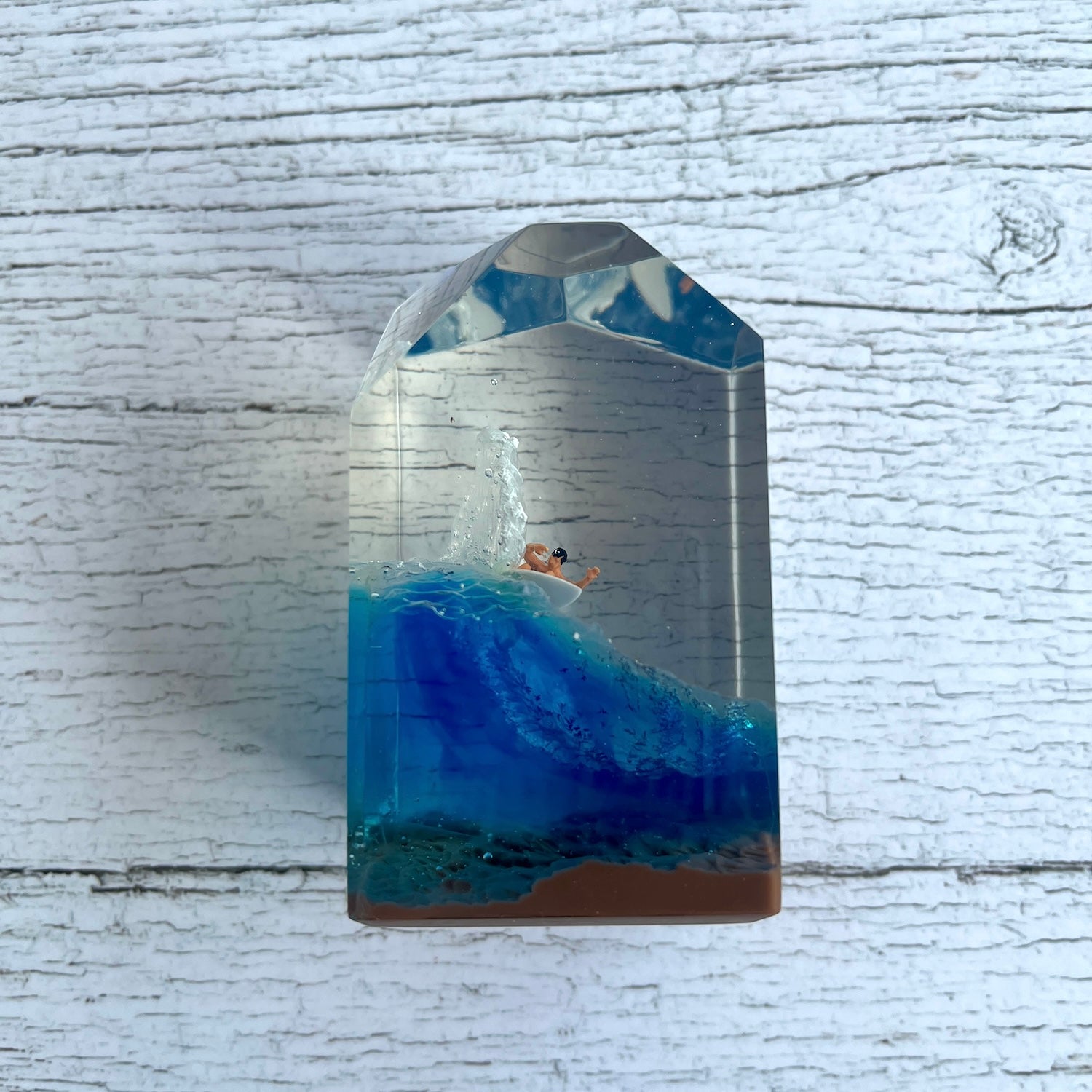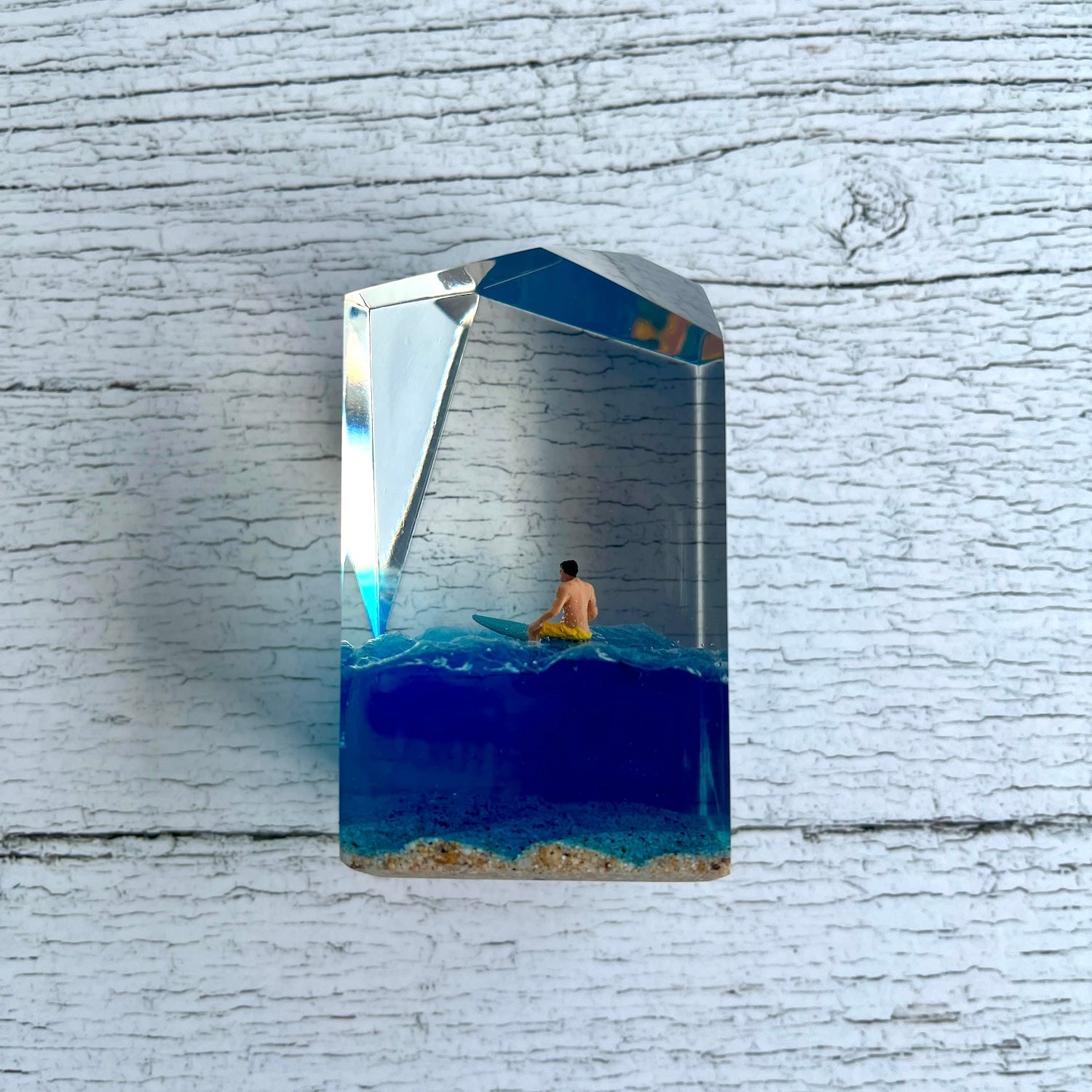 サーファーと板と波が一体となった瞬間を切り取り、ブレイクする波、さまざまな形の板、 サーファーのスタイル、ライダーの精神が表現される波上でのダンスをこの小さな世界で表現 。手に取った人がそこからサーフィンの何かを感じられるよう、1点1点ハンドメイドで丁寧に制作しています。サーファーであれば誰もが持っている波に乗る特別な喜び、その瞬間の感情がクリスタルキューブに閉じ込められています。クリスタルキューブを側に置くことで、様々な感情を無意識に統合することができればミッションは成功です。
