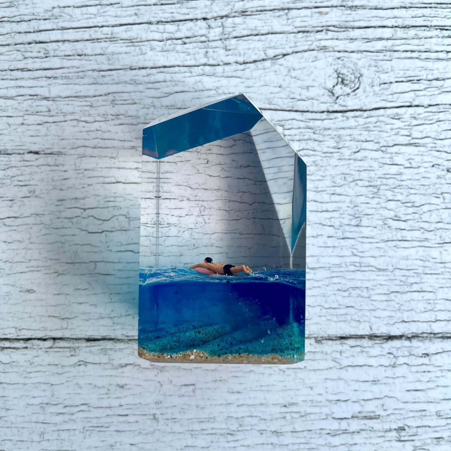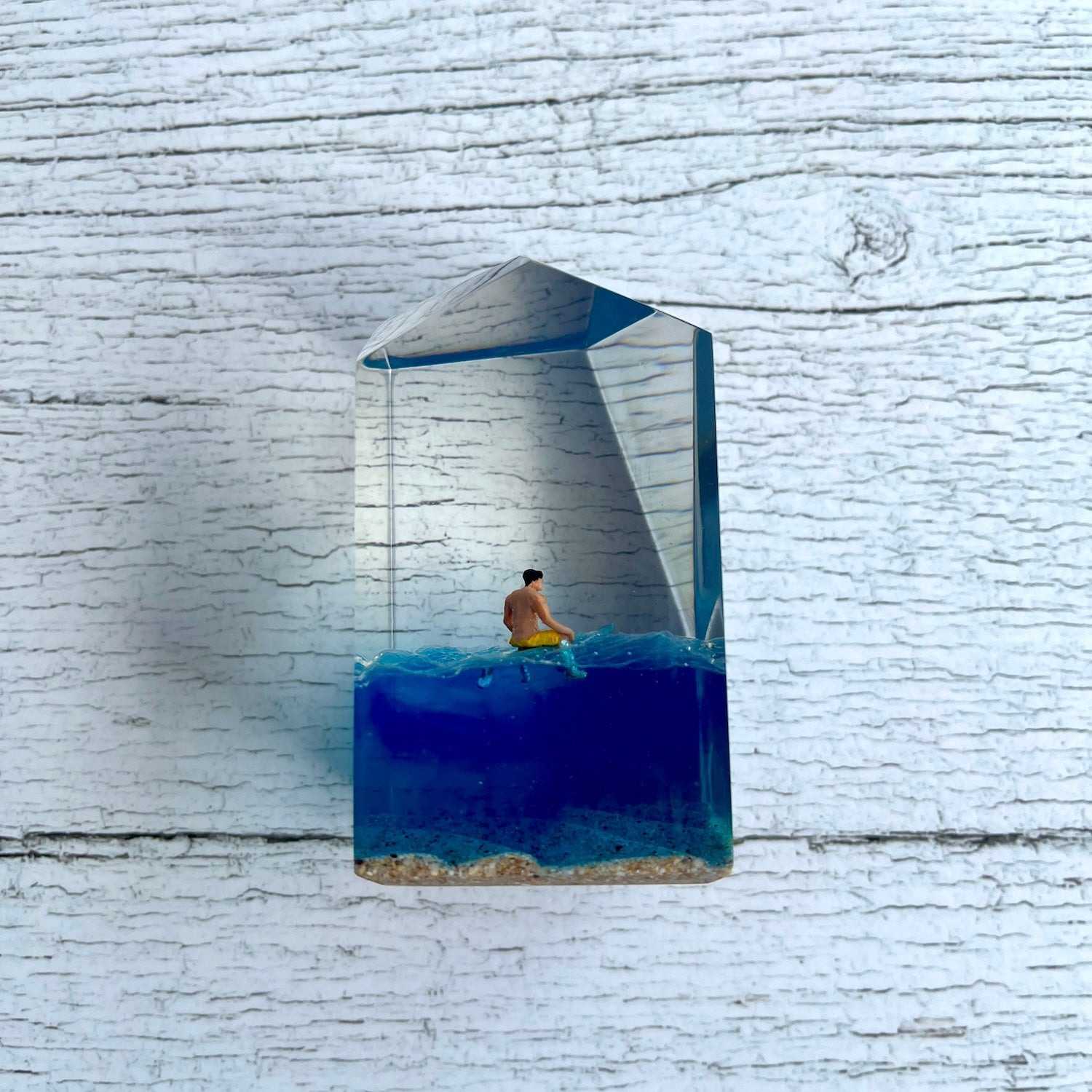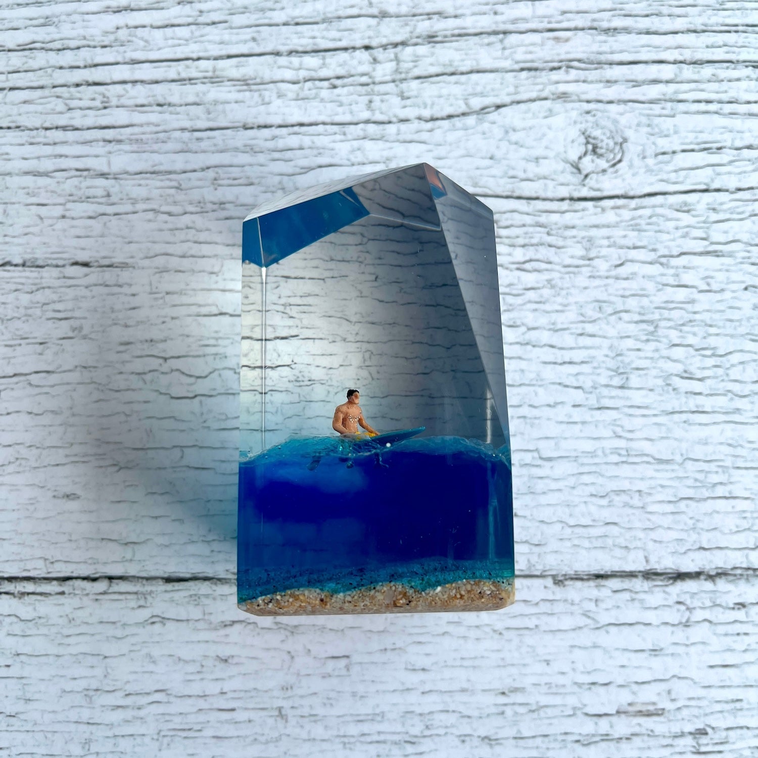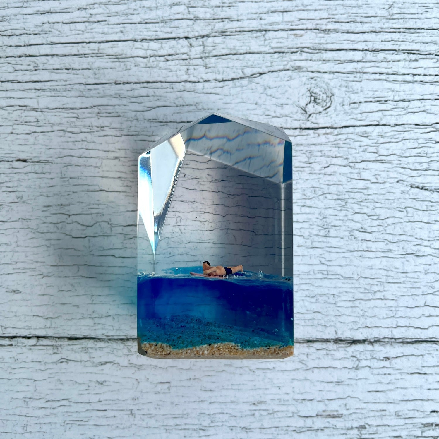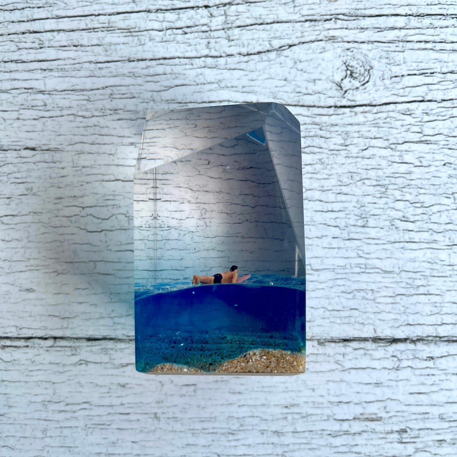 サーファーと板と波が一体となった瞬間を切り取り、ブレイクする波、さまざまな形の板、 サーファーのスタイル、ライダーの精神が表現される波上でのダンスをこの小さな世界で表現 。手に取った人がそこからサーフィンの何かを感じられるよう、1点1点ハンドメイドで丁寧に制作しています。サーファーであれば誰もが持っている波に乗る特別な喜び、その瞬間の感情がクリスタルキューブに閉じ込められています。クリスタルキューブを側に置くことで、様々な感情を無意識に統合することができればミッションは成功です。
