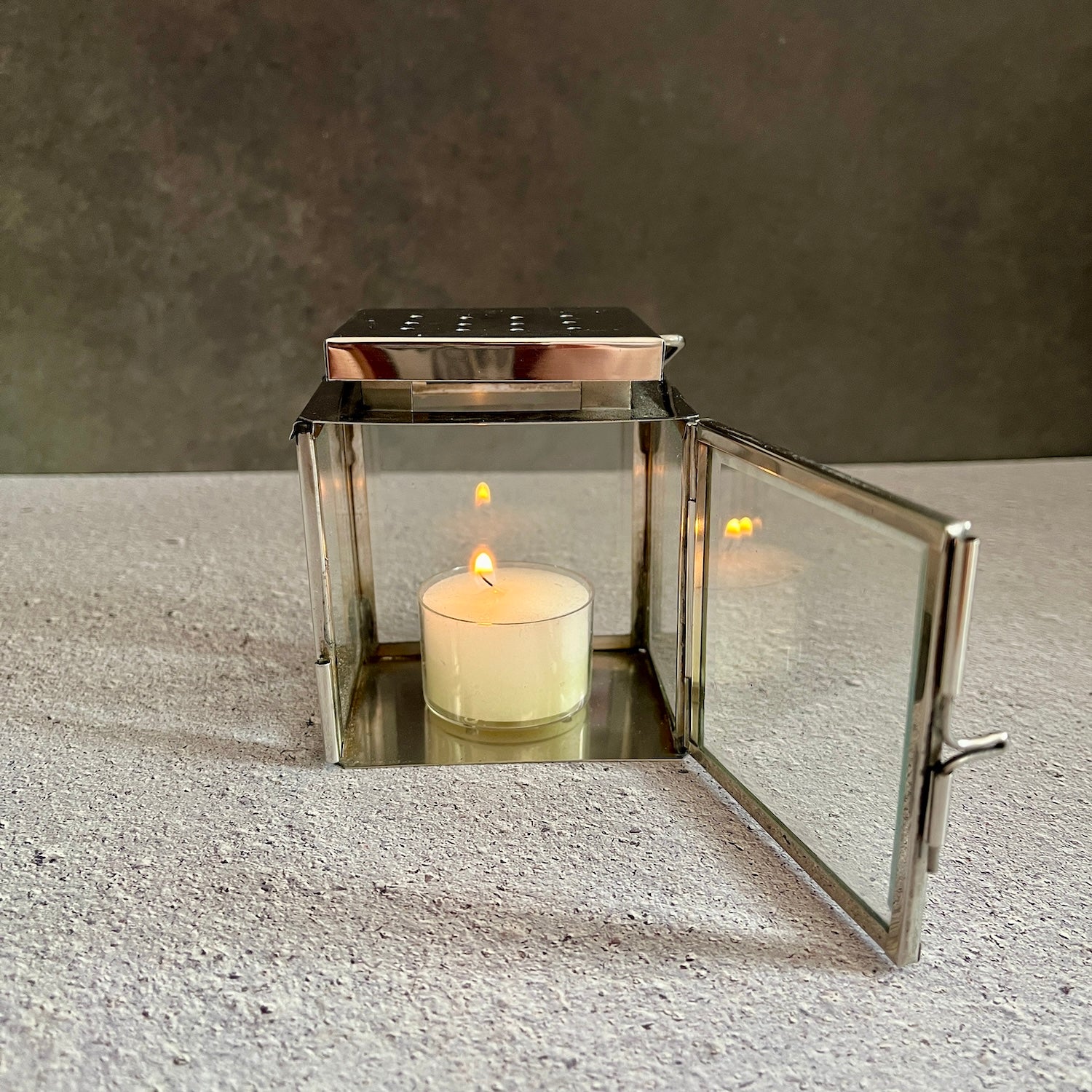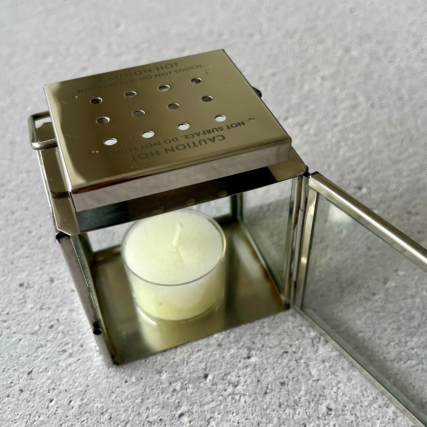 ティーライトキャンドルは付属しておりません。キャンドルの燃焼により本体(特に天面)が非常に熱くなりますので十分にご注意ください。製品の縁(ステンレス部分のエッジ)が鋭利になっております。注意してお取り扱いください。1,2枚目の画像のように持ち手は上がったままは止まりません。