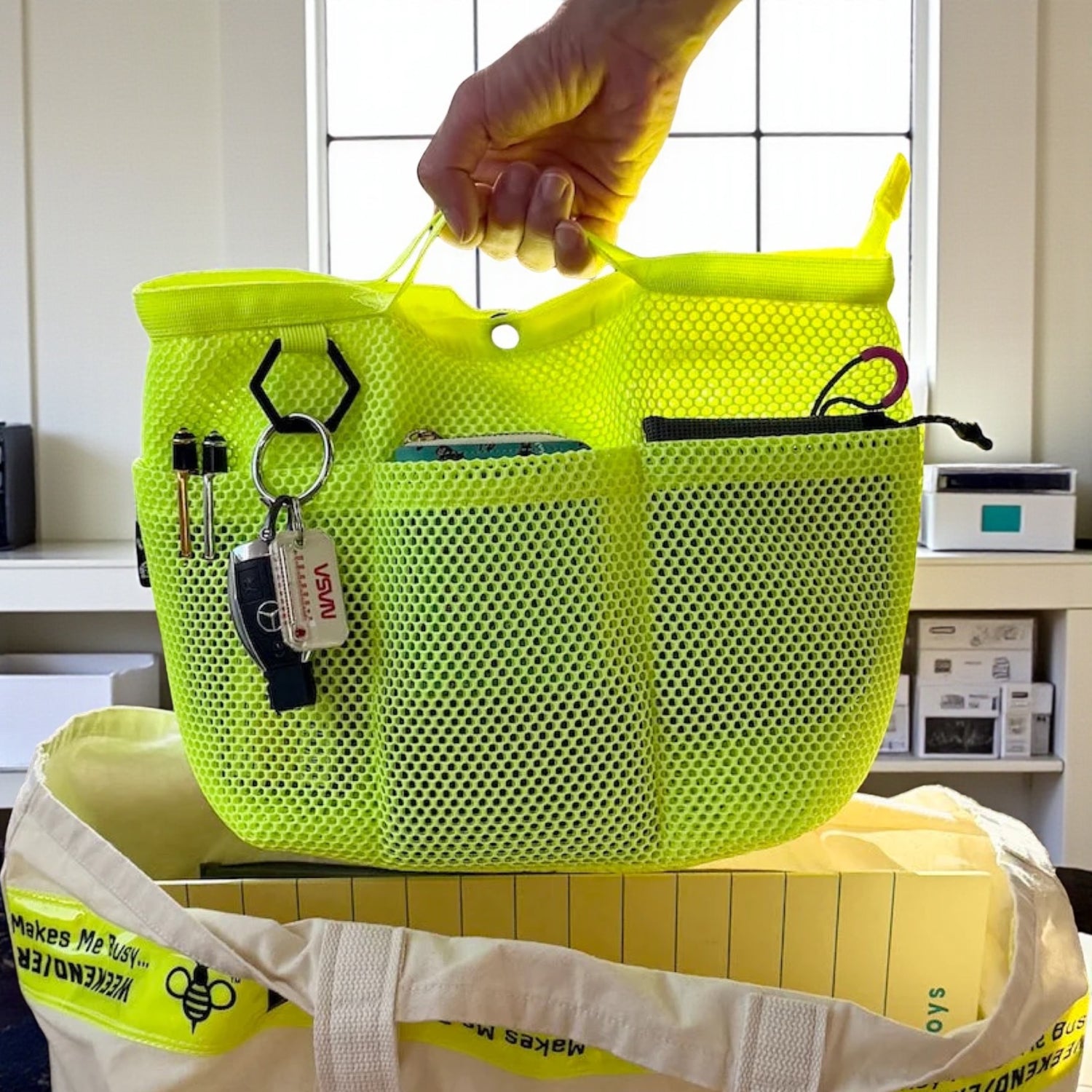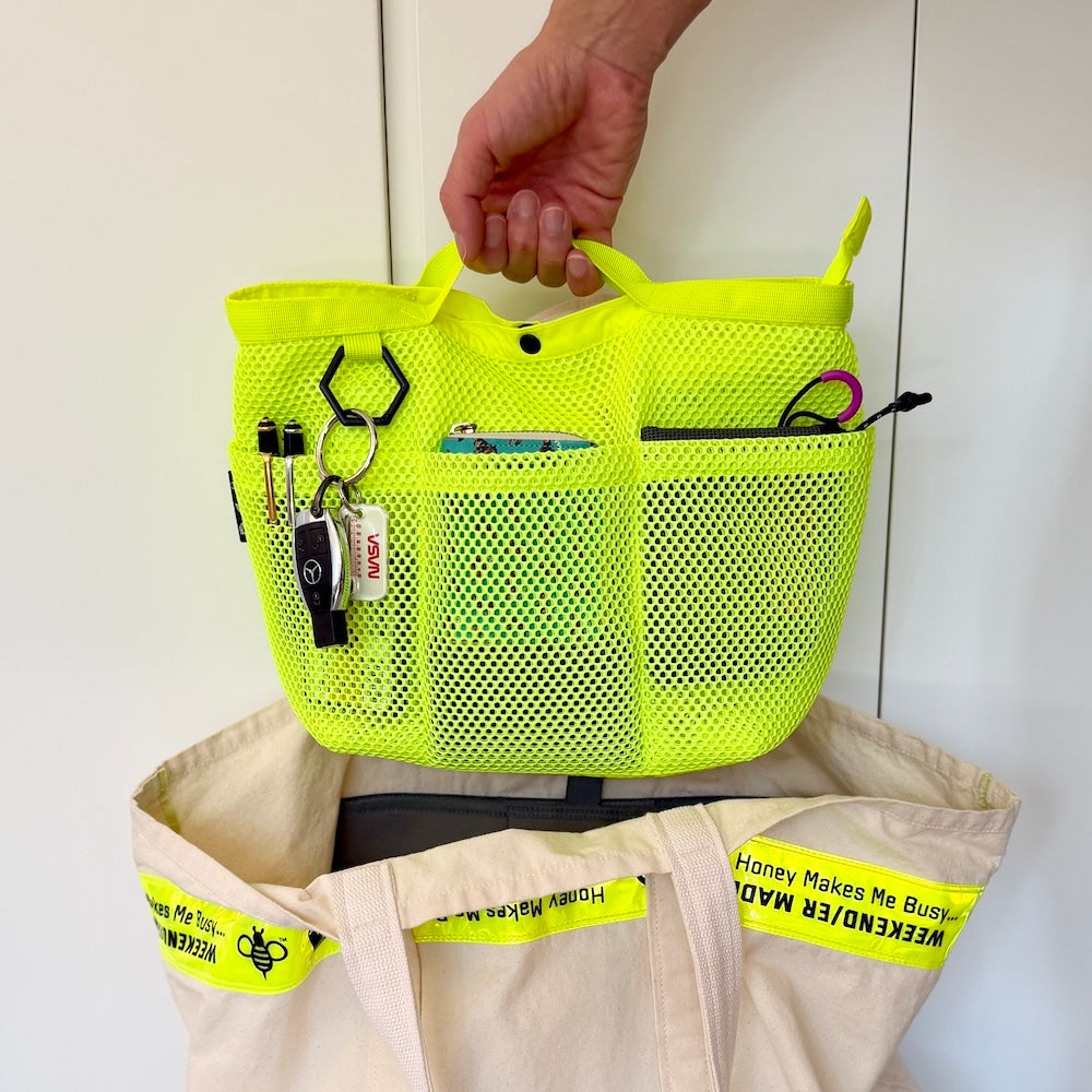 HATCHオリジナルで人気のトートバッグと一緒に使って欲しい、理想の横型バッグインバッグが完成しました。まずは見た目。こんなオシャレで発色のいいバッグインバッグ、見たことありますか?メッシュ×蛍光イエローの組み合わせが、とにかく可愛い。でも、ただ可愛いだけでこの素材と色を選んだわけじゃありません。バッグの内側と同化しないから、夜でも中身が探しやすい。つまり、見た目と機能性をちゃんと両立しています。使い勝手も抜群。外ポケットは表に3つ、裏に3つ、ペンポケットが1つ。内ポケットは5つ、すべてマチ付きで収納力もばっちり。厚みのあるものでも、すっきり整理できます。もちろん、自立します。引き手付きだから、バッグ間の入れ替えもサクッと完了。マグネットボタン+ファスナー付きで、単体のクラッチバッグとしてもイケメンです。そしてこだわったのが、六角形(そう、蜂の巣は六角形!)のブラックカラビナ。全体をビシッと締めてくれて、鍵の取り外しもスムーズです。これでHATCHでバッグをいくつ買っても、中身の入れ替えは一瞬。使うたびに、「これ、買ってよかったな」って思ってもらえる、自信の一作です。ブラックはこちら