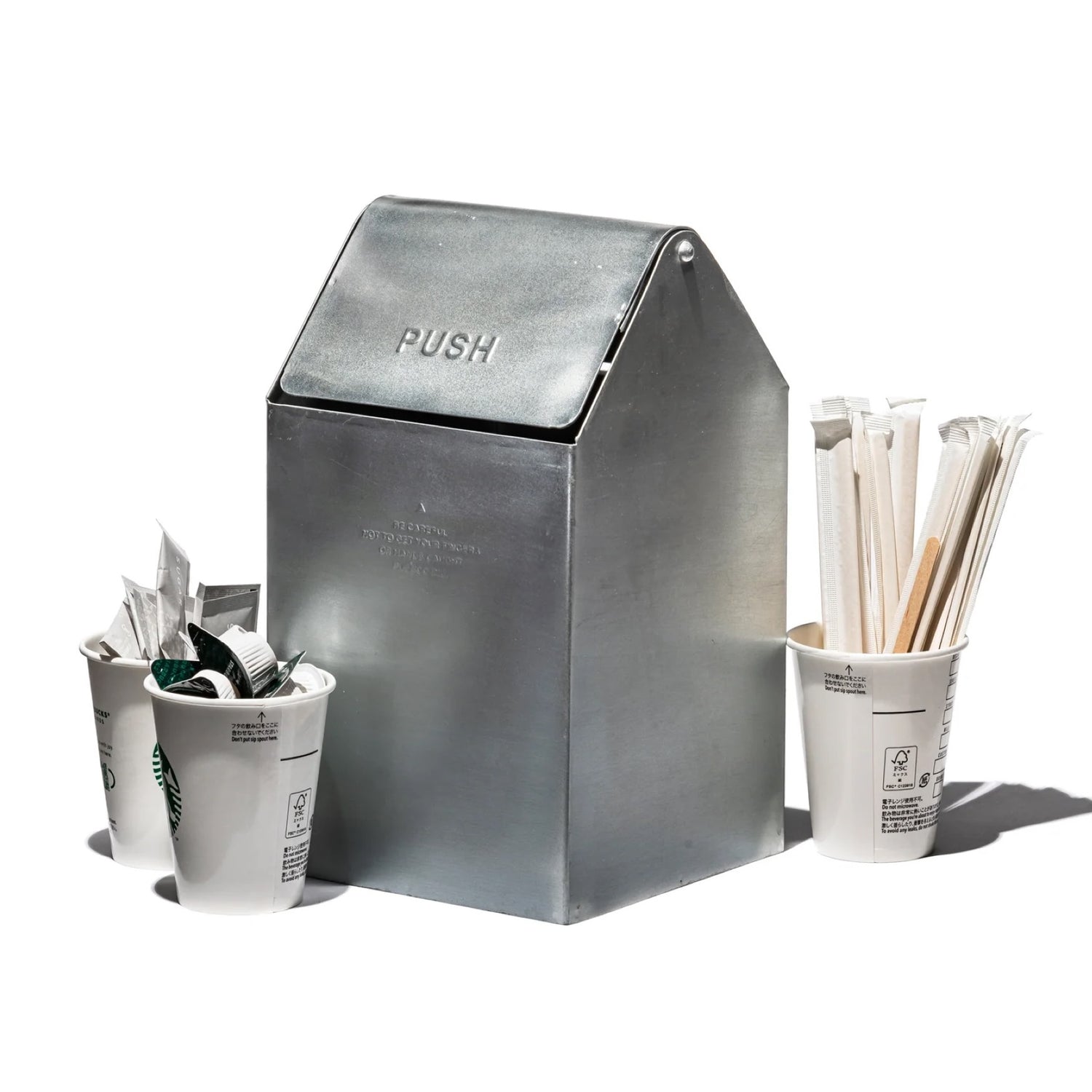 振子式の蓋で両側からゴミを捨てられる、小さいサイズのゴミ箱。コンパクトサイズで、トイレ、デスクの上、車の中などで使いのに便利。