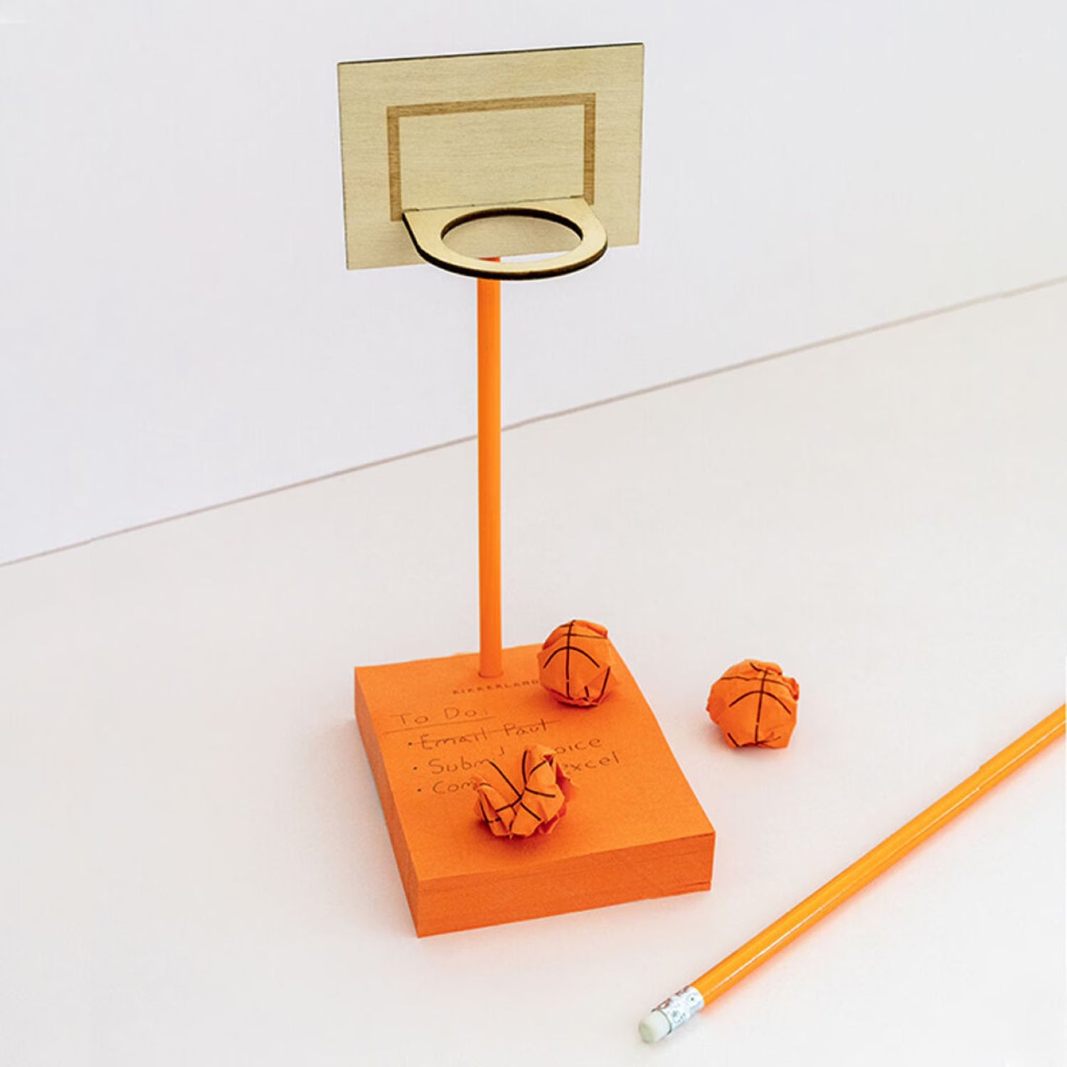 付箋の裏側がバスケットボール柄になった付箋とゴール、鉛筆のセット。付箋を丸めるとバスケットボールに変身!アイデアが浮かばなかった時やメモに失敗した時はボールを作って、ゴールにスリーポイントシュートを決めましょう。シュートが決まるまで熱中しすぎると、メモを取るのを忘れてしまうかも!?ゴールの支柱部分は鉛筆なので、普段はメモに使って休憩中はゴールを組み立ててリフレッシュ出来ます。バスケットボールが好きな方へのギフトとしてもぴったりです。