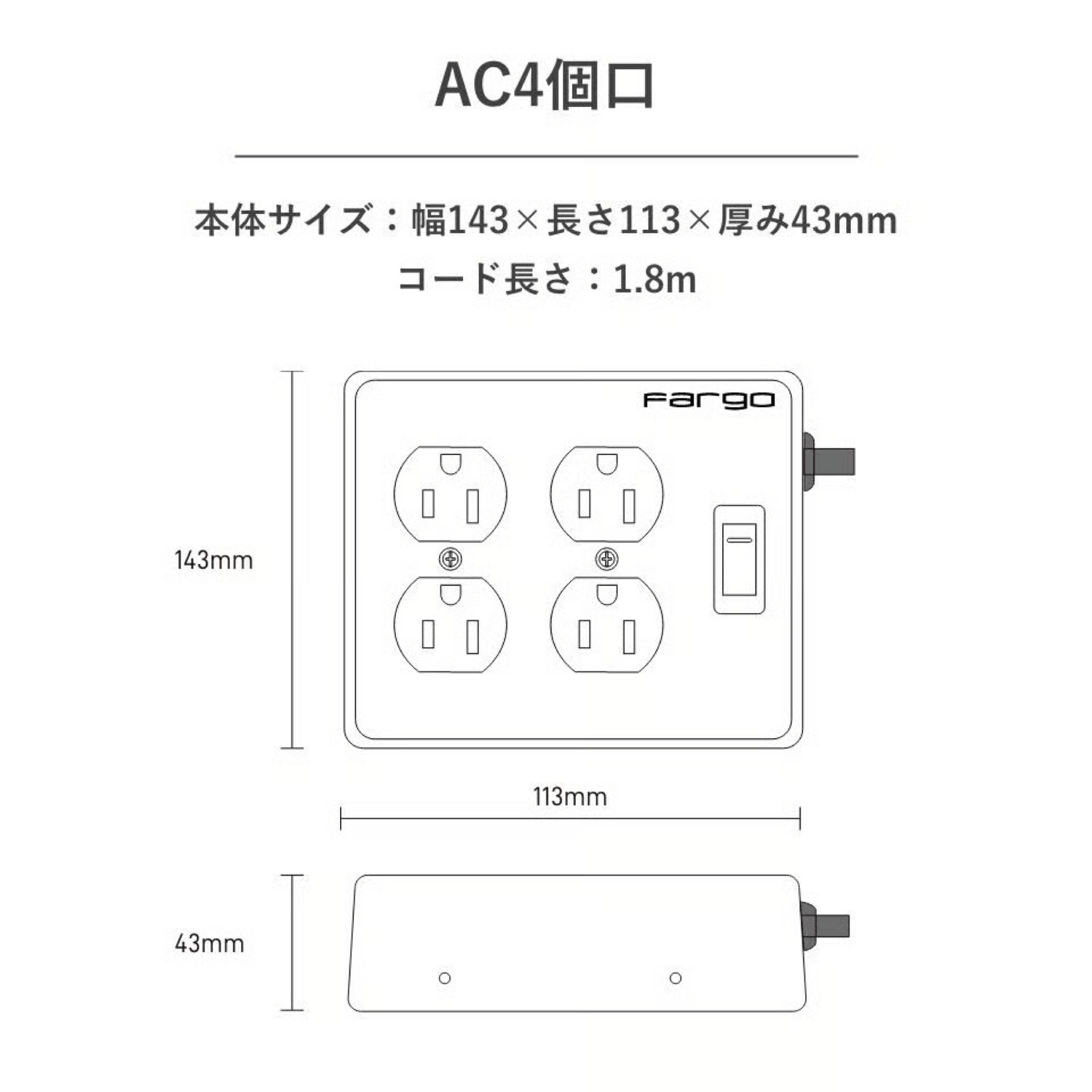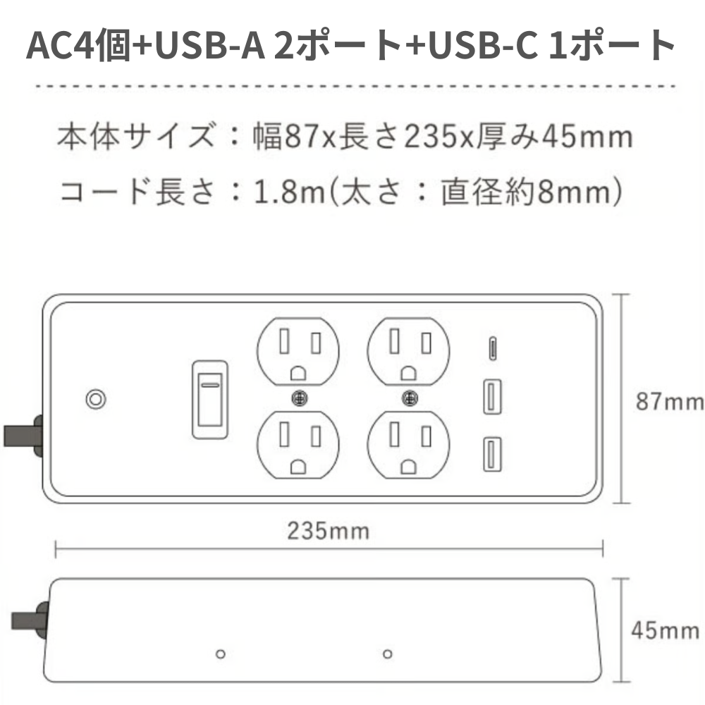 AC4個+USB-A 2ポート / USB-C 1ポート:約 長さ23.5×幅8.7×厚み4.5cm、コード長 1.8m、約770g AC2個口+USB 2ポート:約 長さ14×幅11.3×厚み4.3cm、コード長 1.8m、約607g AC4個口:約 長さ14×幅11.3×厚み4.3cm、コード長 1.8m、約753g AC6個口:約 長さ23.5×幅8.7×厚み4.5cm、コード長 1.8m、約770g |