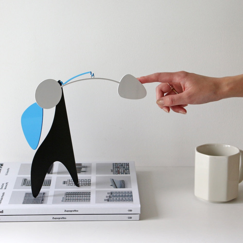 モビールがゆったりと揺れ動く様子は、慌ただしい日常を忘れさせてくれるような、穏やかでやわらかい時間を与えてくれます。ただそこにあるだけで感性を刺激し、心地よい時間が生まれる。そんな豊かな暮らしを叶えてくれるアートピースです。豊富な経験をもつエンジニアとデザイナーが手がけたこのプロダクトは、レーザーカットされた繊細なフォルムのアルミニウムパーツと、スチールのベース部分を組み合わせた、シンプルでありながらどこか有機的な雰囲気をもつモダンデザイン。天井に固定する吊り下げ式とは異なり、パーツを組み合わせて設置するだけのシンプルな構造は、デスクや書斎、キャピネットなど気軽にインテリアの中に取り入れることができます。