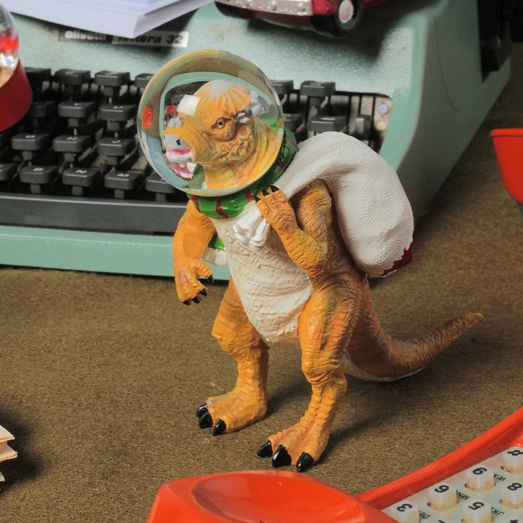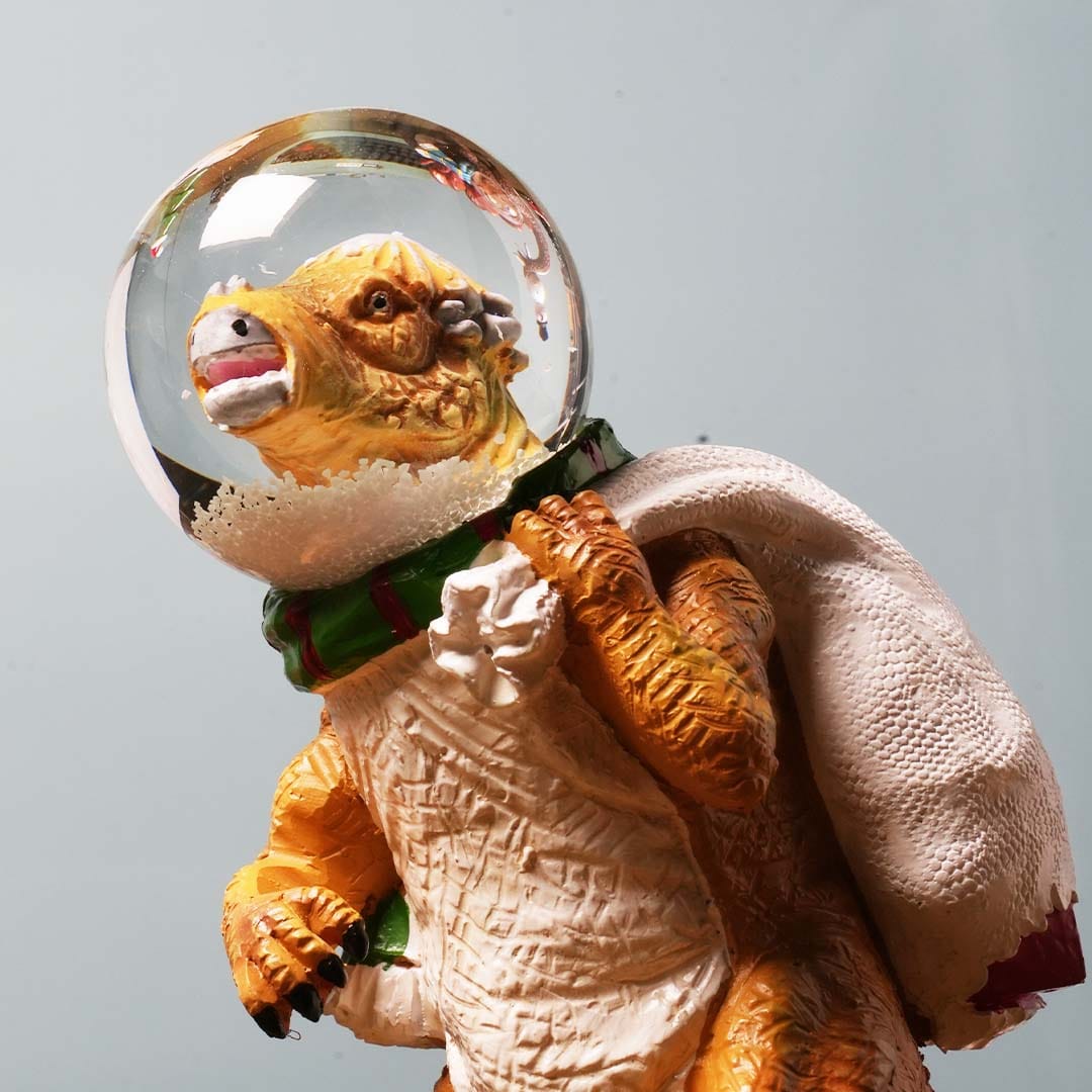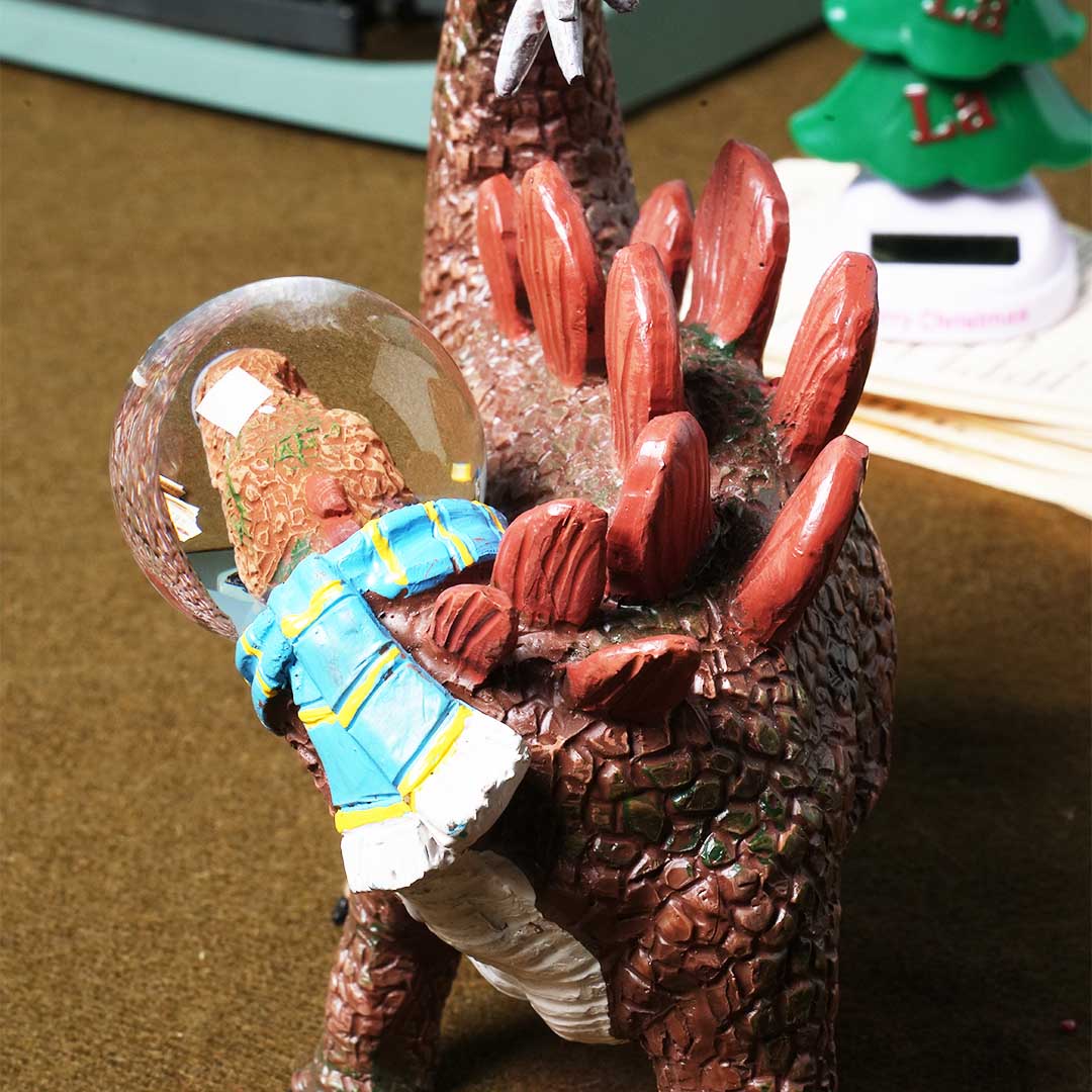 強靭な見た目によらず健気にツリーを背負うトリケラトプスのスノードーム。 大事そうに紐でくくったツリーを誰かの元へ運んでいるようで、なんとも愛くるしい。 少し抜けのある遊び心溢れるデザインは、眺めているだけで思わず笑顔になってしまいます。