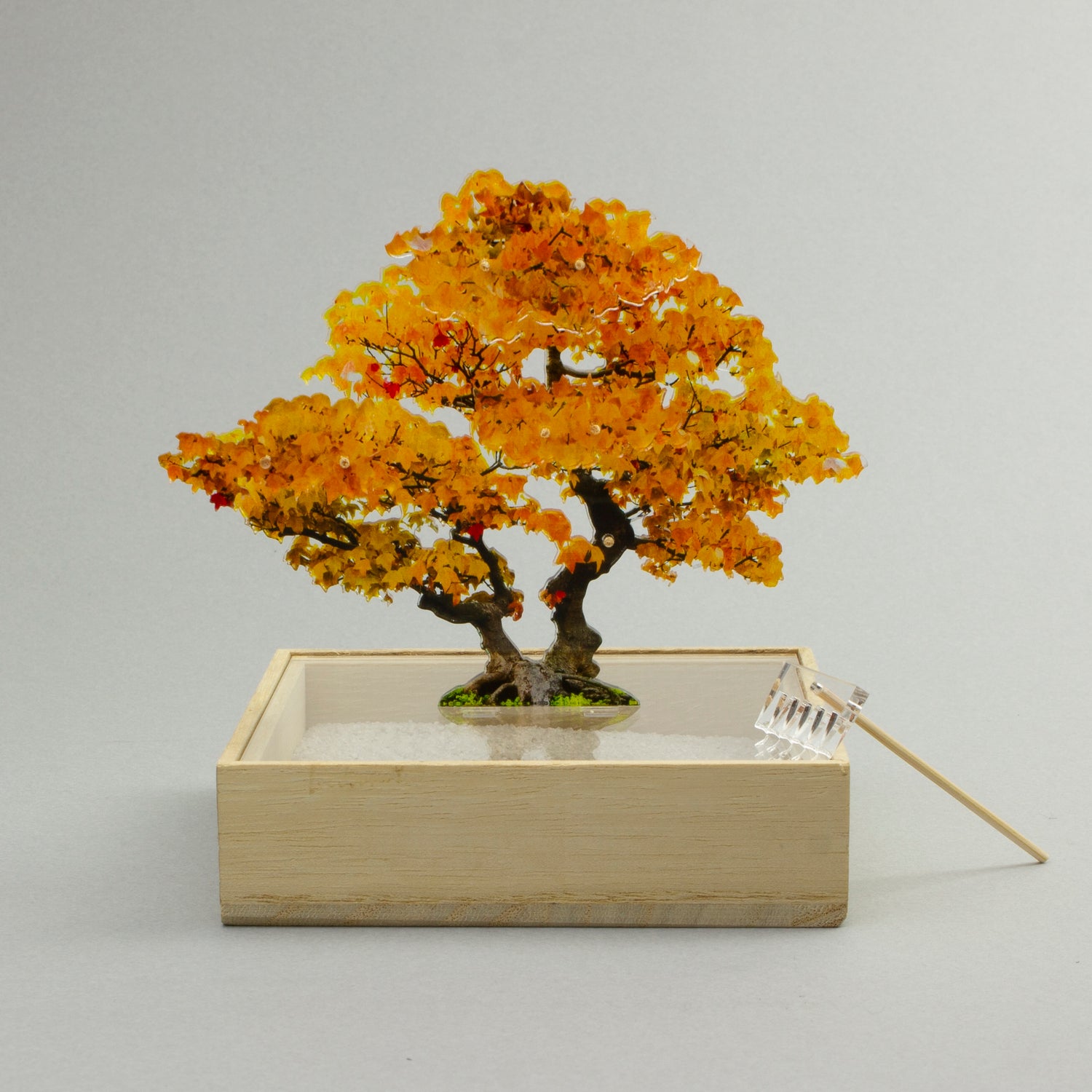 アクリルで盆栽のシルエットを表現。葉や幹のプリントは、細やかに仕上げました。葉枝は一部後付け式になっており立体感を演出、クリア素材が光に当たり、葉の色に濃淡を生みます。