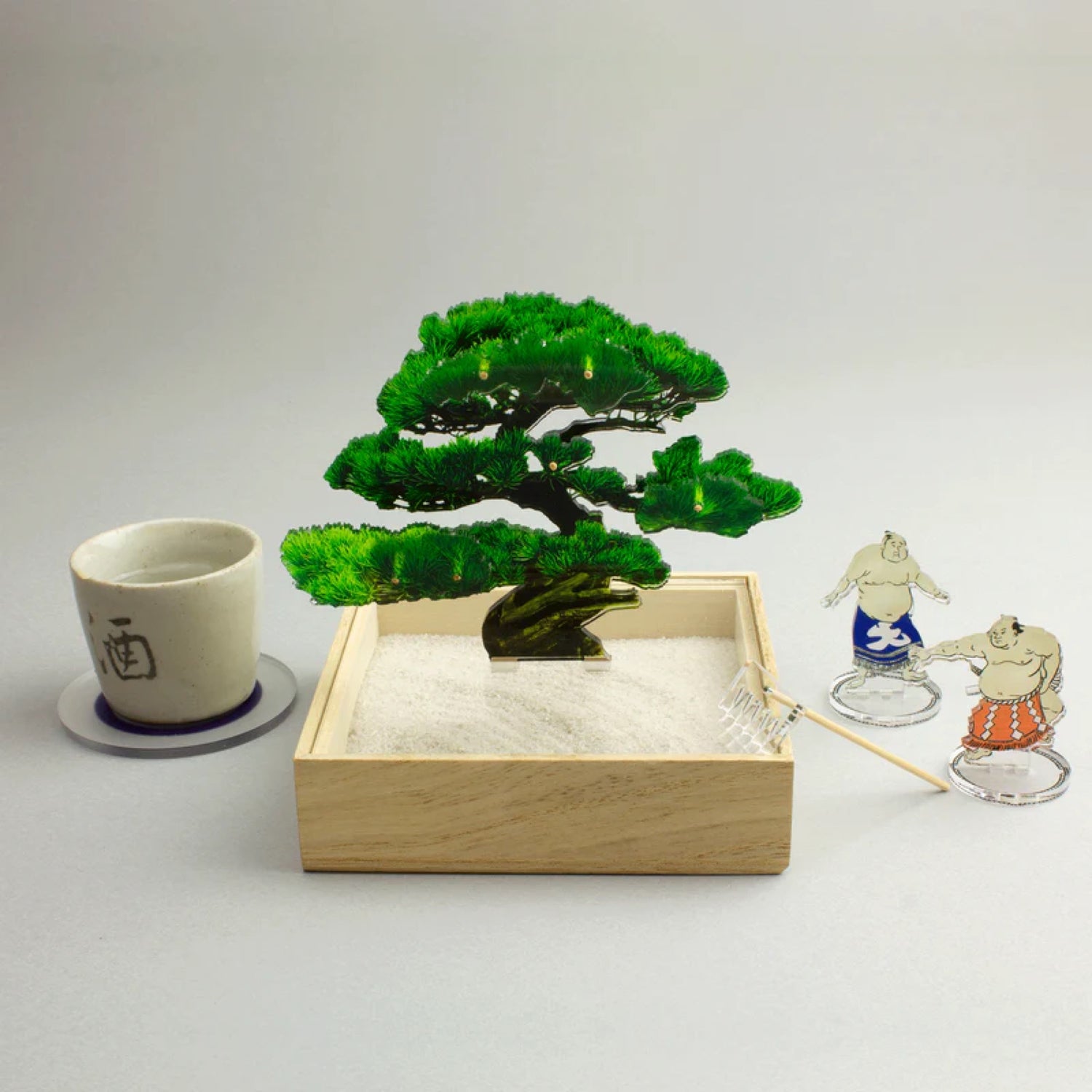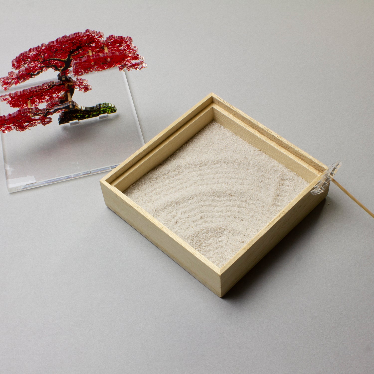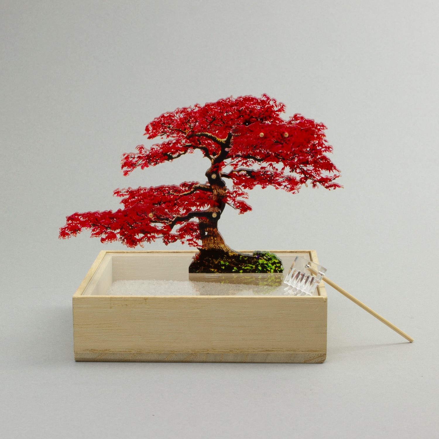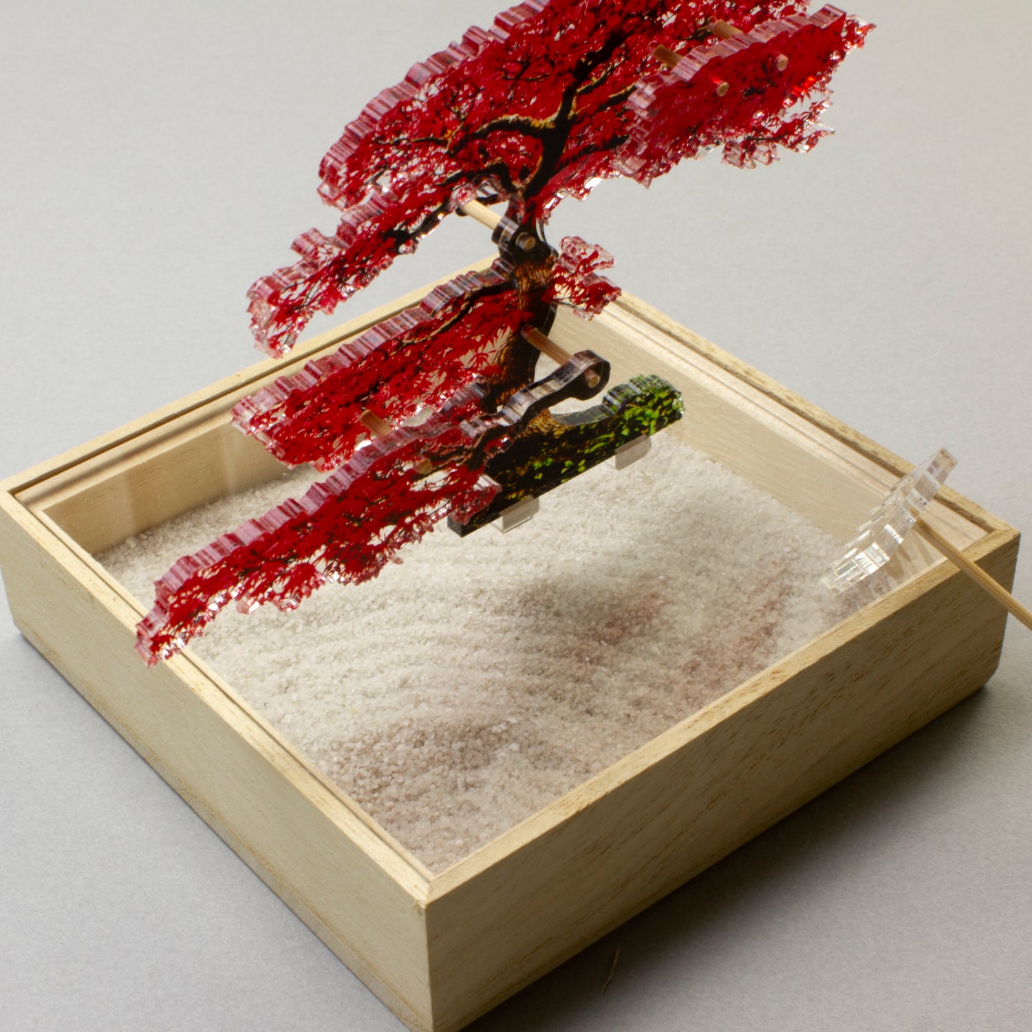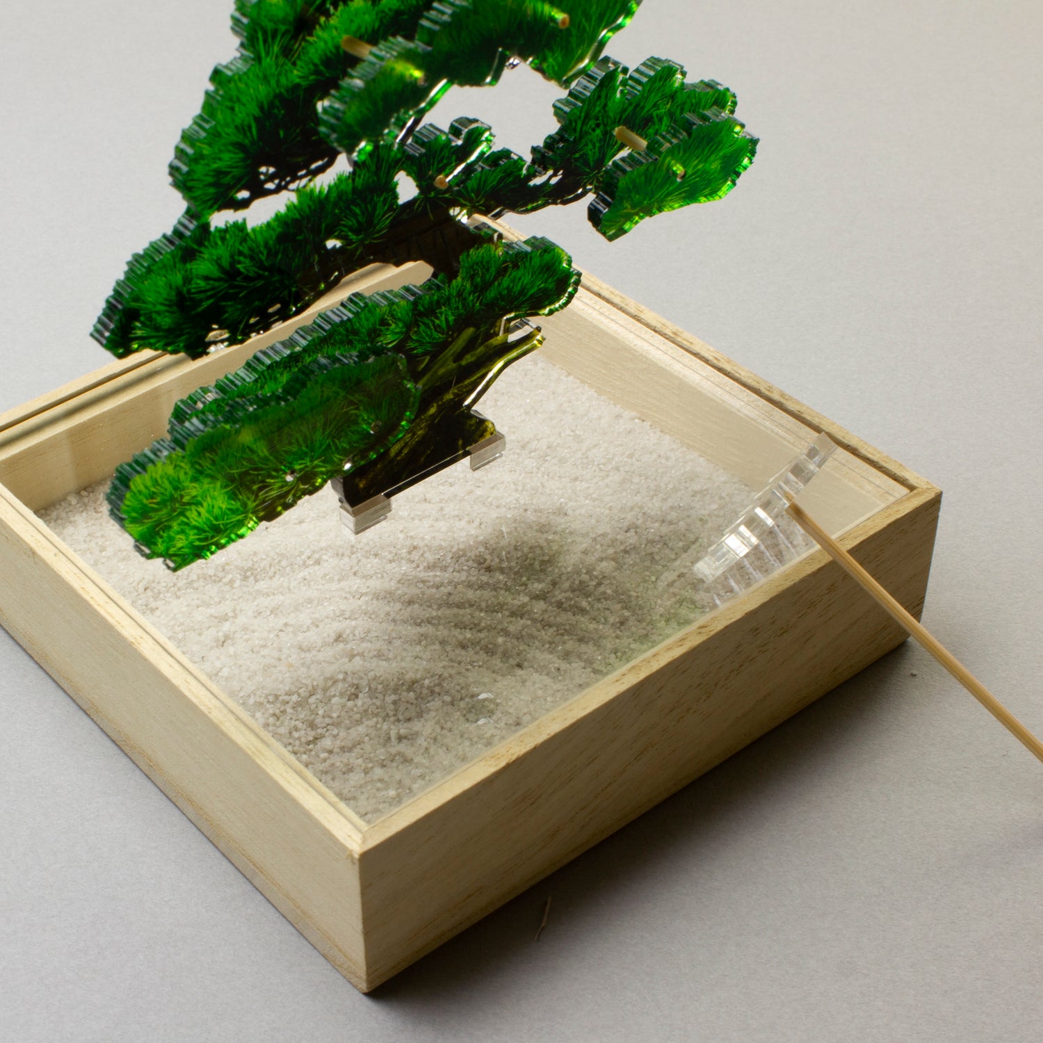 パッケージ兼土台となる木箱に、付属の白砂を敷き詰め、付属のレーキで水の流れを描き枯山水に。アクリルの土台で蓋、その上に組み立てた樹木を立てる、そういうつくりになっております。お気に入りの小石を足して小さな枯山水庭園にするのもいいですね。このプロダクトの持つ雰囲気を、一括りに表現はできないけれど、和室でも洋室でも、飾る場所は難しくないかと。