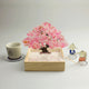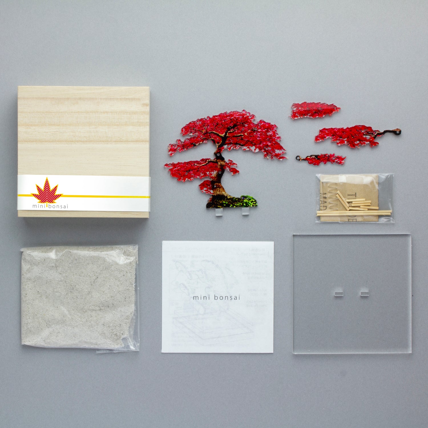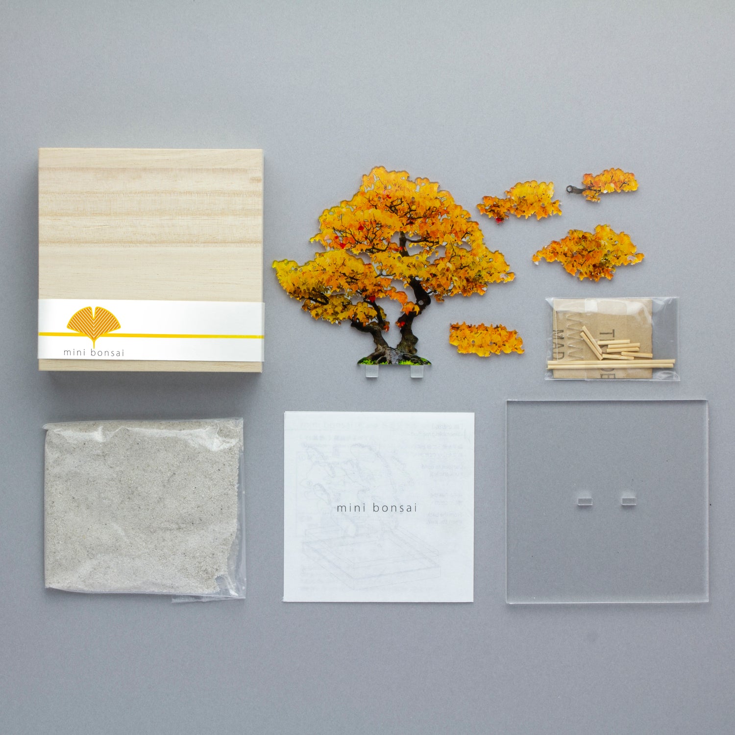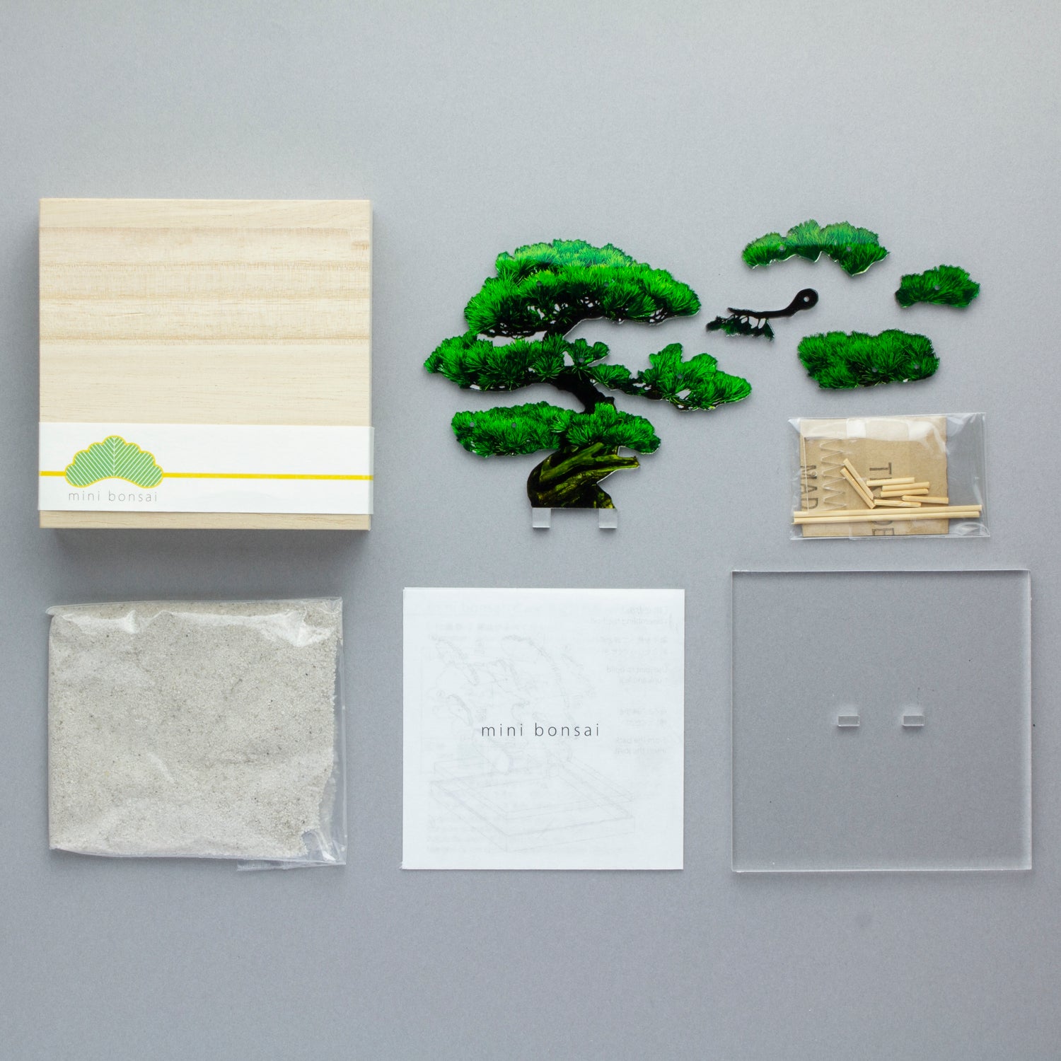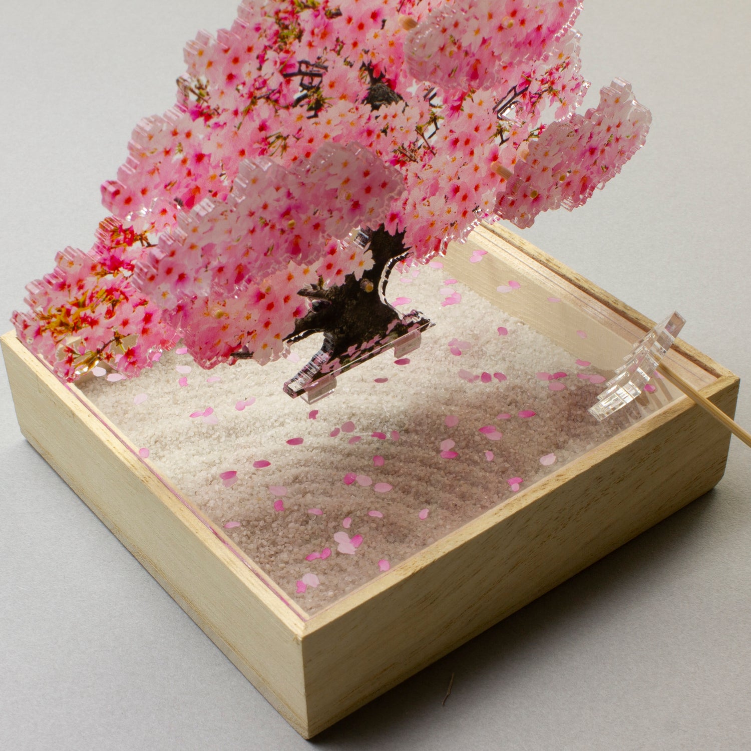 パッケージ兼土台となる木箱に、付属の白砂を敷き詰め、付属のレーキで水の流れを描き枯山水に。アクリルの土台で蓋、その上に組み立てた樹木を立てる、そういうつくりになっております。お気に入りの小石を足して小さな枯山水庭園にするのもいいですね。このプロダクトの持つ雰囲気を、一括りに表現はできないけれど、和室でも洋室でも、飾る場所は難しくないかと。