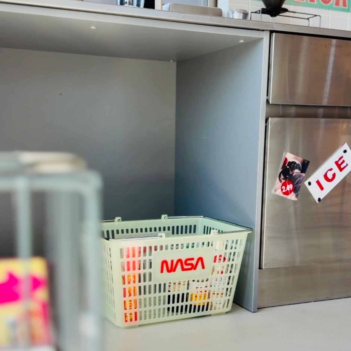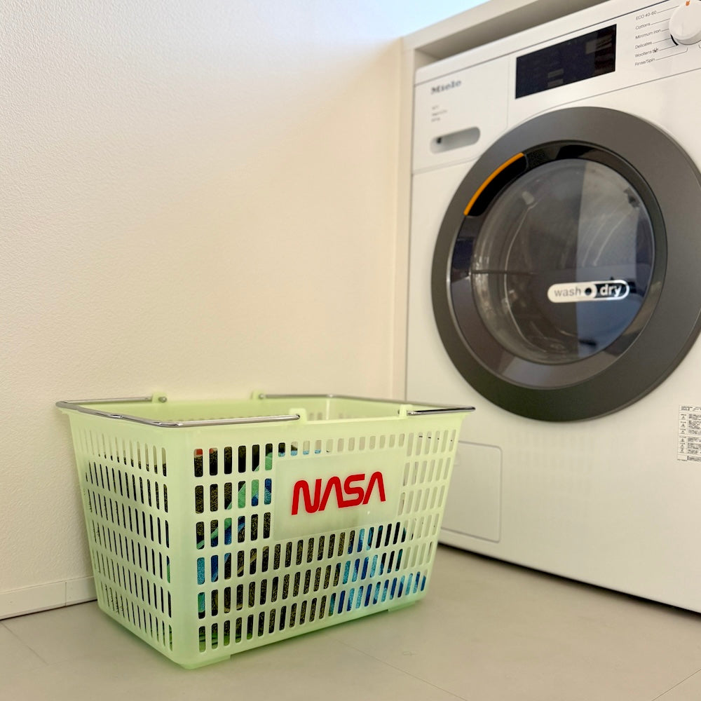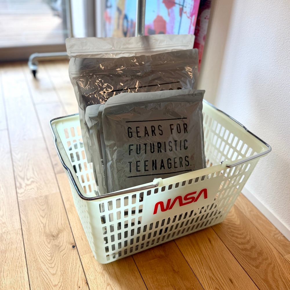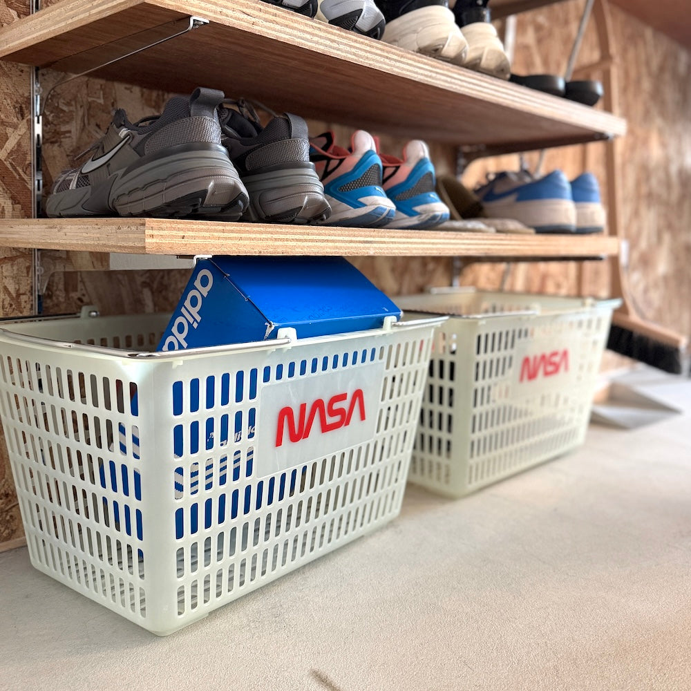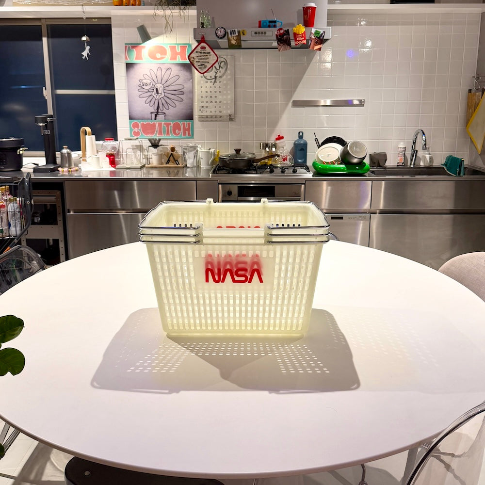 NASAと蓄光。この組み合わせだけで、もう好き。しかも実用性のあるバスケットって最高じゃないですか。この手のバスケットはいくらでもある。見た目がいいかどうかでしか差がつかないでしょ。これは完全に見た目勝ち。僕は展示会でオーダーしていた洋服が届き始めたので、とりあえずここにまとめて入れてます。洋服の整理以外にも、ランドリーバスケットとしてもいいし、デスクまわりの書類入れにも、エントランスで靴をまとめるのにも、キッチンでは食材保管、リビングで雑誌やブランケットを入れても、車に積んでおくのにも、どう使ってもどこに置いても絵になる。蓄光素材って、光ってない時の素の色が絶妙に可愛いんですよね。夜ほんのり光るのももちろんグッとくる。こういう遊び心、やっぱり好きです。他のNASA×蓄光ずるいシリーズも合わせてどうぞ。(予約商品です、3月お届け予定)