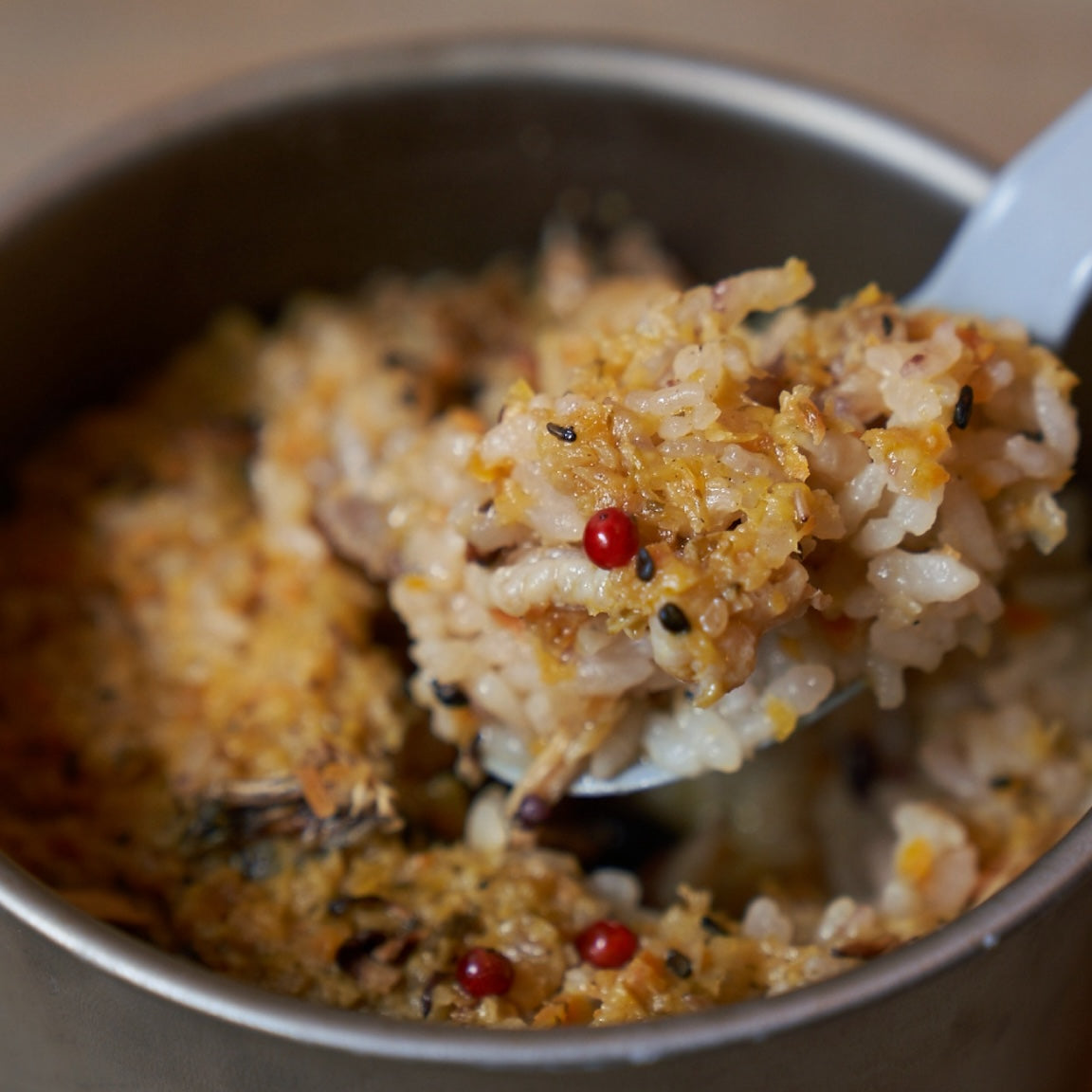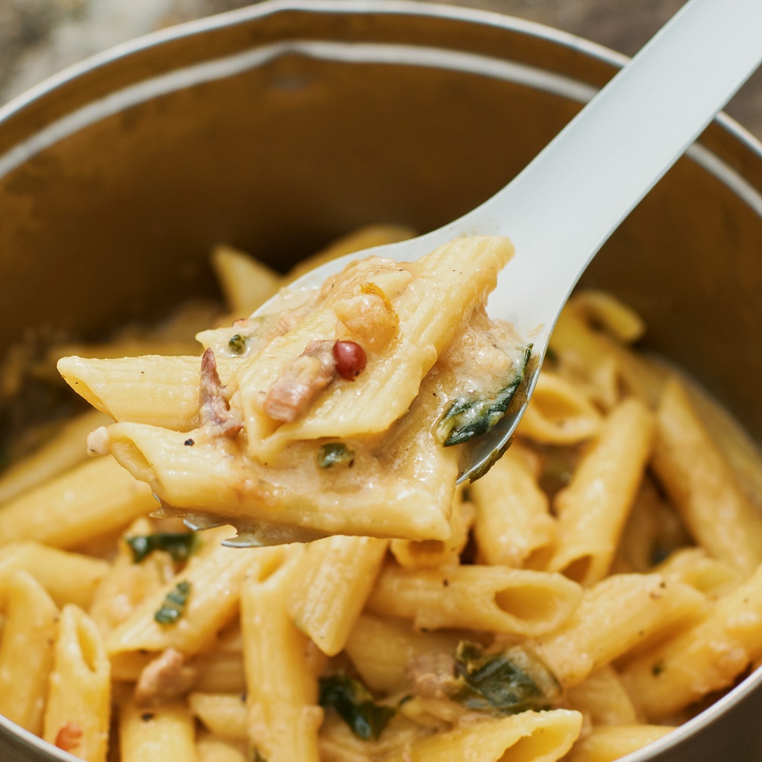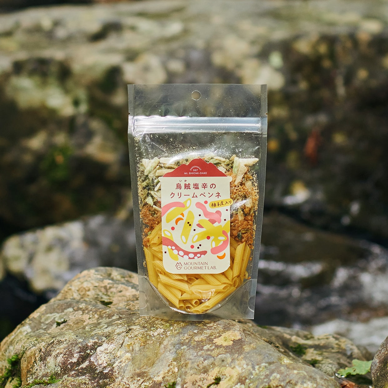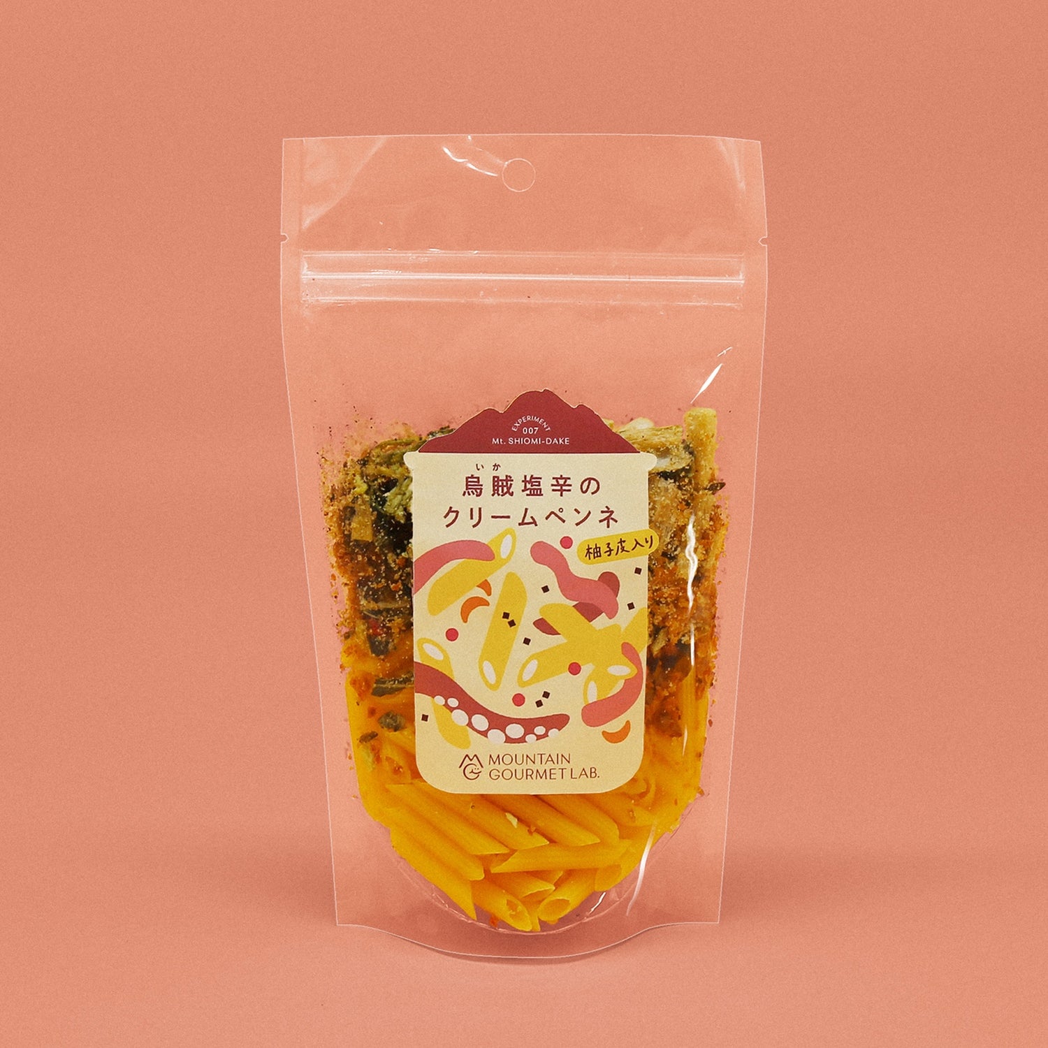 オリーブオイルで炒めた烏賊塩辛の濃厚な旨味と香ばしさ。クリームの深いコク。玉ねぎの甘み。ニンニクとフライドオニオンの食欲をそそる香りと味。ピンクペッパー、ブラックペッパーの刺激。そこに、柚子の香りがアクセントを加える。烏賊塩辛の旨味を玉ねぎとクリームでコクのあるソースに仕立て、絡みやすいようにペンネと合わせましテント場で、遠い海の潮風を想いつつ濃厚な旨味に没頭してください。