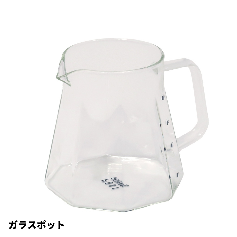 100mlごとに目盛りがついており、一般的なコーヒーマグで約2.5杯分のコーヒーを淹れることができます。電子レンジや食洗器にも対応しており、日常使いに適した耐熱ガラスを使用。ハンドドリップをじっくり楽しめる、洗練された八角形のガラスボディは、さまざまなスタイルのキッチンやカフェスペースに美しく調和します。〇電子レンジ使用可、〇食洗機使用可、×直火不可