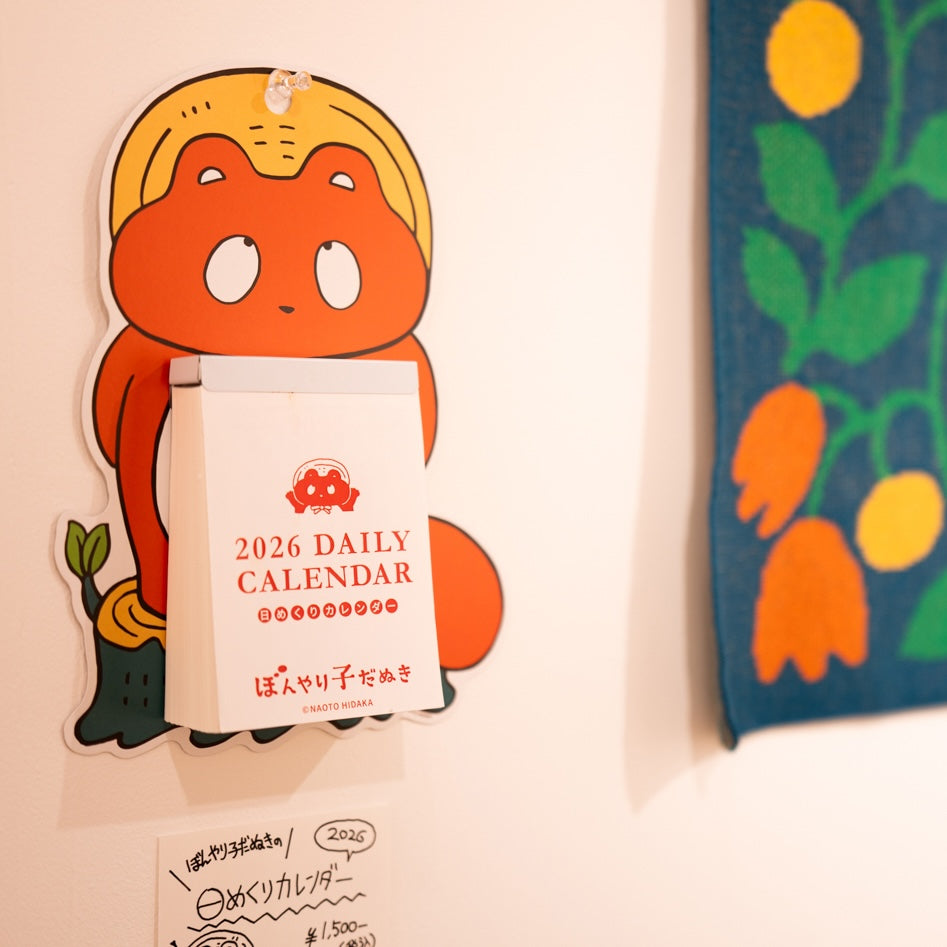 ヒダカナオトのオリジナルキャラクター『ぼんやり子だぬき』の壁掛け日めくりカレンダー。通常は陶器として販売しているぼんやり子だぬきを、より手軽に身近に飾っていただけるアイテムです。カレンダーはシンプルなデザインなので、ご自宅用にはもちろん飲食店などのお店にもオススメ。