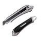 シルバーと黒を基調としたシックなデザインに、力のかけやすい形状を追求したフォルム。本体背面にはラバーが付いており、滑りにくく、作業がしやすいです。購入時に装着されている刃は「特専黒刃」です。通常刃よりも研磨角度が鋭く、より良い切れ味が特徴です。また、2段研磨を施しているため、鋭角研磨でも刃こぼれしにくくなっています。ワンタッチでしっかりロックするオートロック式。