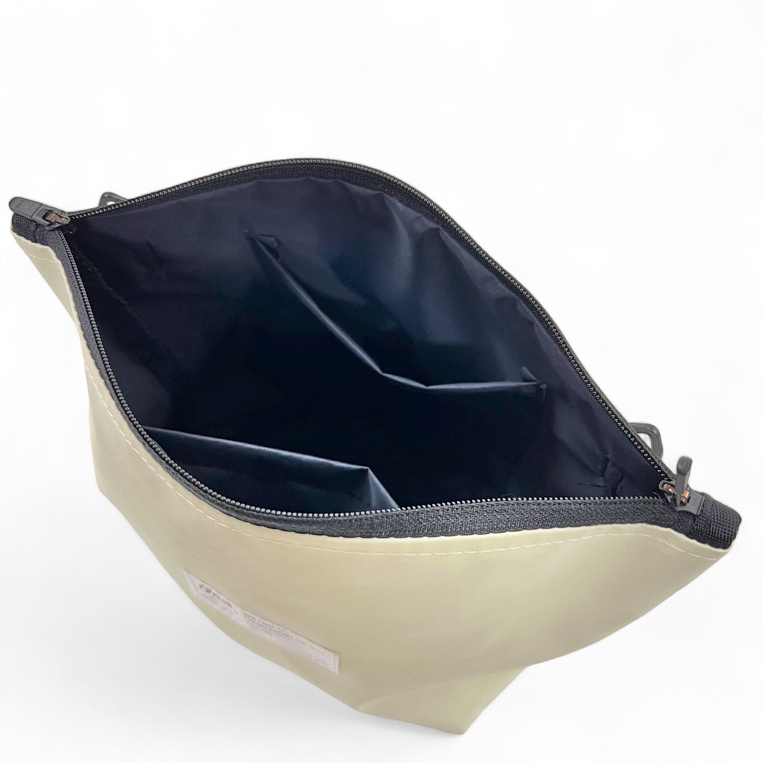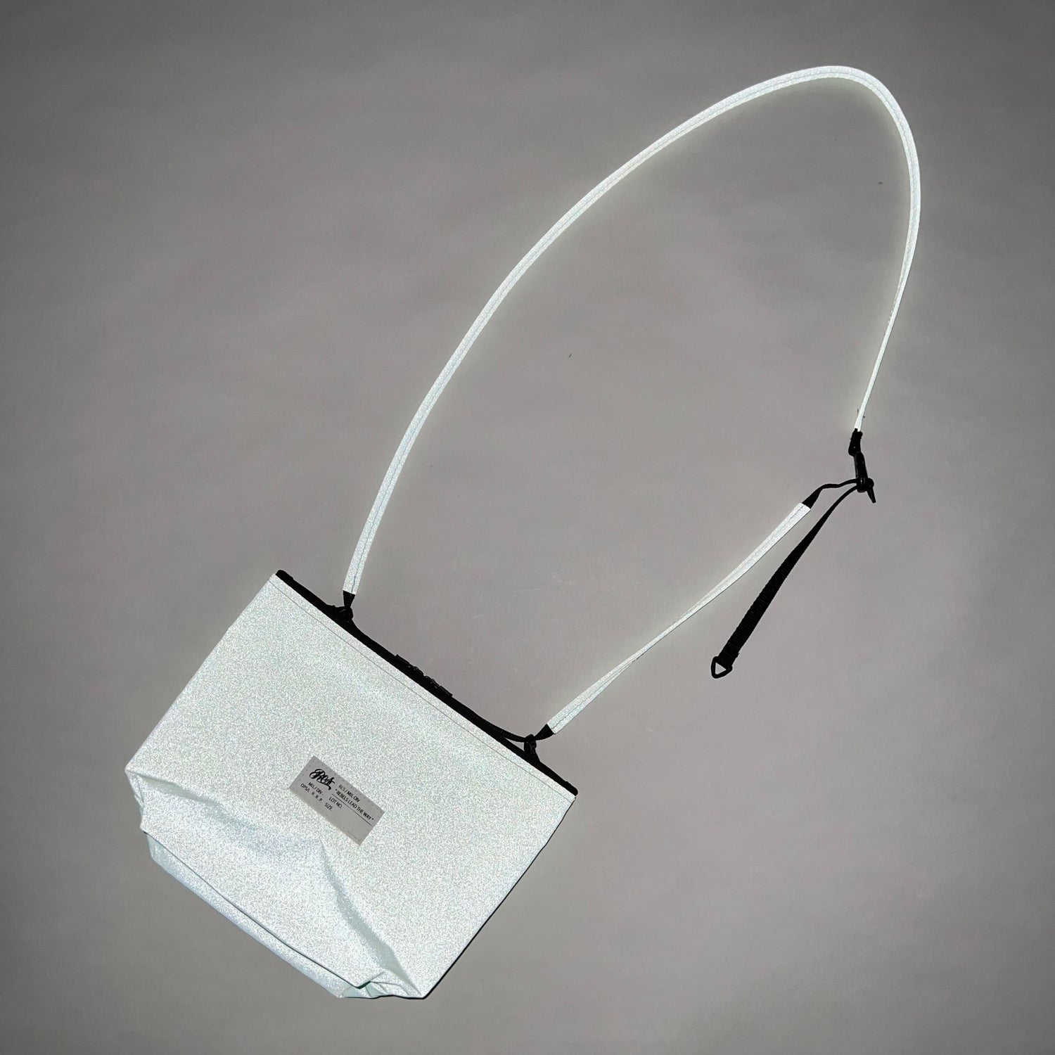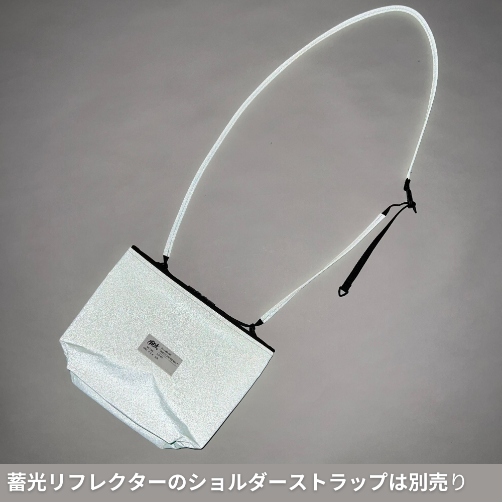 RESmildivオリジナルの蓄光リフレクター生地を使用したショルダーポーチ。ファスナー開閉のメインコンパートメントと、小分け用の内ポケット2つを配置。黒のショルダーストラップは付属で、取り外しも可能です。蓄光リフレクターグのショルダーストラップは別売り。