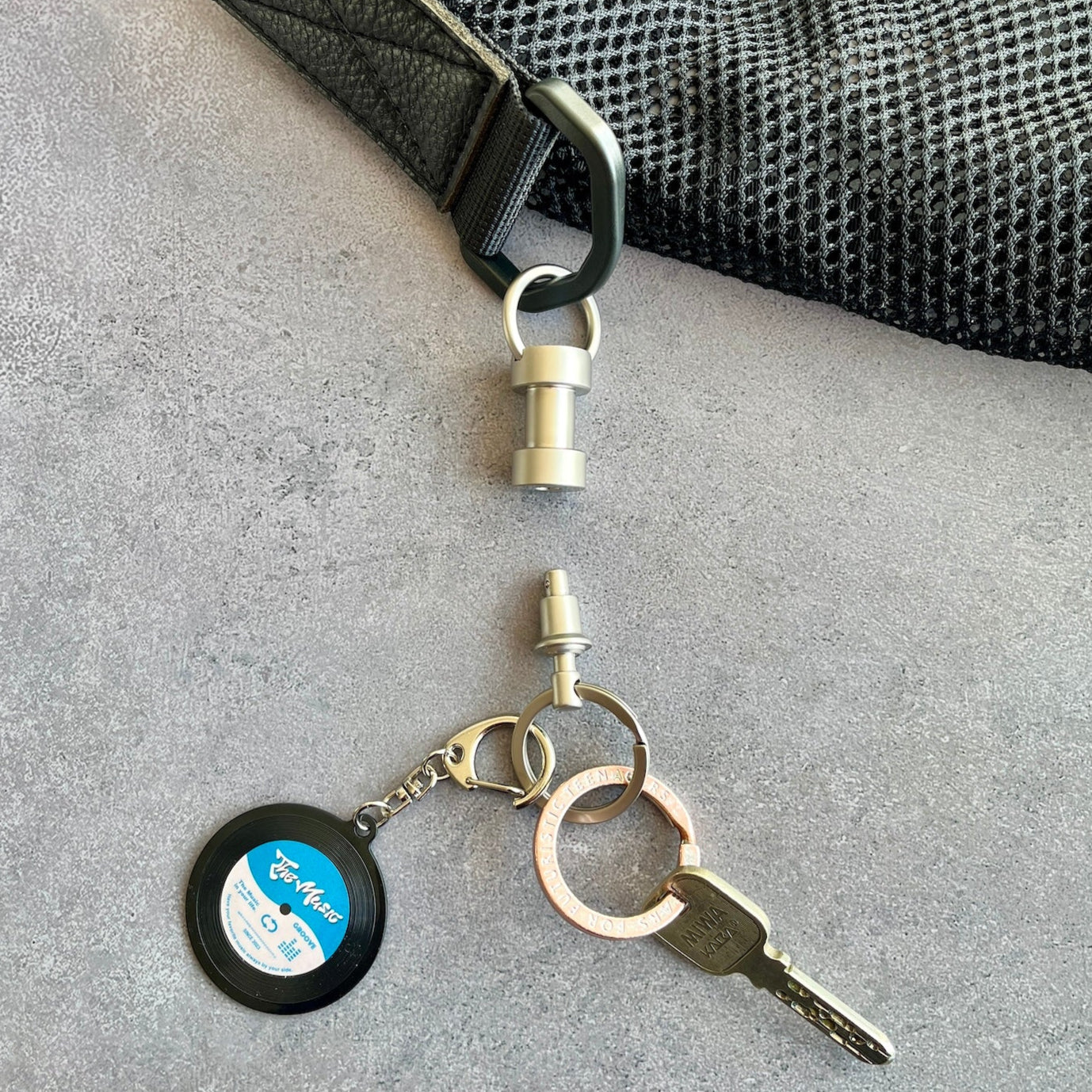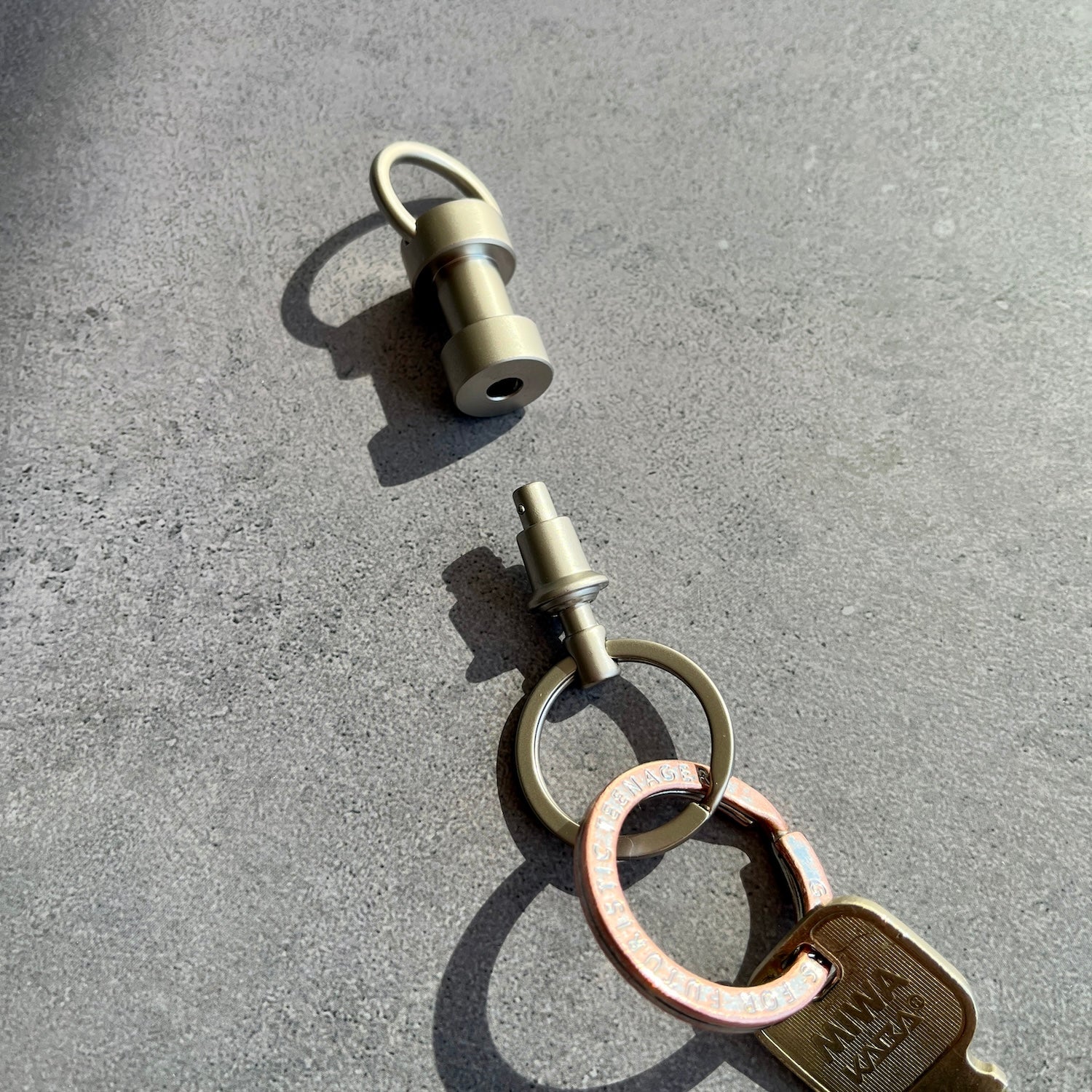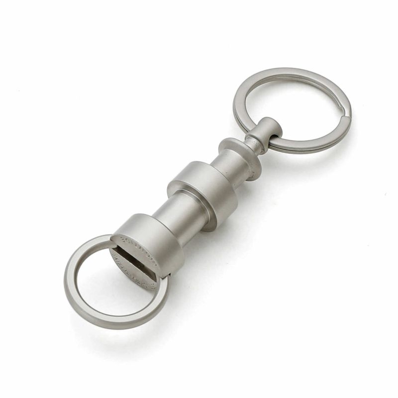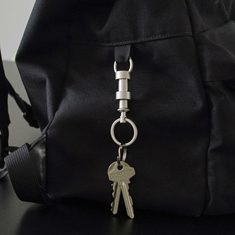 ワンタッチで外せる、着脱式のキーリング。バッグやベルトループなどに取り付けたまま、鍵を取り外せる機能的なキーホルダーです。上部のリング根元をしっかり押すと外れる仕様で、ロック機構はがっしり留まっているため不用意に外れたりもしません。適度な重さと意匠的なデザインはギフトにもぴったりなアイテムです。