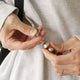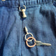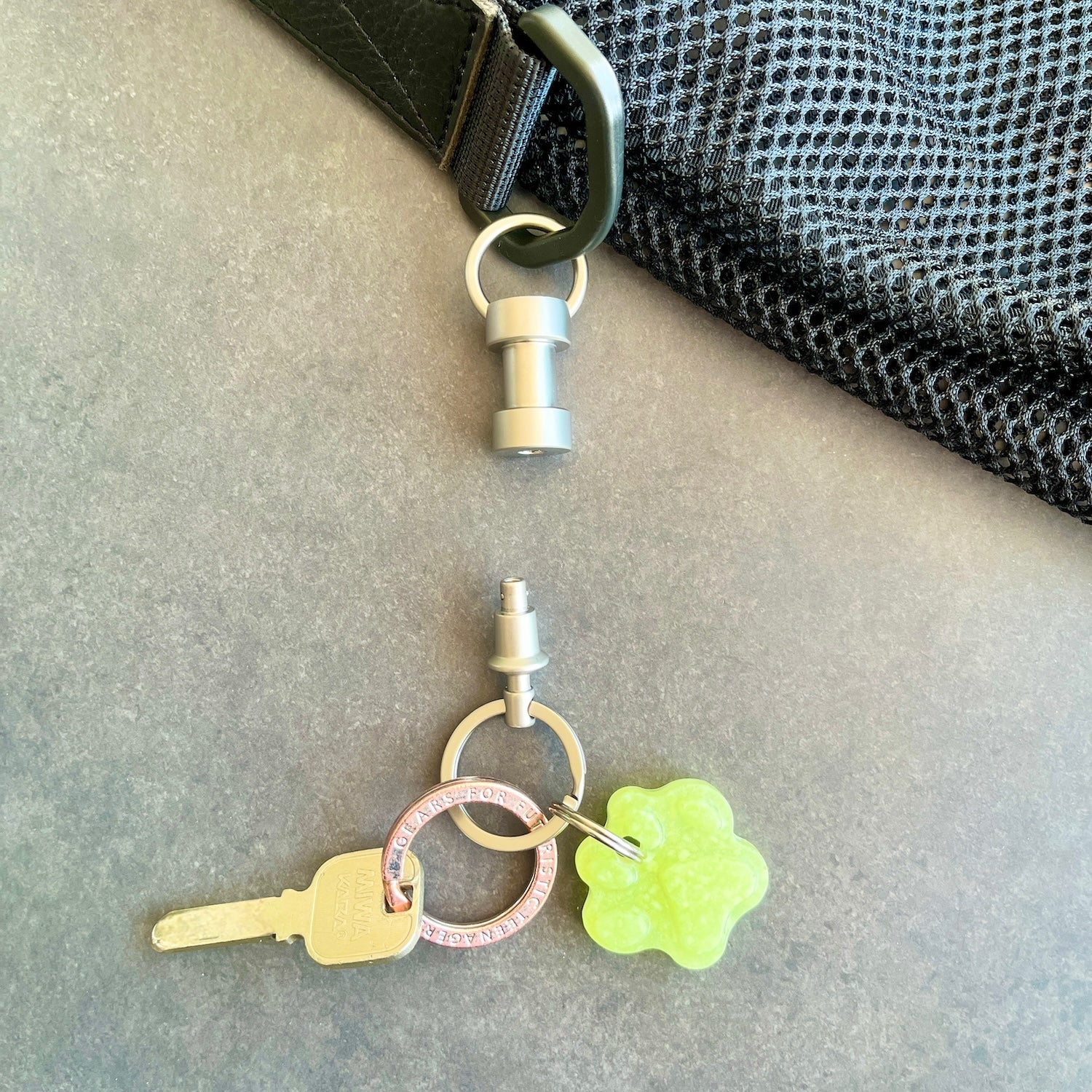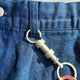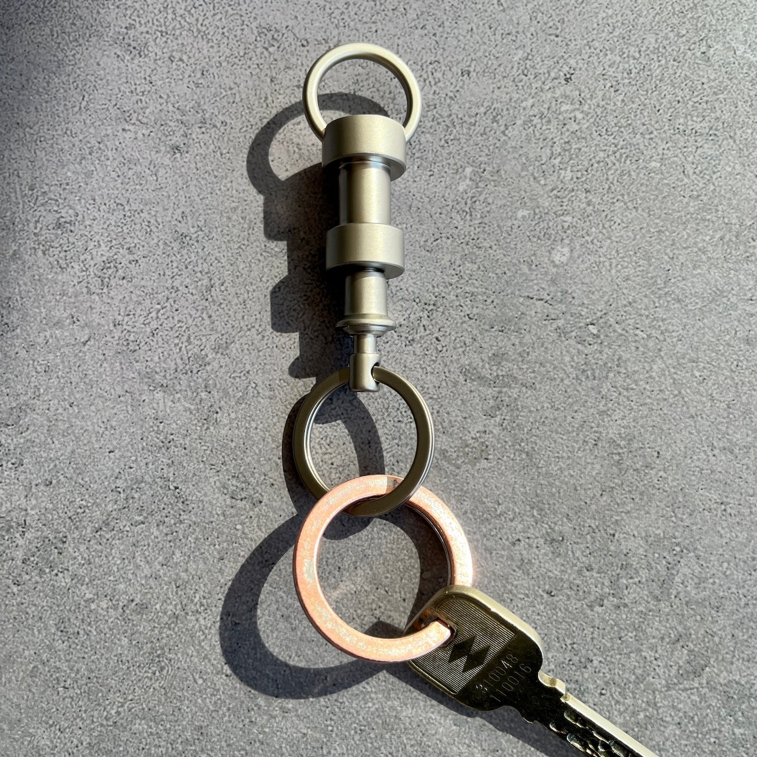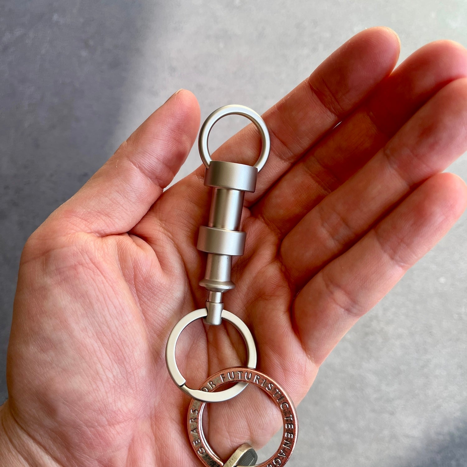 ワンタッチで外せる、着脱式のキーリング。バッグやベルトループなどに取り付けたまま、鍵を取り外せる機能的なキーホルダーです。上部のリング根元をしっかり押すと外れる仕様で、ロック機構はがっしり留まっているため不用意に外れたりもしません。適度な重さと意匠的なデザインはギフトにもぴったりなアイテムです。
