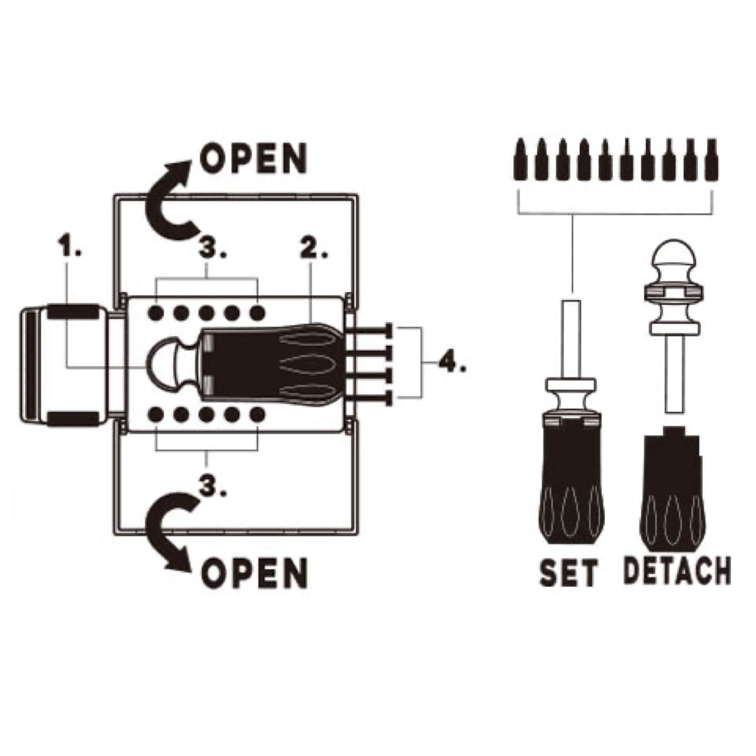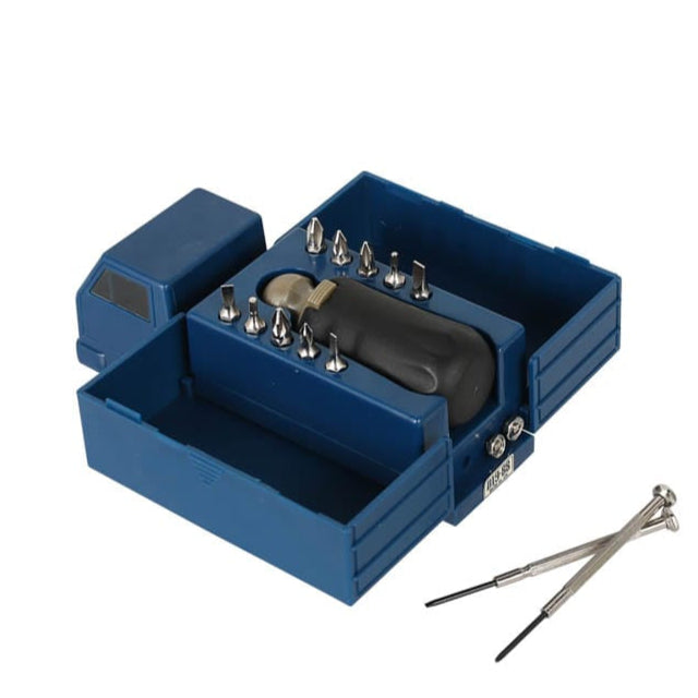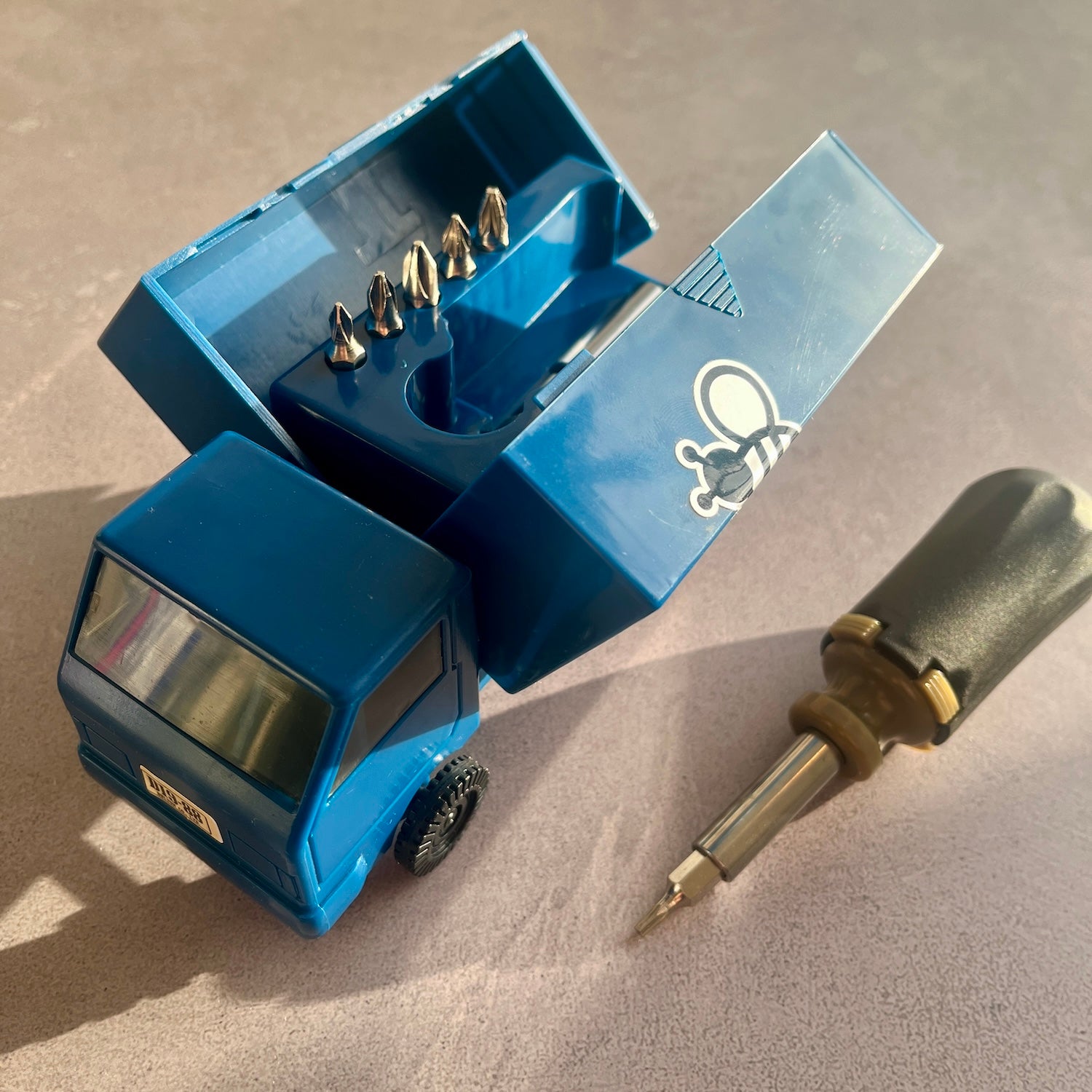 一見トラックのおもちゃのように見えますが、荷台部分を開くと中には工具が収められています。ビットホルダー、ビットセット、グリップ、ドライバーが揃った便利なセットです。さらにおまけのカスタムステッカー付き。普段は棚に閉まってしまう工具も、これならインテリアとして飾っておきたくなるはず。可愛らしいパッケージなので、D.I.Y好きなあの人へのギフトにも。