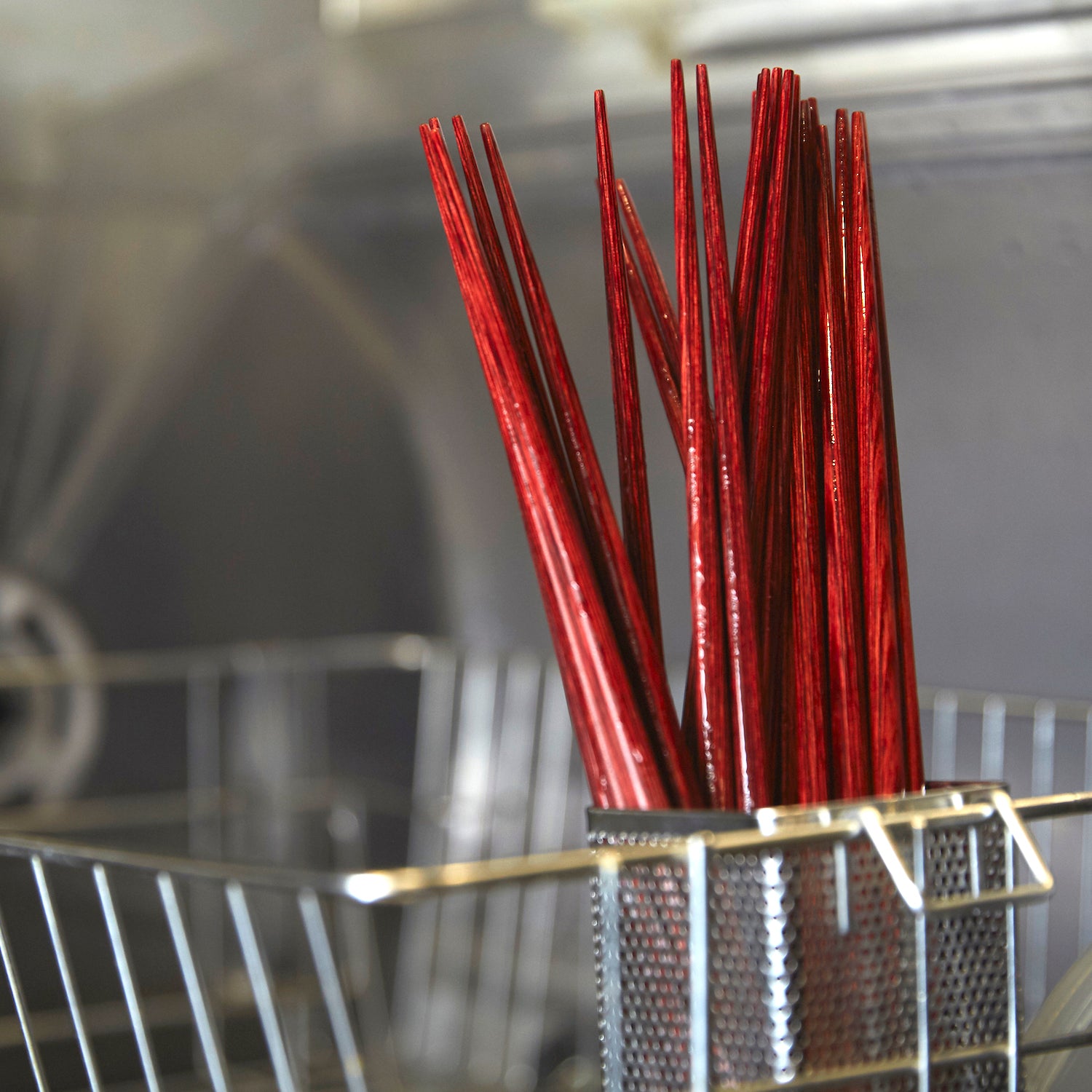 忙しい現代の家庭では、食後すぐに洗い物に取り掛かれないこと、食洗器を活用することも増えてきています。つけ置き洗い・業務用食洗器・煮沸消毒・乾燥機により、通常の塗り箸はすぐに傷んでしまいますが、この素材で作った木箸ならビクともしません。家庭用としては一生モノとして、なめらかな質感そのままに、安全にお使いいただけます。暮らしの中で木に触れて、その温もりを感じていただけるようにという想いでつくり上げた、積層強化木“コムプライト®”という素材がそれを可能にしています。もとは70年前、木材の高度利用として歯車などを作るため、金属の代替素材として開発しました。改良を重ね、乱獲が問題となった黒檀などの高級材を凌ぐ質感、耐久性をも宿すことが出来ました。