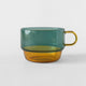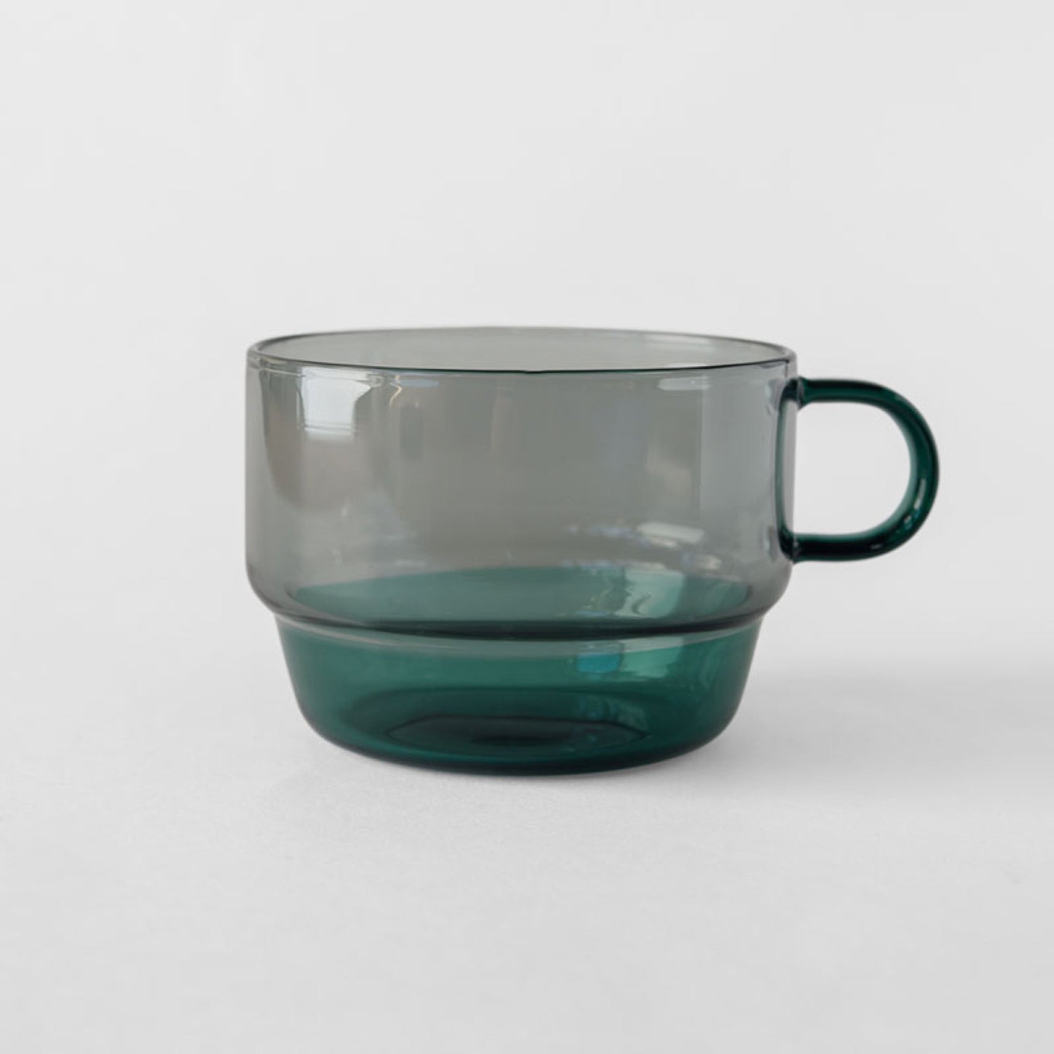 バイカラーの色合い、佇まいが美しい、スタッキングができるマグカップ。持ち手の横幅は約1cm、容量は200ml(コーヒー1杯分)。女性の手でも持ち上げやすく、手にフィットするハンドル。耐熱ガラス仕様(耐熱温度120℃)で、電子レンジ・食洗機に対応しています。