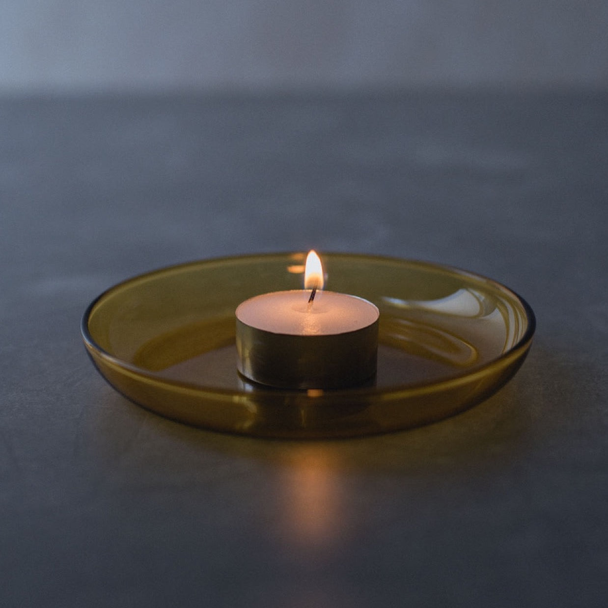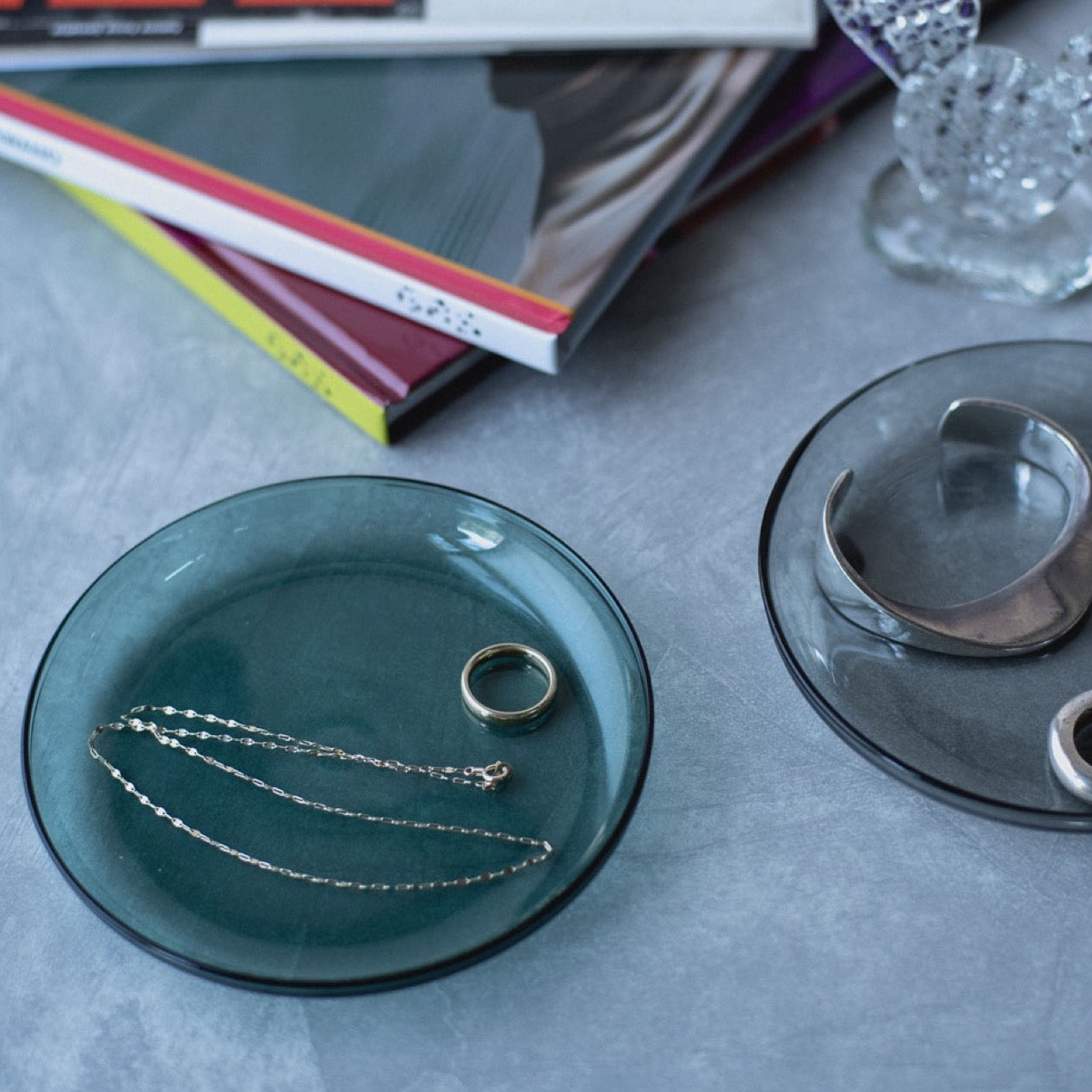 耐熱ガラスのプレート。マグカップのソーサとしてもお使いいただけます。職人が一つずつ型吹きで仕上げており、少し揺らぎがあるのが特徴。アクセサリートレイとして使用しても。耐熱ガラスなのでキャンドルやお香立てとしても、ご使用いただけます。電子レンジ・食洗器使用可、耐熱温度:120℃