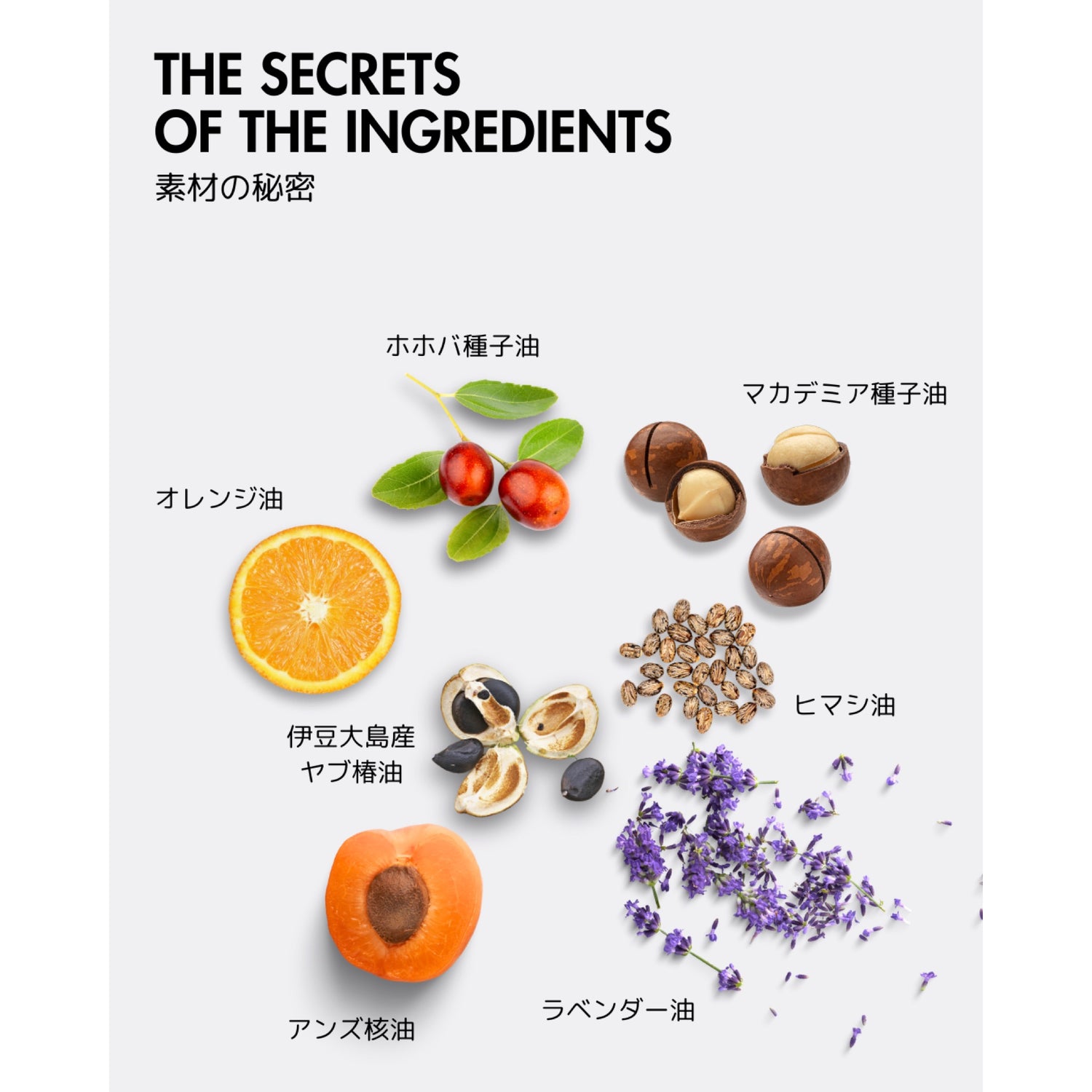 *3 ツバキ種子油、アボカド油、アンズ核油、ローズマリー葉エキス、カミツレ花エキス