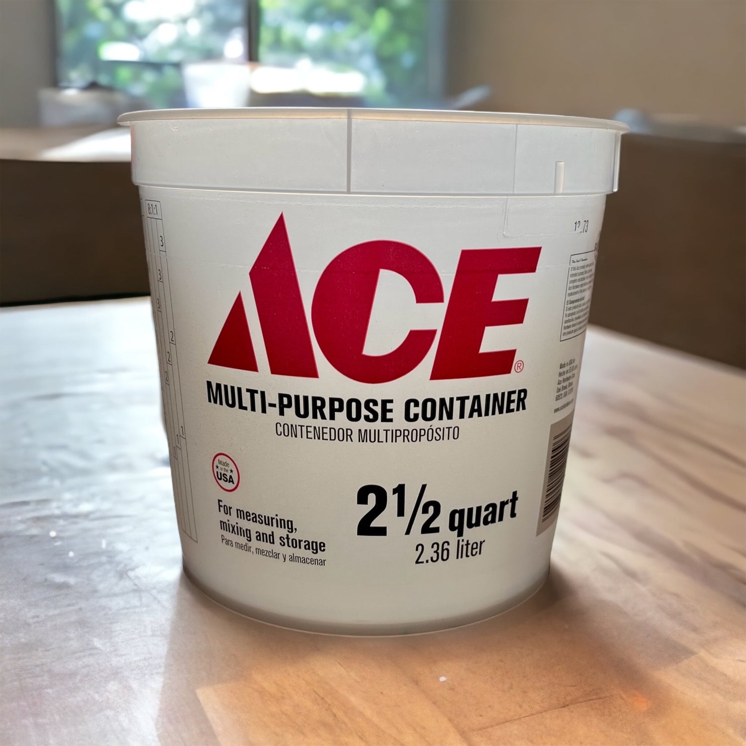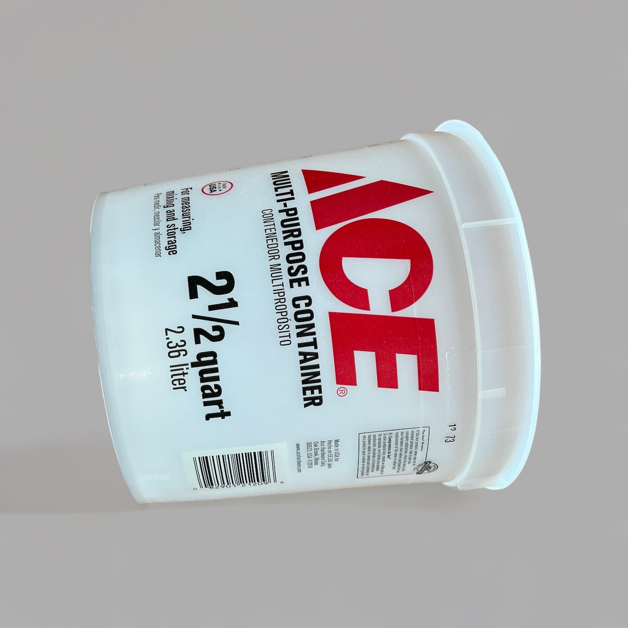 アメリカでメジャーなホームセンターAce Hardware の2.5qt(約2.4L)のプラスチック製のバケツ。リットル、クオート、オンス表記があります。耐溶剤性があり、あらゆる塗料、ペースト、接着剤に使用できます。蓋は付いていません。