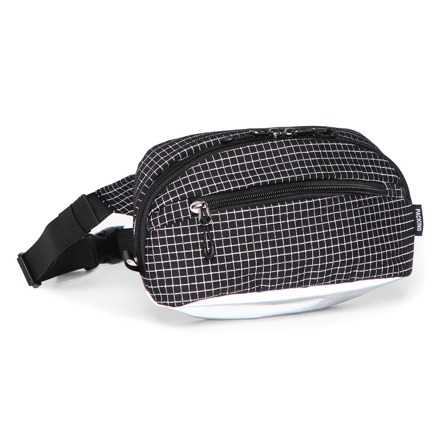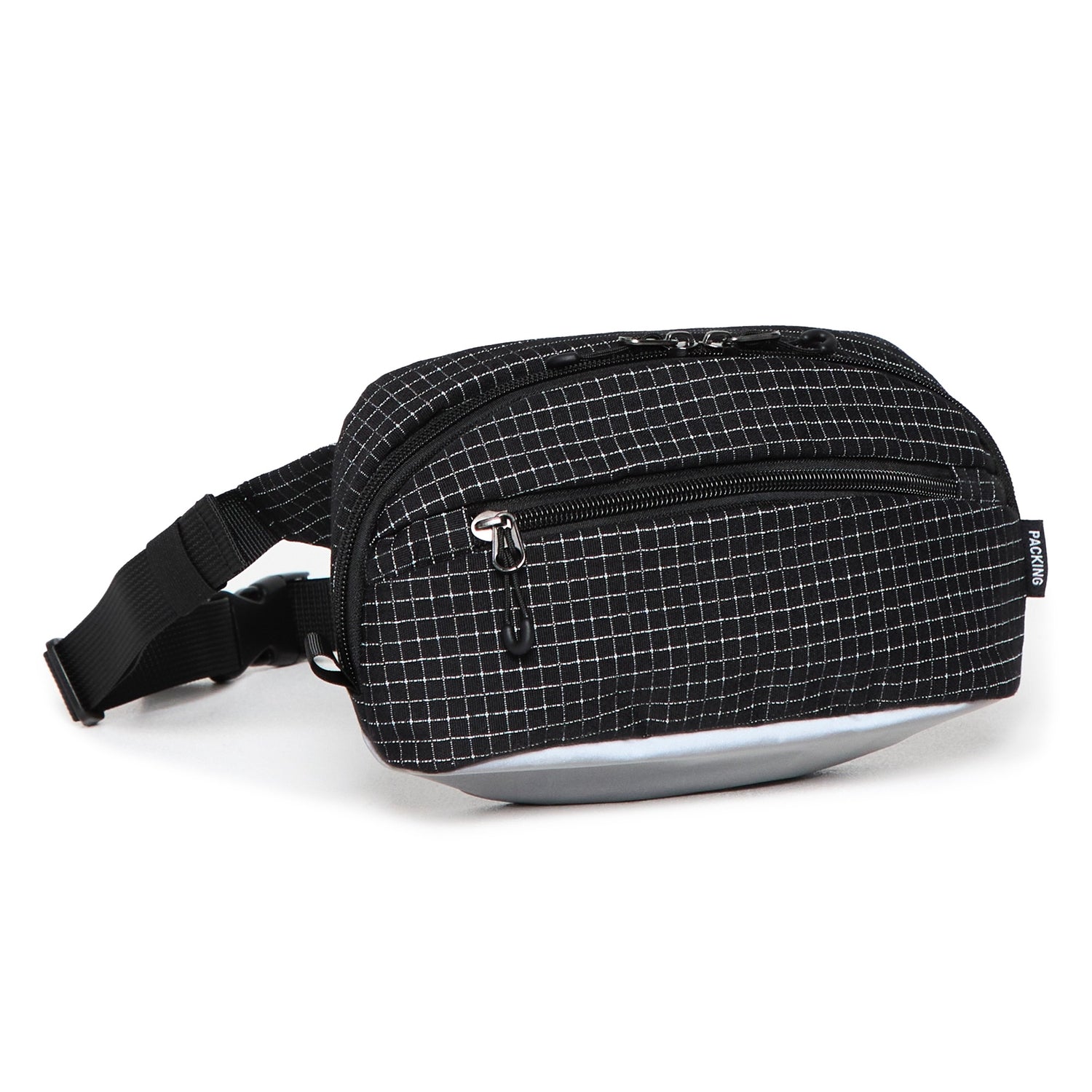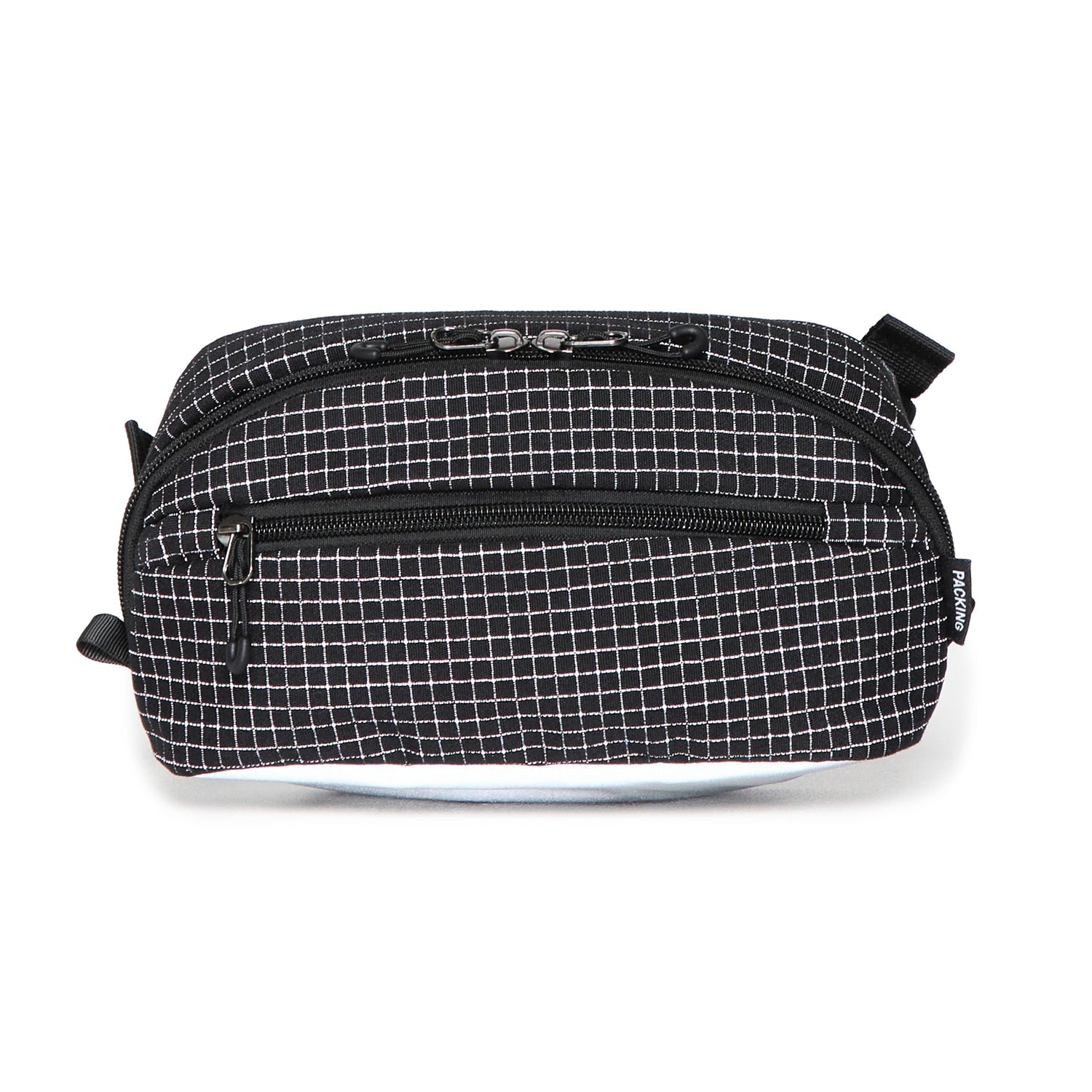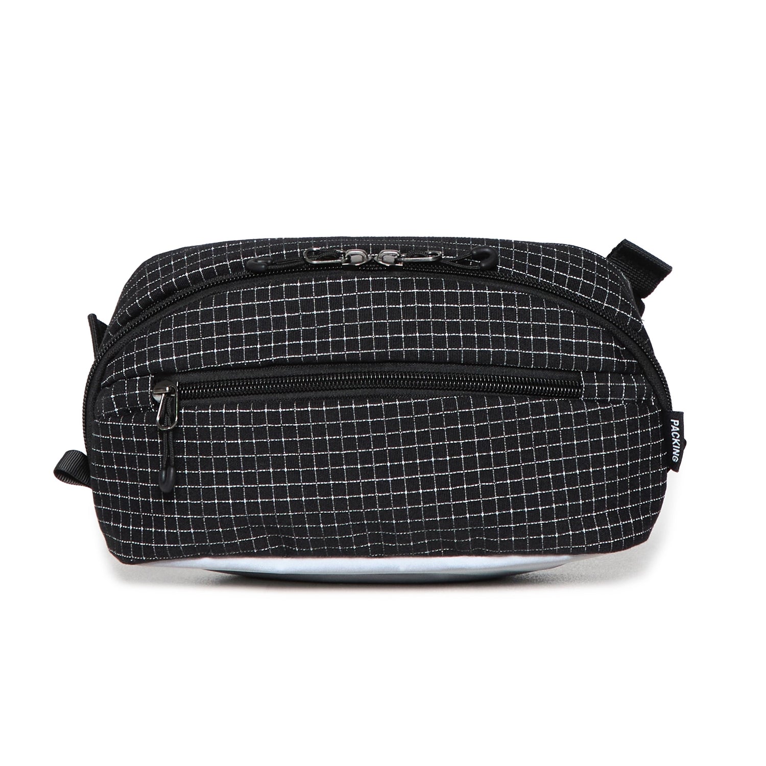 数年前にブルックリンやニューヨークのアートスークールの生協だったり、大学の生協を周った時があって。そこにシンプルで安いバッグパックやトートバッグが売っていたんです。そんなバッグを思い出させてくれるようなこのPACKING。こちらは、新作のリフレクターウエストバッグ。チェック柄の糸と底がリフレクター素材になっていて、コンパクトだけど収納力があって、Dカン付きも便利。シンプルで使いやすくて安い。その中にも野暮ったいアメリカっぽさがあるウエストバッグ。学生や若い子なんかにガンガン使って欲しいですね。