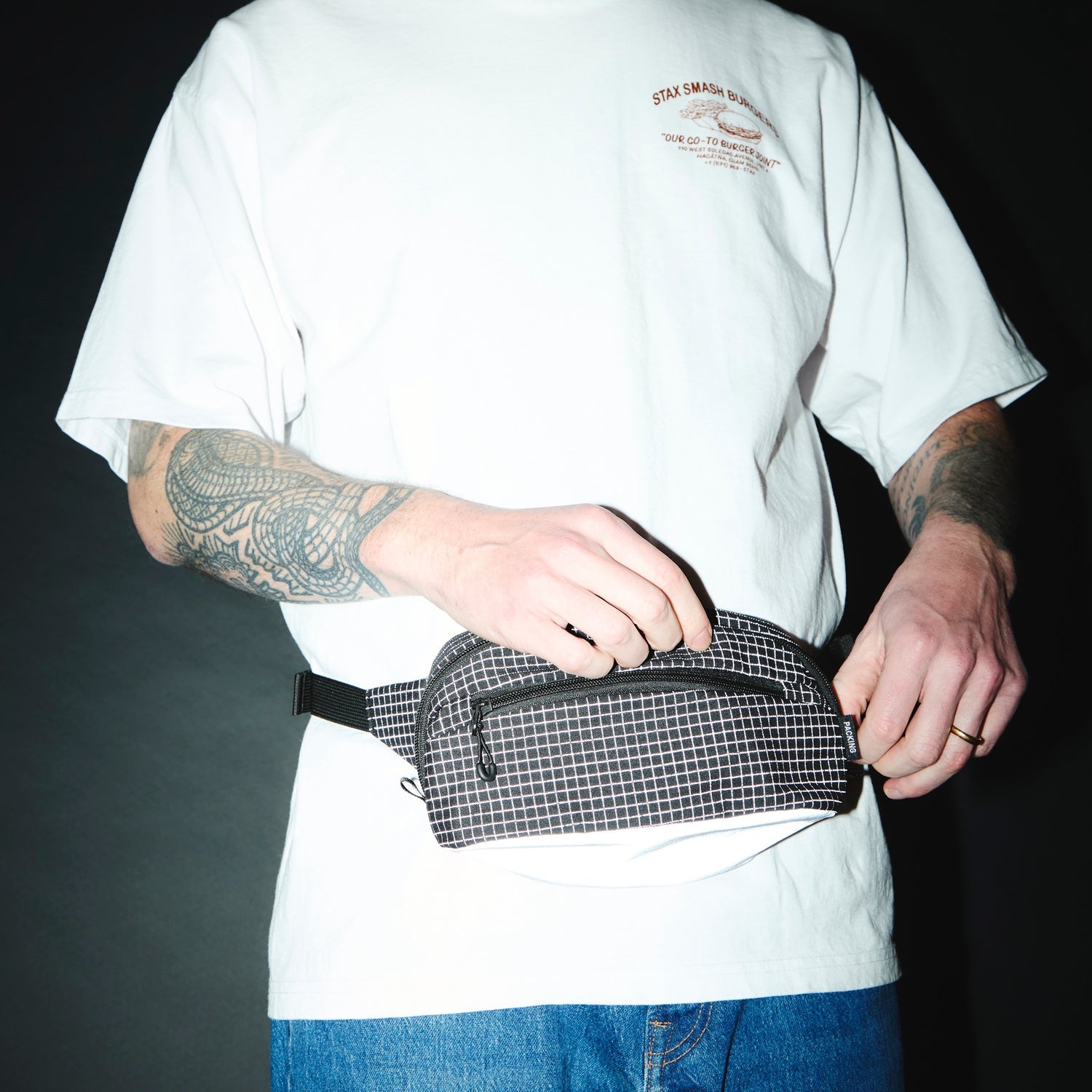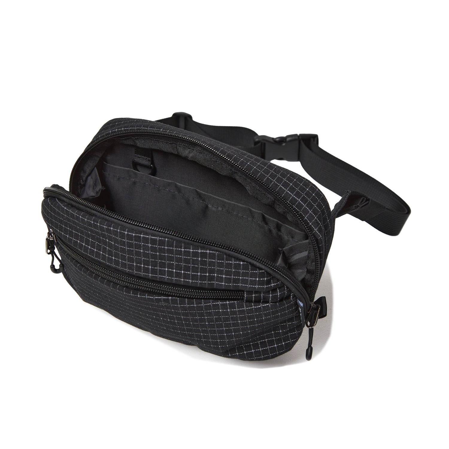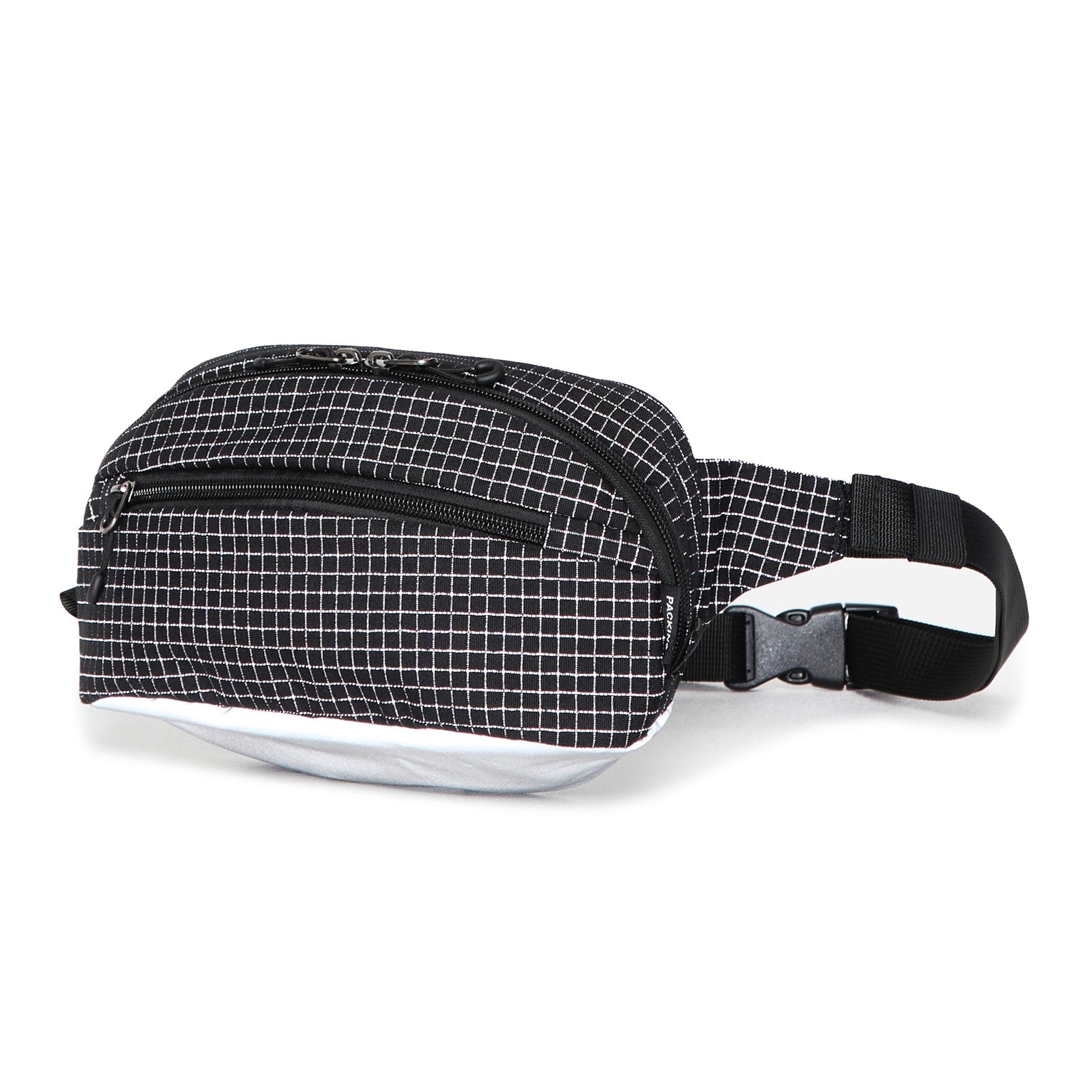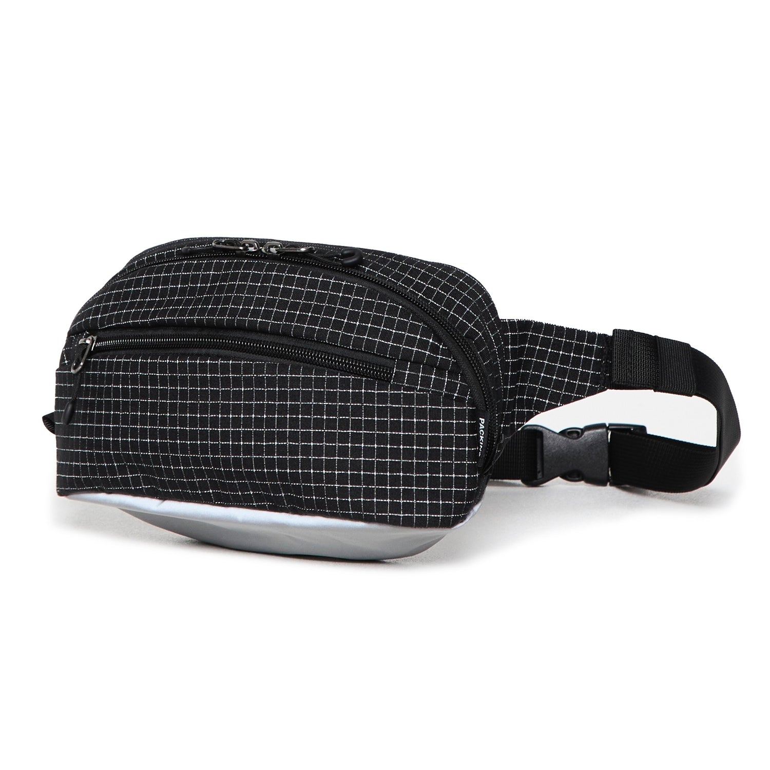 数年前にブルックリンやニューヨークのアートスークールの生協だったり、大学の生協を周った時があって。そこにシンプルで安いバッグパックやトートバッグが売っていたんです。そんなバッグを思い出させてくれるようなこのPACKING。こちらは、新作のリフレクターウエストバッグ。チェック柄の糸と底がリフレクター素材になっていて、コンパクトだけど収納力があって、Dカン付きも便利。シンプルで使いやすくて安い。その中にも野暮ったいアメリカっぽさがあるウエストバッグ。学生や若い子なんかにガンガン使って欲しいですね。