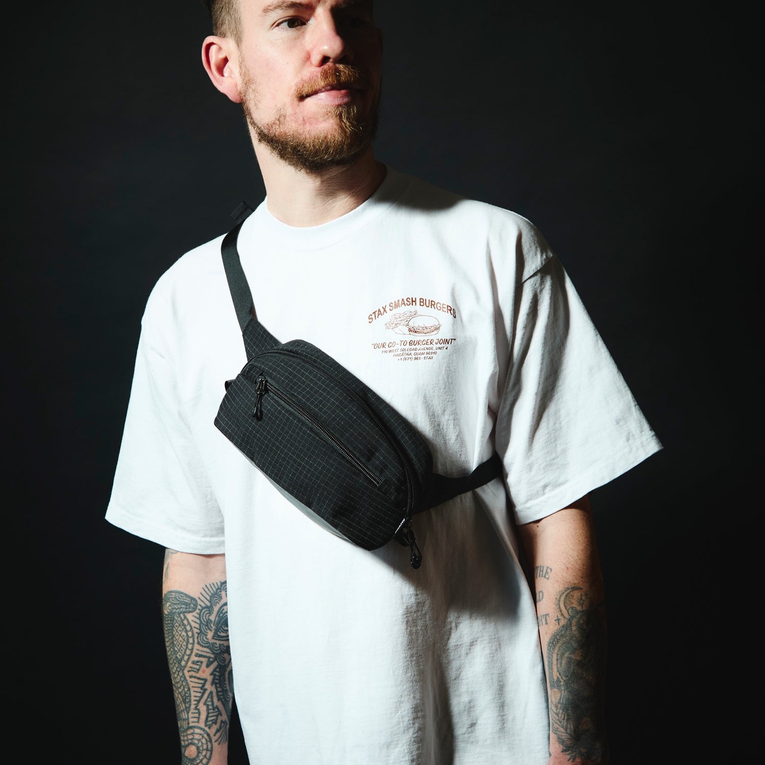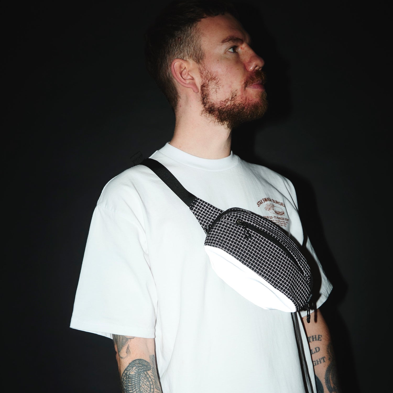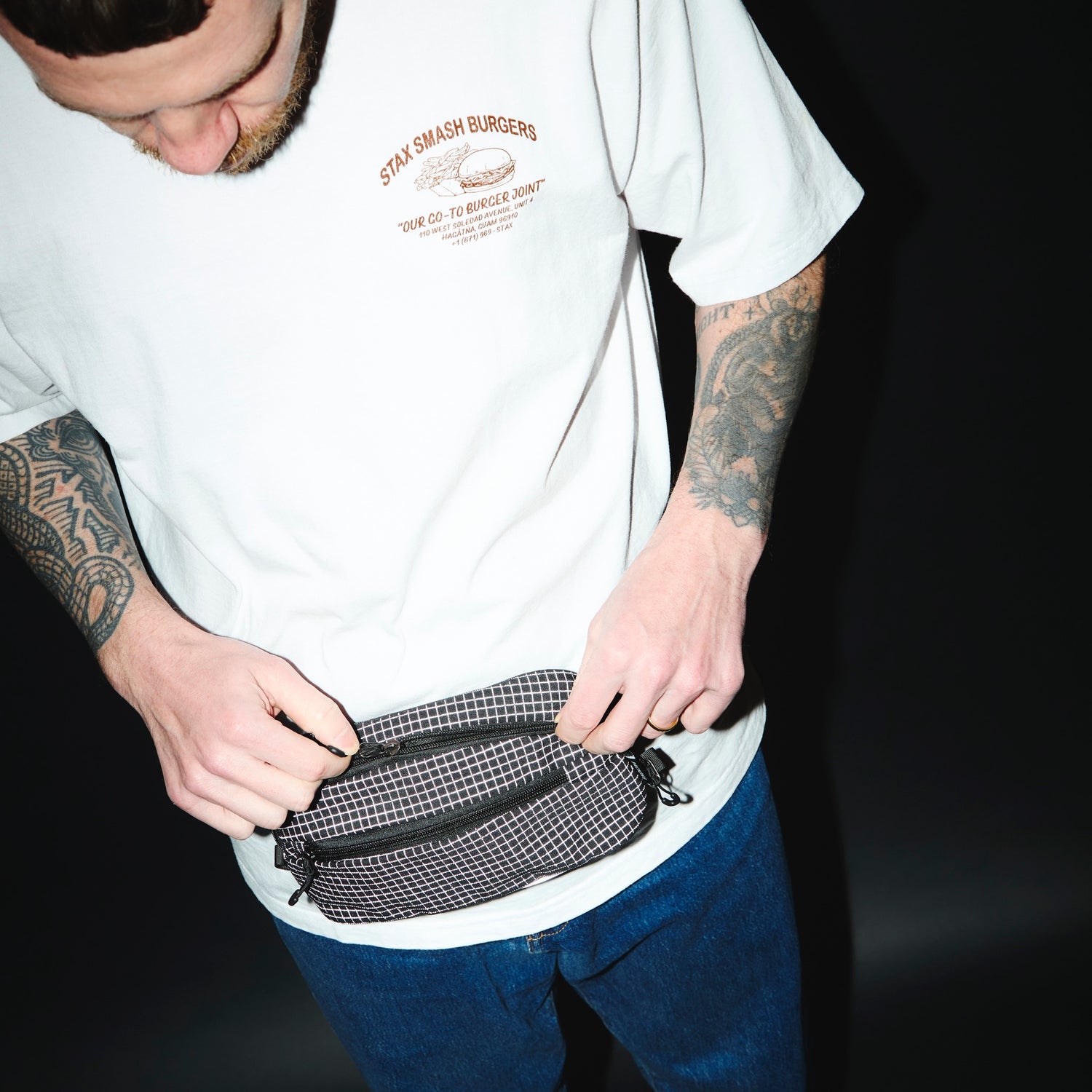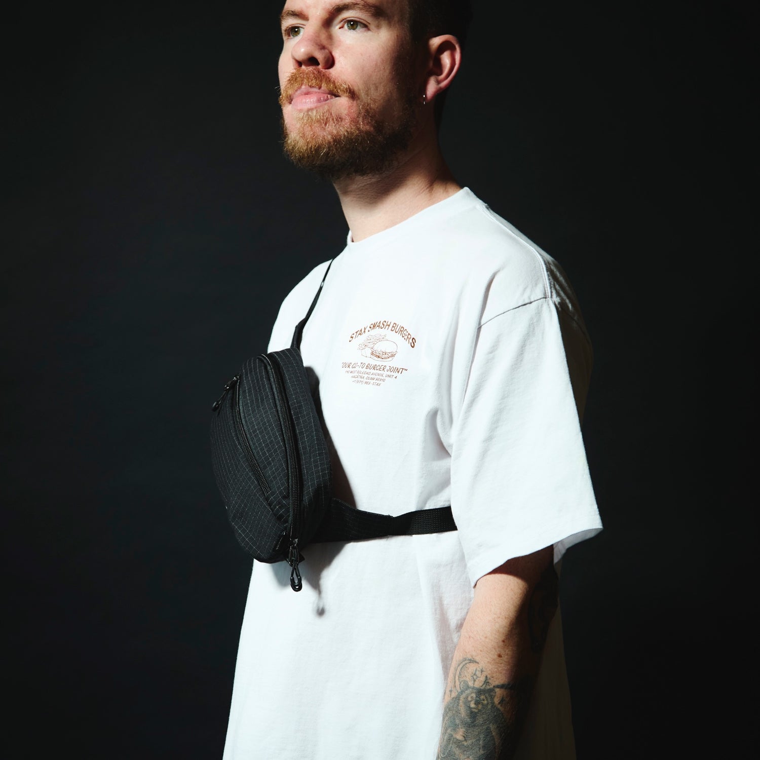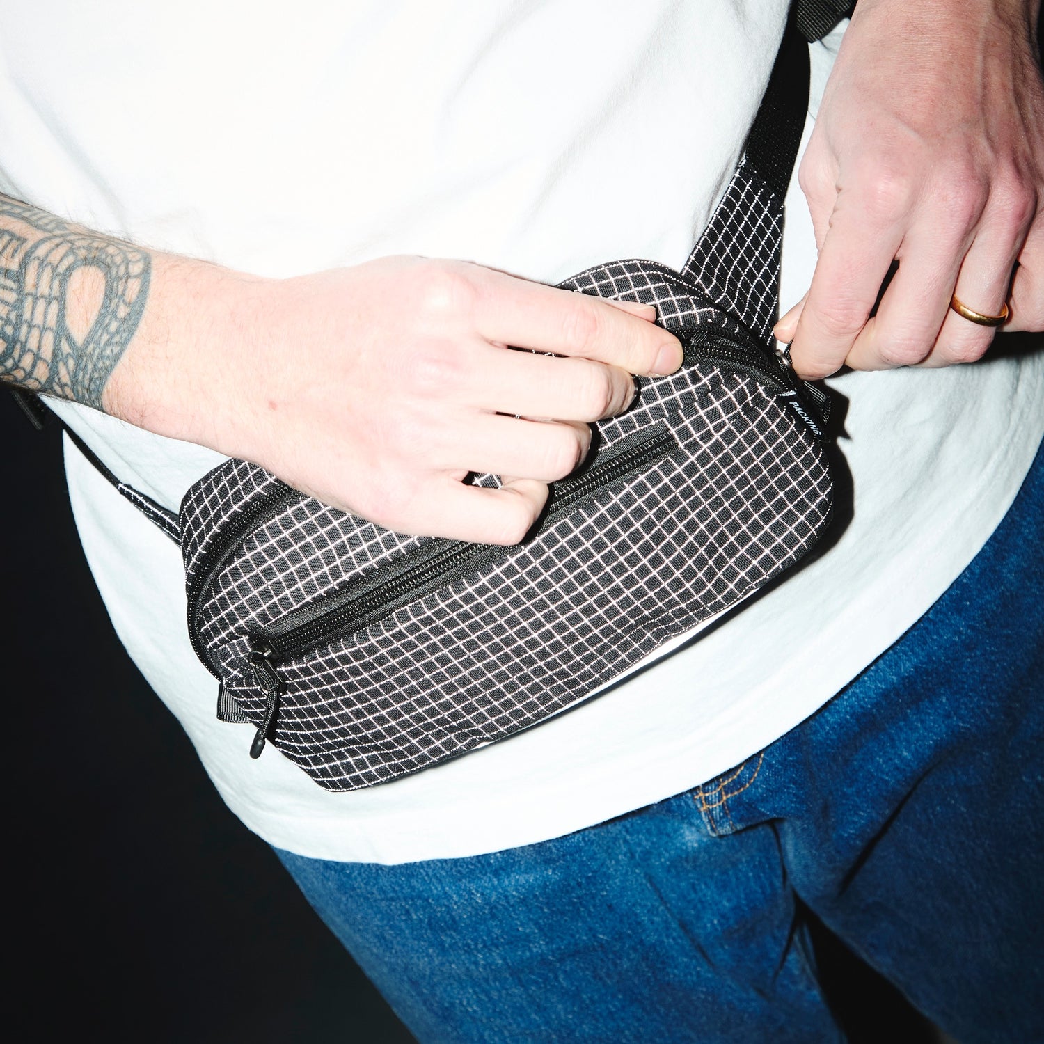 数年前にブルックリンやニューヨークのアートスークールの生協だったり、大学の生協を周った時があって。そこにシンプルで安いバッグパックやトートバッグが売っていたんです。そんなバッグを思い出させてくれるようなこのPACKING。こちらは、新作のリフレクターウエストバッグ。チェック柄の糸と底がリフレクター素材になっていて、コンパクトだけど収納力があって、Dカン付きも便利。シンプルで使いやすくて安い。その中にも野暮ったいアメリカっぽさがあるウエストバッグ。学生や若い子なんかにガンガン使って欲しいですね。