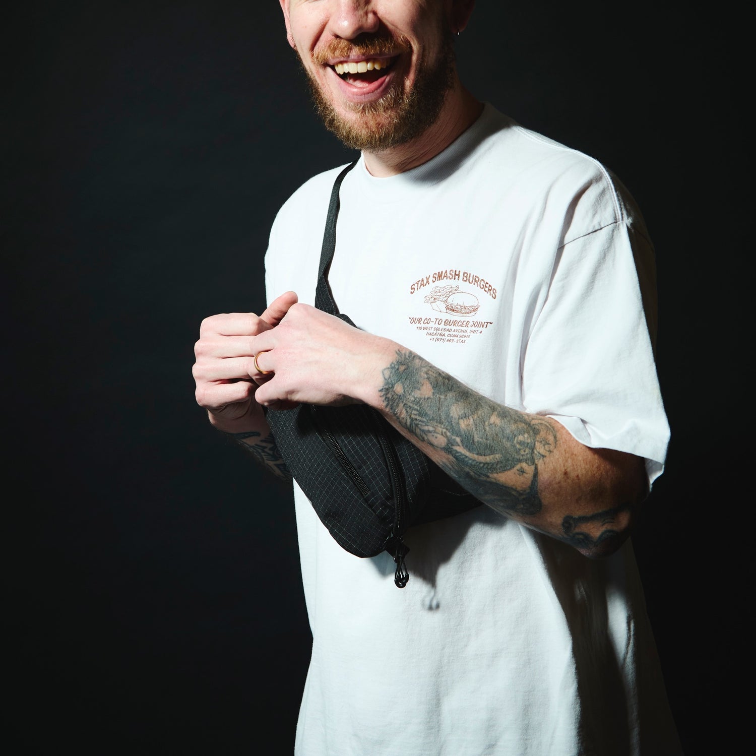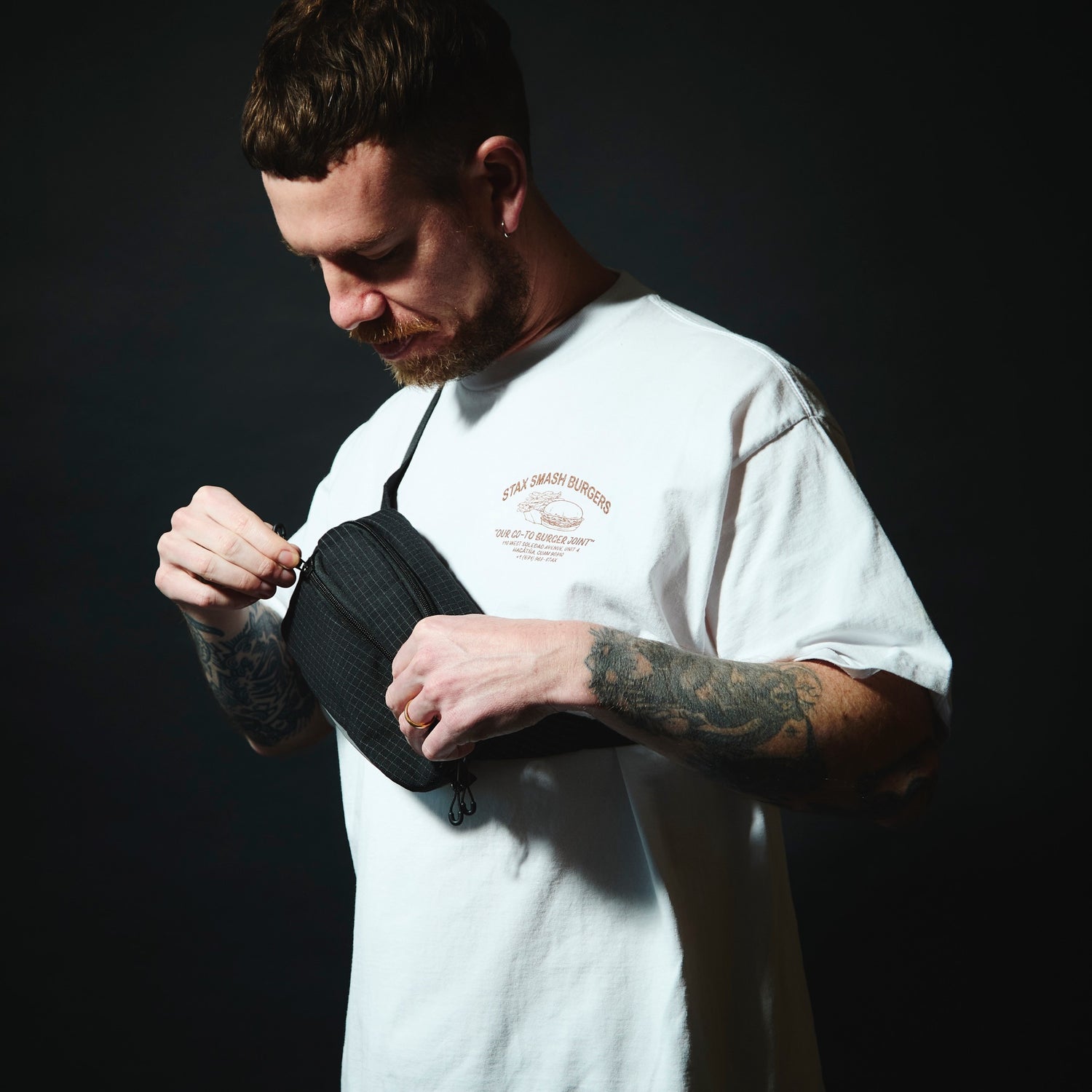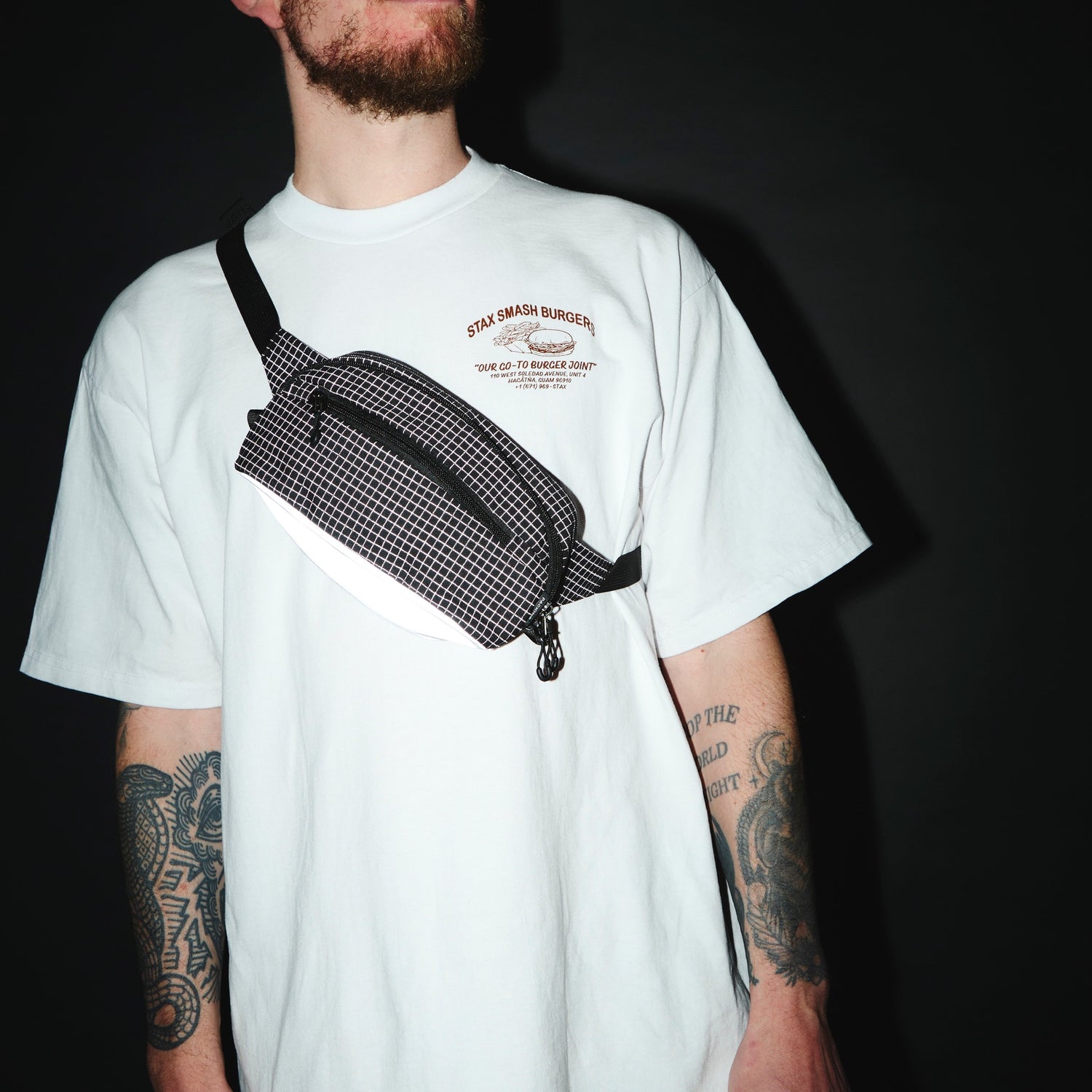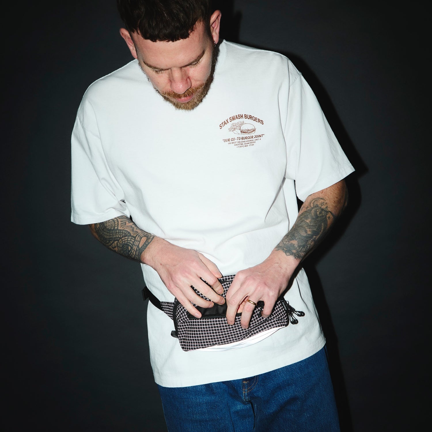 数年前にブルックリンやニューヨークのアートスークールの生協だったり、大学の生協を周った時があって。そこにシンプルで安いバッグパックやトートバッグが売っていたんです。そんなバッグを思い出させてくれるようなこのPACKING。こちらは、新作のリフレクターウエストバッグ。チェック柄の糸と底がリフレクター素材になっていて、コンパクトだけど収納力があって、Dカン付きも便利。シンプルで使いやすくて安い。その中にも野暮ったいアメリカっぽさがあるウエストバッグ。学生や若い子なんかにガンガン使って欲しいですね。