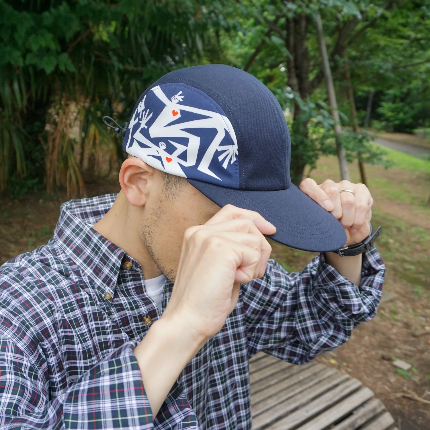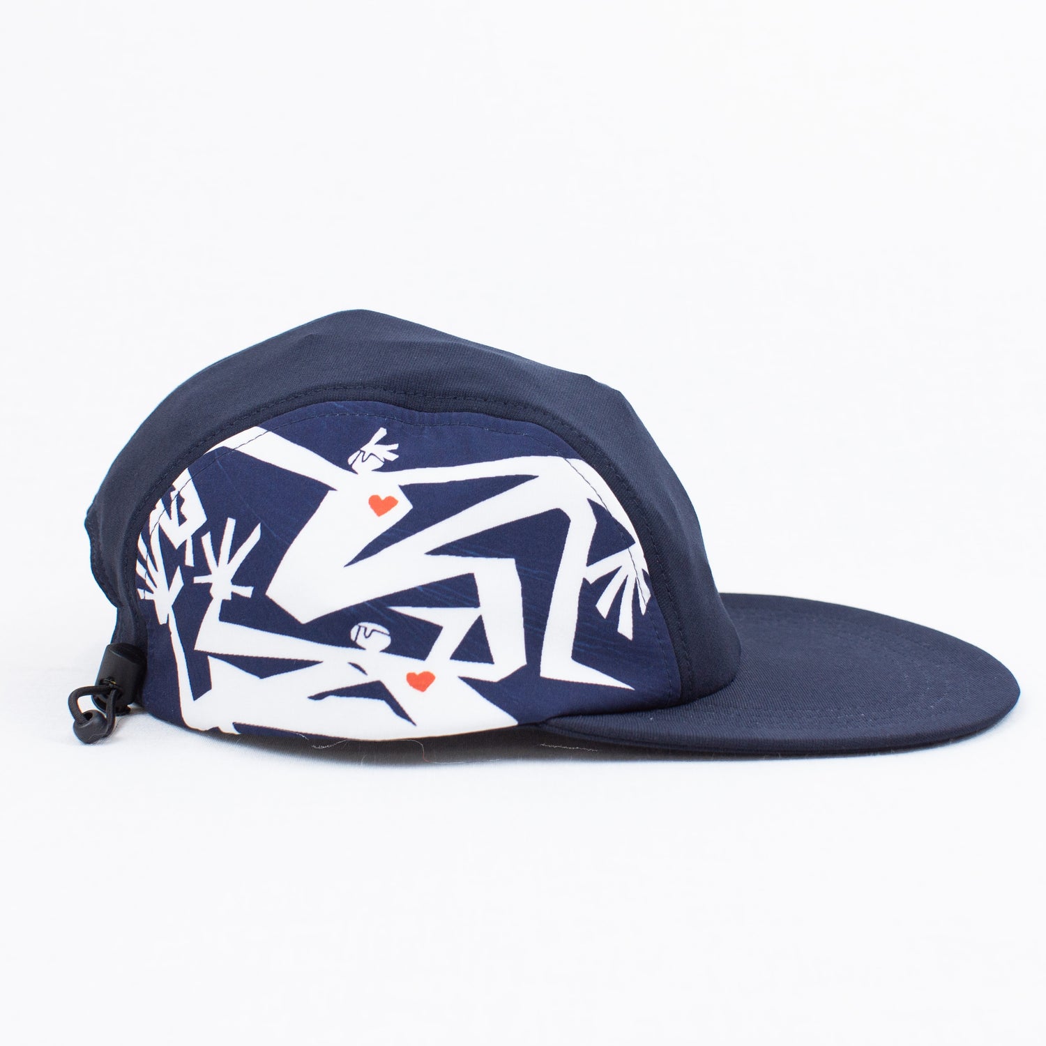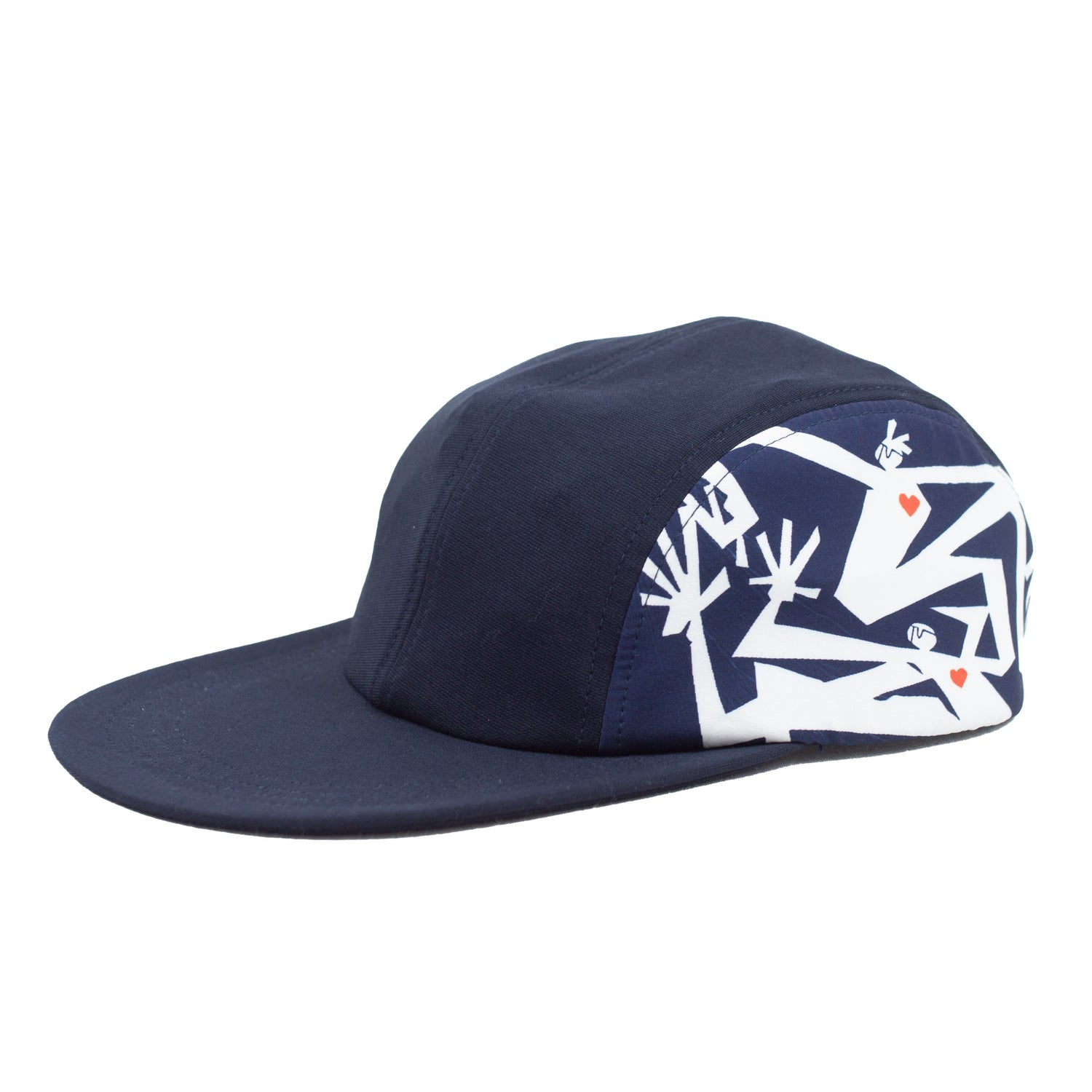 自分のアートワークが両脇のサイドパネルに施されたCAMP CAPになります。さりげない赤いハートマークがポイントです。調整ストラップでサイズも調整可。これからの季節にもちょうど良いと思うのでぜひぜひよろしくお願いします!