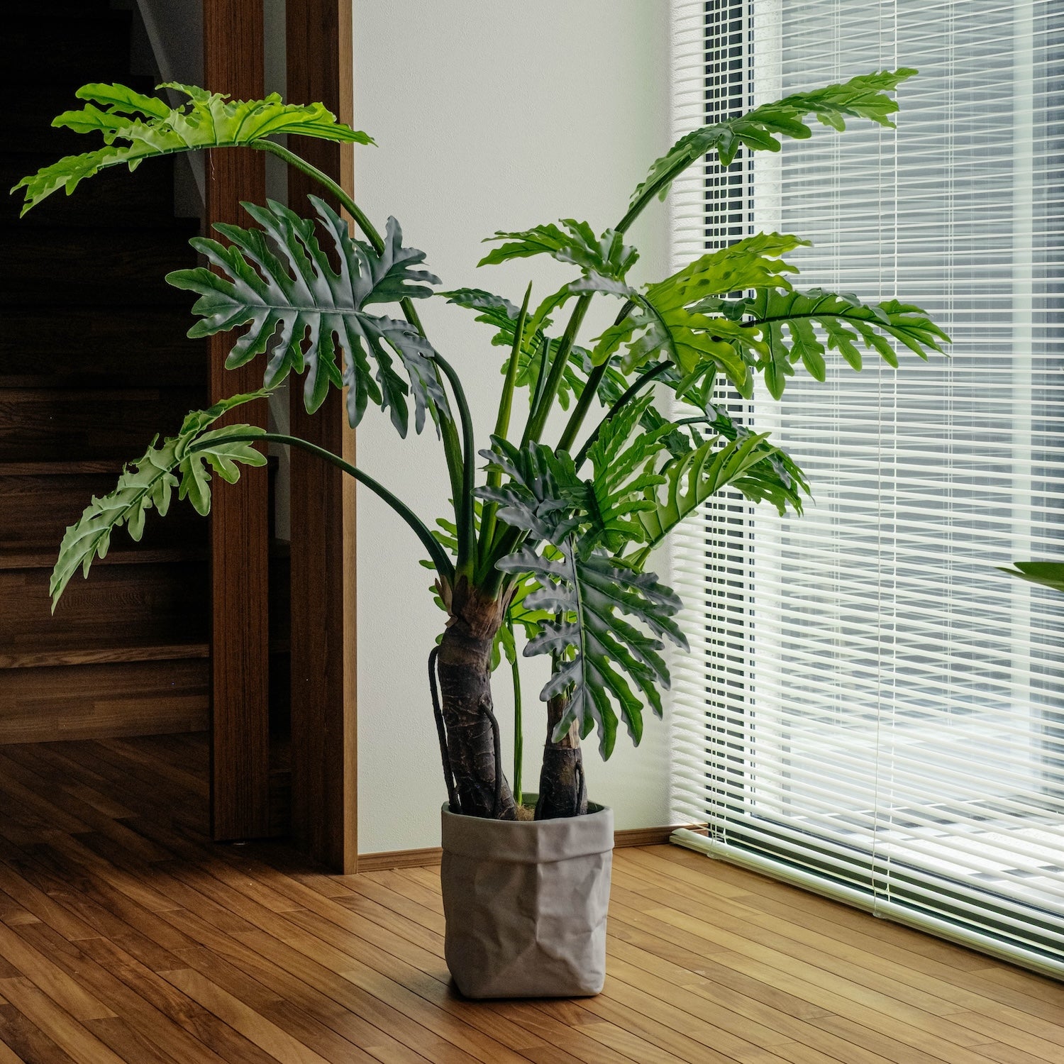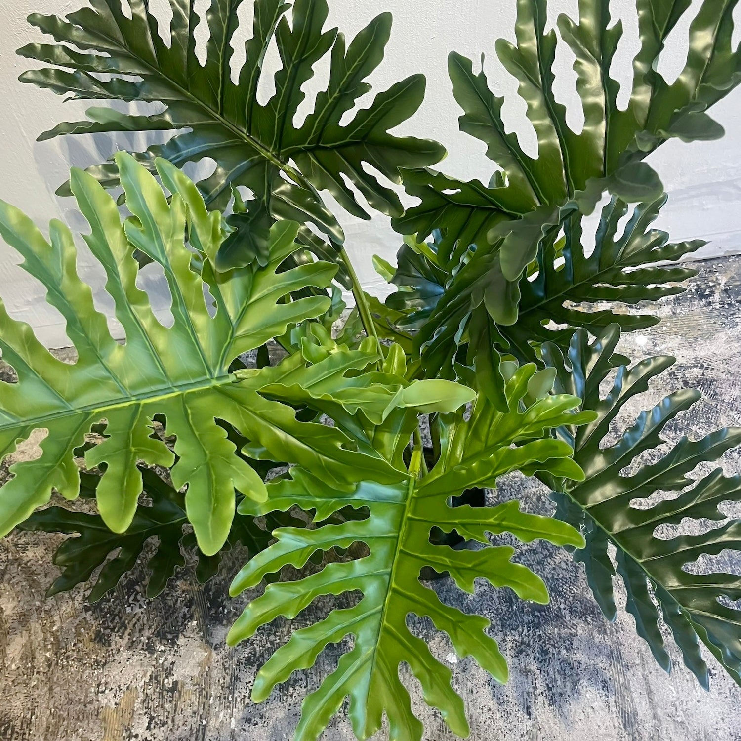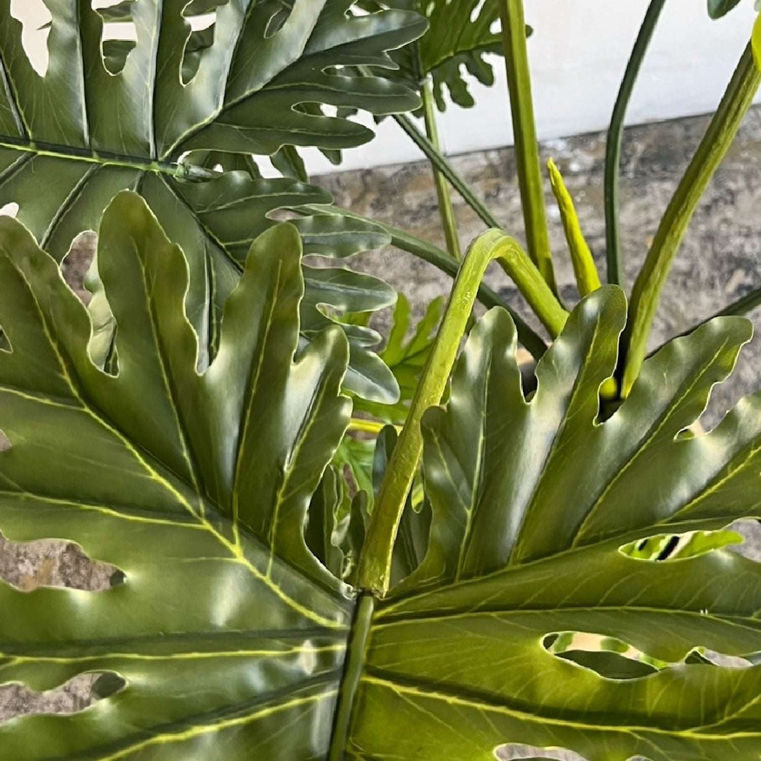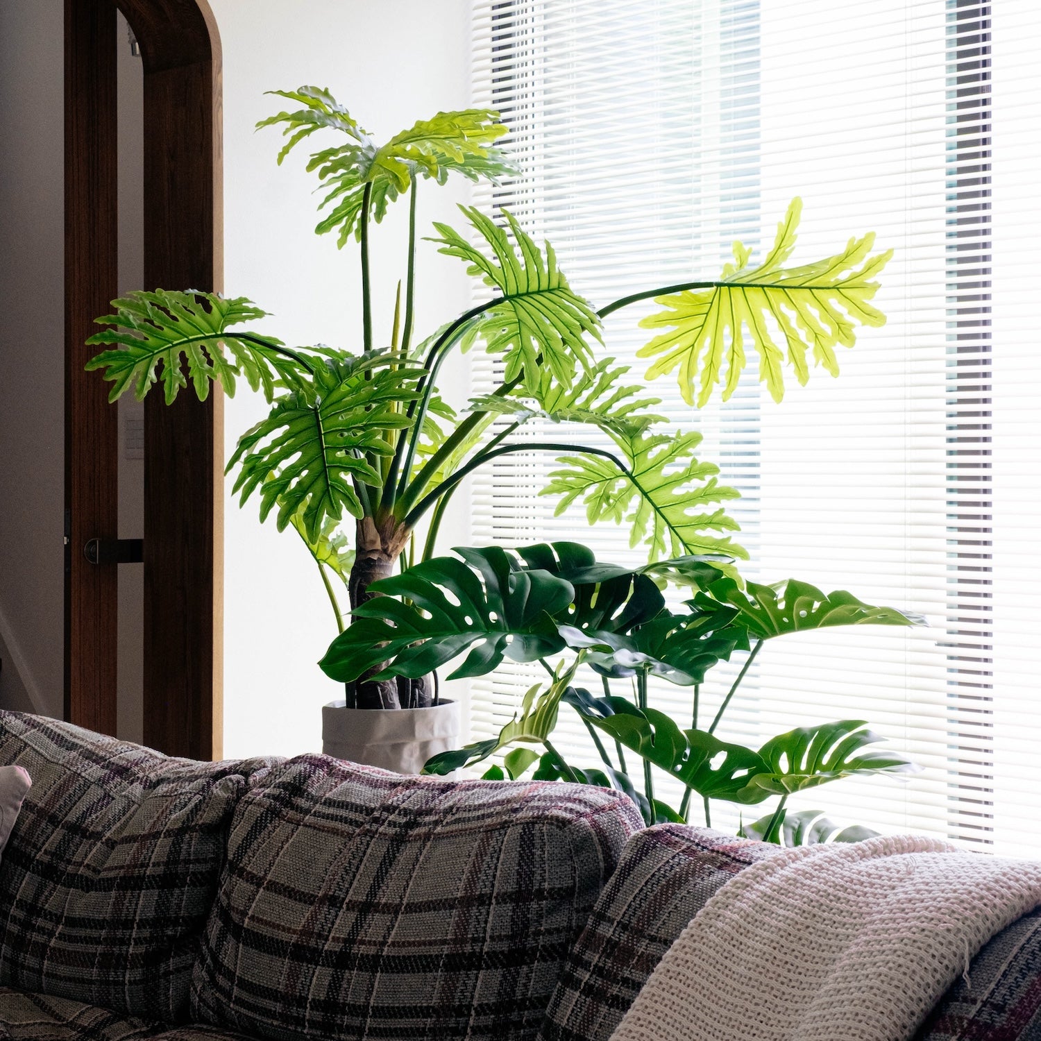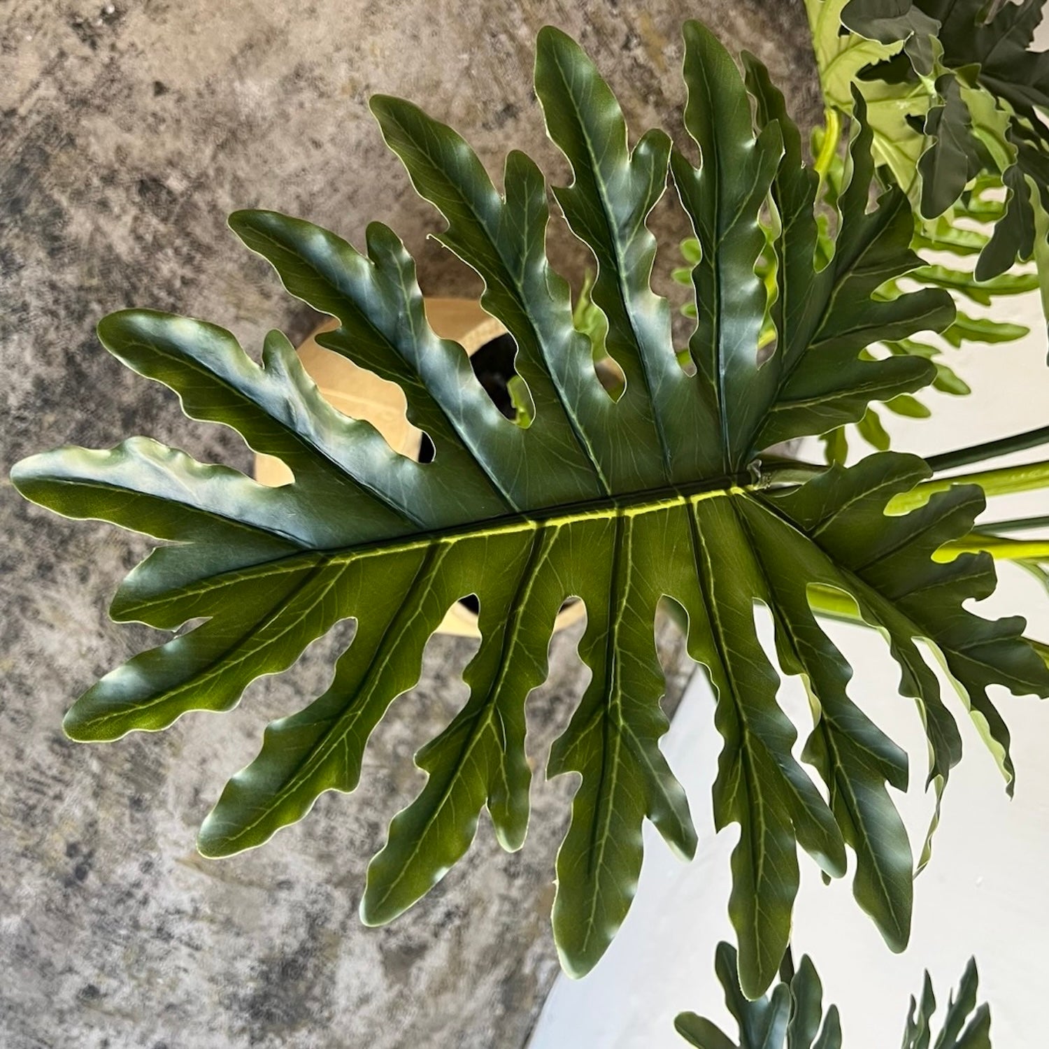 セロームはサトイモ科フィロデンドロン属に分類される南ブラジル原産の植物。深い切れ込みの入った大きな葉が特徴的で、1株で空間の主役になる力があるので、部屋に置くとフォーカルポイント感がマシマシに。もちろんフェイクなので水やり不要、サトイモ科特有のシュウ酸カルシウムでペットがかじって心配…なんてリスクもなし。これ本物?と必ず聞かれる、とてもリアルなフェイクグリーンです。