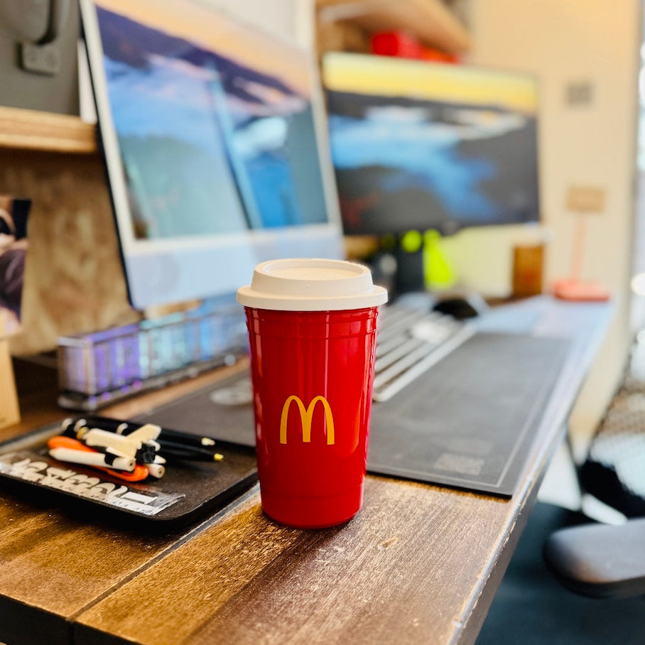 これをポンっとテーブルの上に置いただけでその場の雰囲気を支配してしまう、マクドナルドのロゴとカラーにはそんな力があります。このポップの魔力にはどんなデザインも敵いませんね。これからの時期にはコーヒーやココアを入れて勉強に仕事に精を出したいものです。