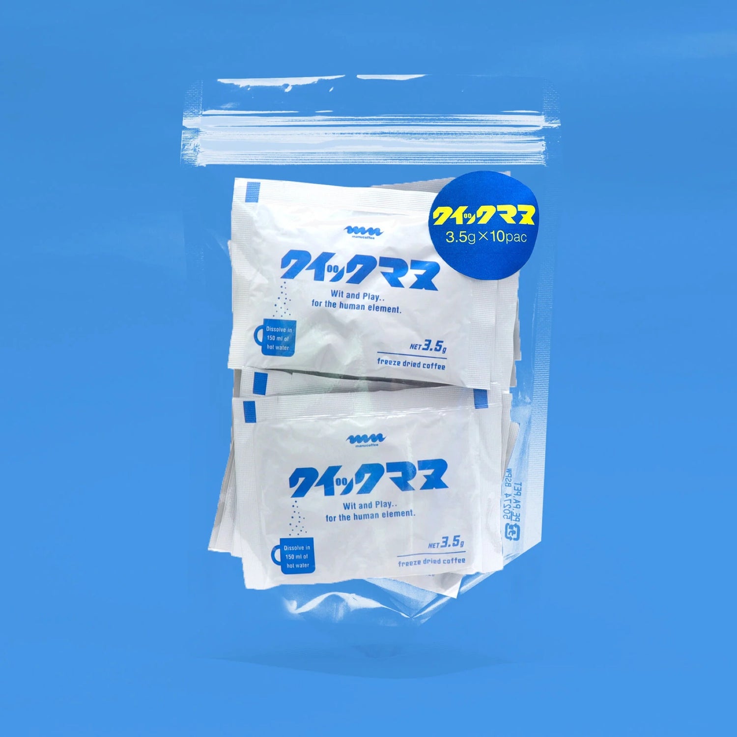 「クイックマヌ」はお湯を注ぐだけでスペシャルティコーヒーを味わえるインスタントコーヒー。いつものクジラブレンドの味が、簡単に、そして素早く(クイックに)楽しめます。10pac(10杯分)入り。