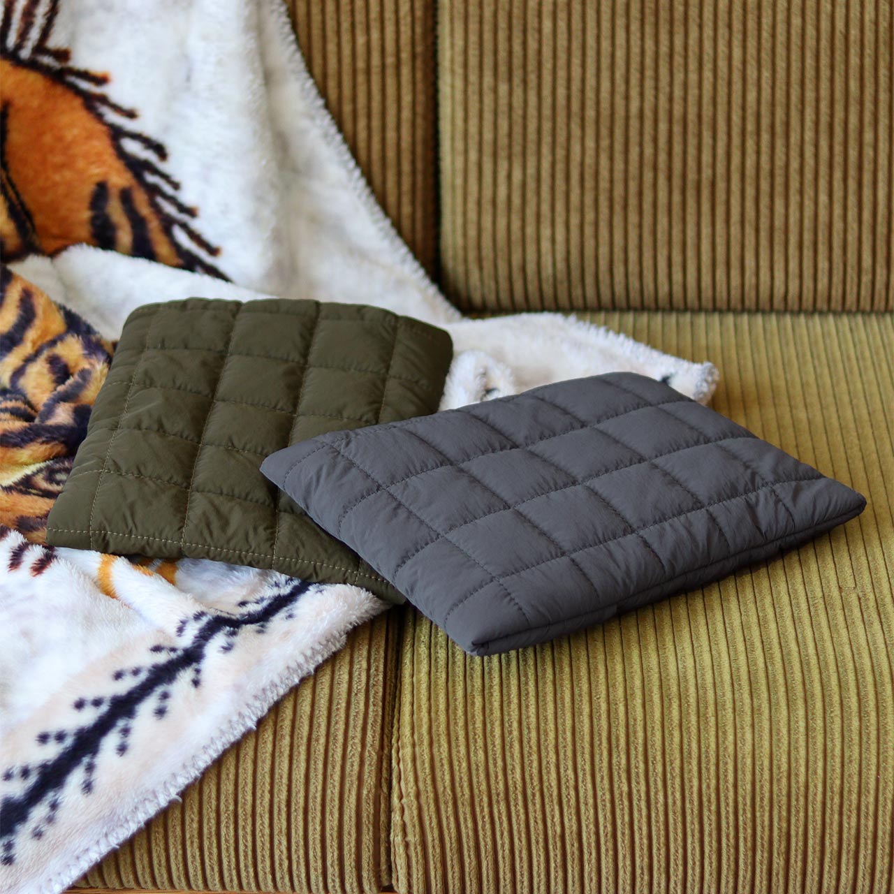 お湯の交換が不要な、繰り返し使える電気式(蓄熱式)湯たんぽ。コンセントに繋いで約15分充電するだけで、アンカ(布団内などの使用)で約7時間、カイロ(膝上などの使用)で約3時間程度ご使用いただけます。蓄熱後はコードレスで持ち運べるため、布団の中やリビングでのリラックスタイム、車やアウトドアなど様々なシーンでお使いいただけます。専用カバーの柄は全部で5パターン。手触りの良いフリース素材を使用した人気のタイガー柄や、コミカルなシロクマ柄と、メンズライクなキルティング生地を使用したシンプルなオリーブ・グレーカラーなど、男女問わず使いやすいデザインに仕上げました。カバーはファスナーテープ式で取り外しも簡単。 汚れた際は手洗いも可能なので、汚れを気にせずお使いいただけます。(湯たんぽ本体は洗濯できません。)