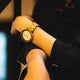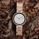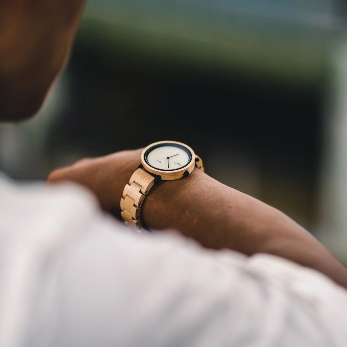 腕時計のケースは、ユニセックスで使うことのできる38㎜を採用。周りには存在感が出すぎず、さりげないナチュラルさが出る2㎜の木製ケースを配置。男性でも女性でも綺麗に馴染む大きさになっています。