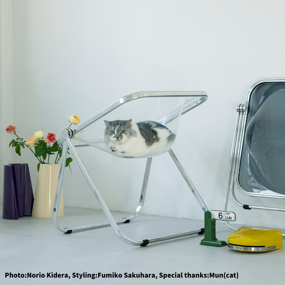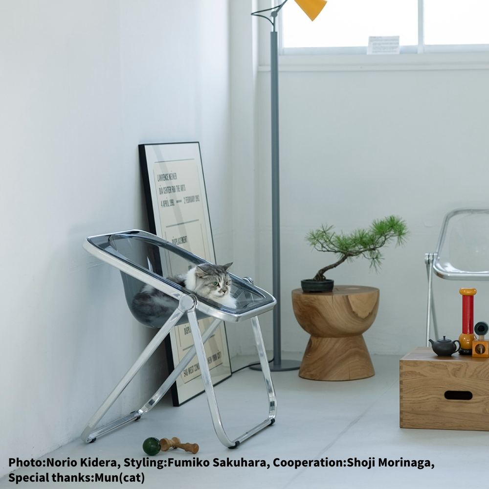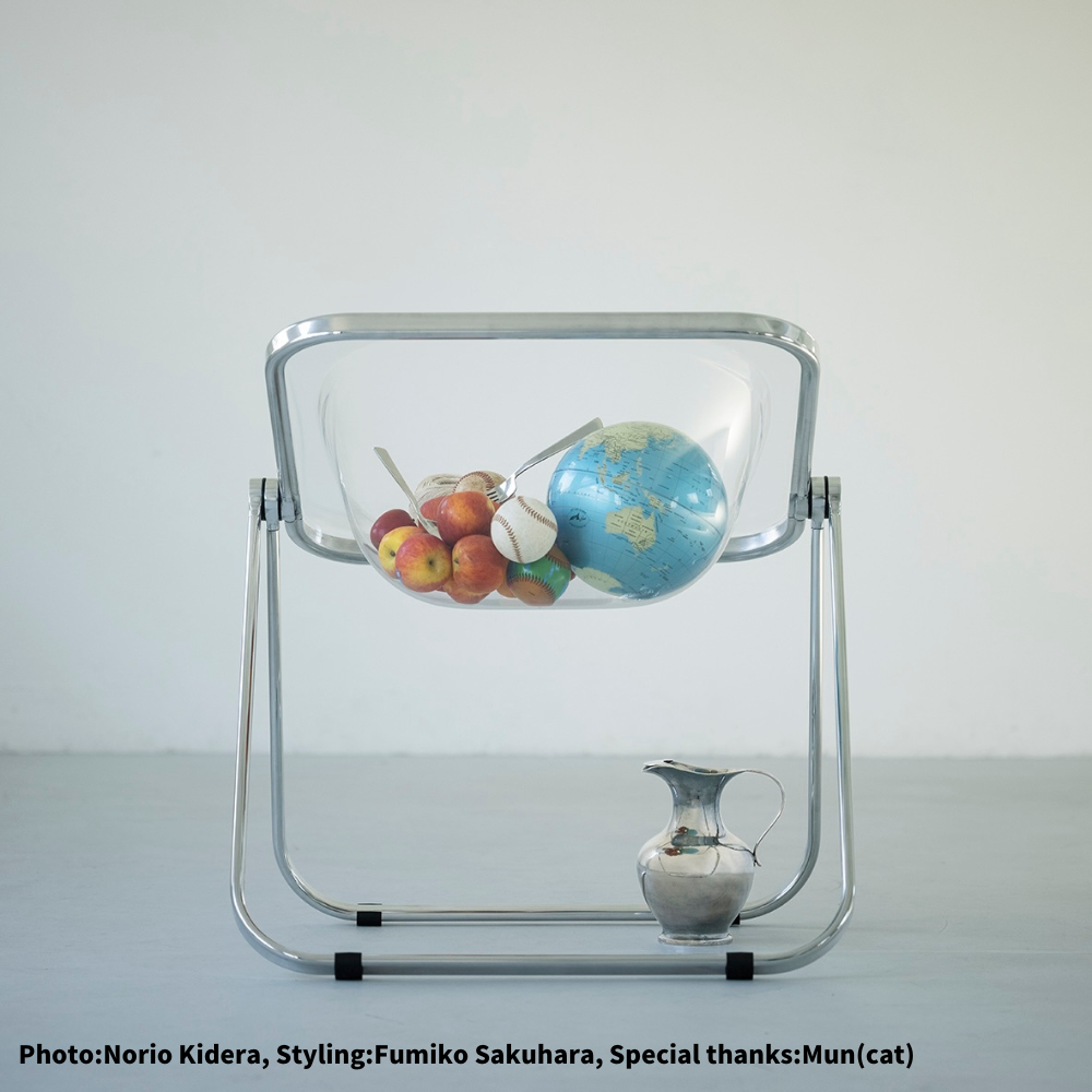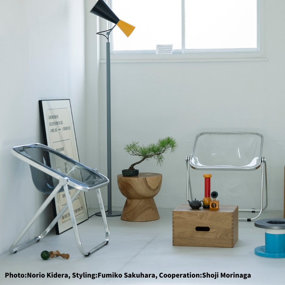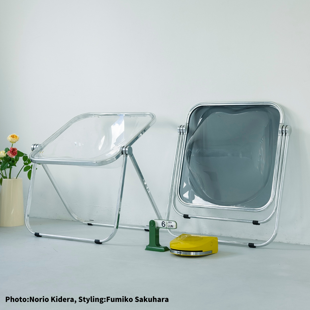 ジャンカルロ・ピレッティの名作折りたたみチェア。同デザイナーのプリアチェアの方が有名かもしれませんが、こちらは見た目も近未来的で、有機的なアクリルが折りたたんでいる状態でもかわいい。どっぷり存在感がありますが、クリアな素材で意外と圧迫感もなく、一個でも、複数揃えてもおすすめ。