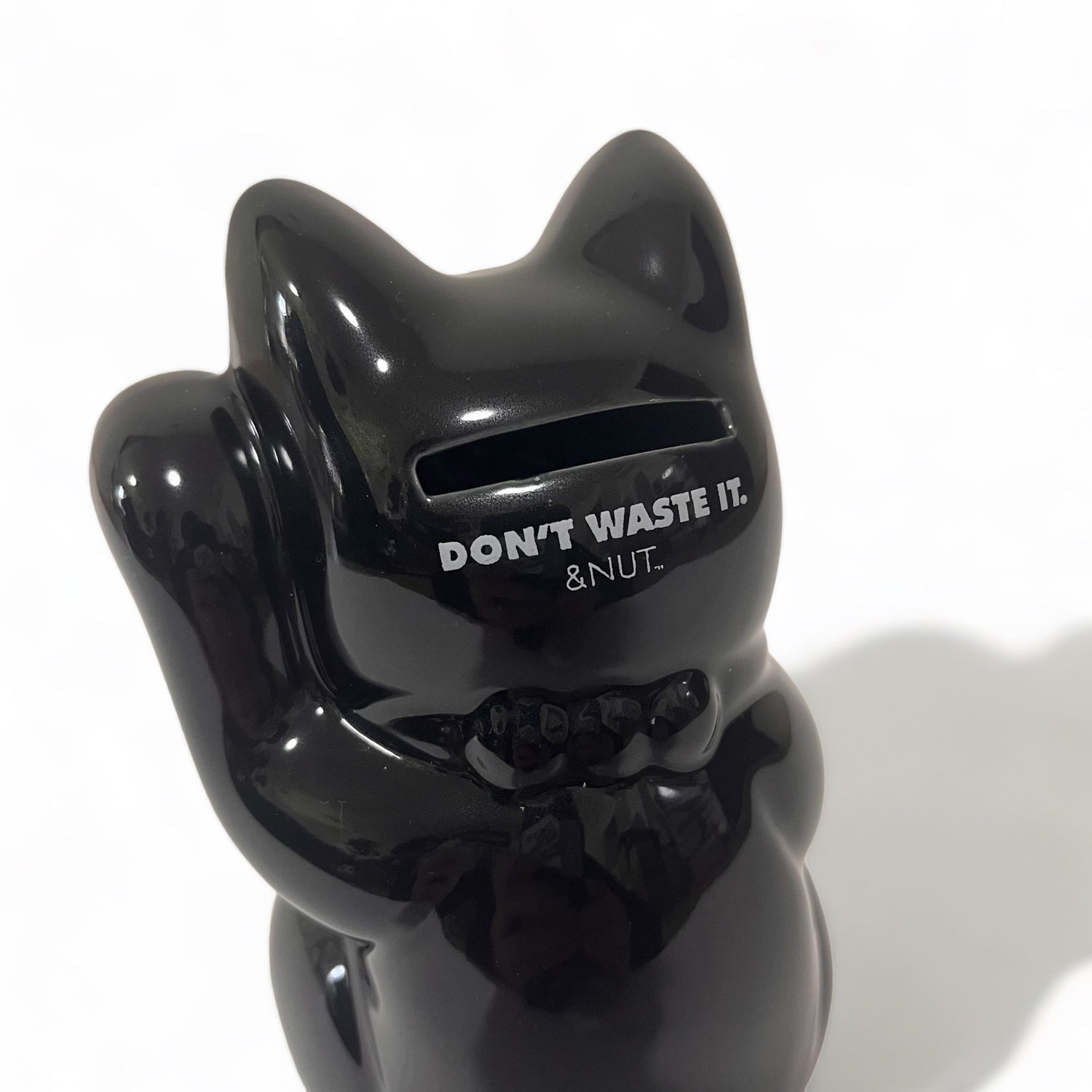 黒猫の貯金箱。豚じゃなくて。英語だと貯金箱のこと「PIGGY BANK」って言うんですって。豚じゃなくても。不思議ですよね…。「DON’T WASTE IT=無駄遣いするな」ってことで、ちゃんと五百円玉も入るサイズにしてあります。頑張って五百円玉貯金しましょ。 五百円玉だけを満タンで約8万円くらい貯まります。(もうちょっと入るかも?)