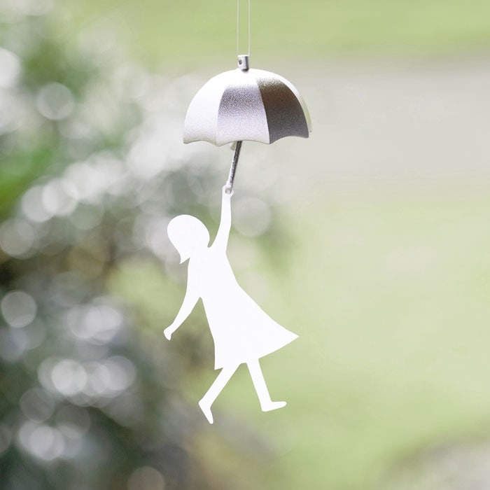 傘をモチーフにした風鈴。鳴り子は傘の持ち手の形になっています。傘を高く掲げて持っているような女の子の短冊が揺れると、雨が降っているのを楽しんでいるかのようです。また、真鍮ならではのリーンと涼やかな音色が、雨の日のじめじめした感じを爽やかな気分に変えてくれますよ。とても可愛らしいデザインは、お部屋のインテリアとしても一年中飾って楽しんでいただけます。一品一品手作業で傘の風合いに仕上げた職人の技術を感じてみてください。化粧箱入り。