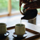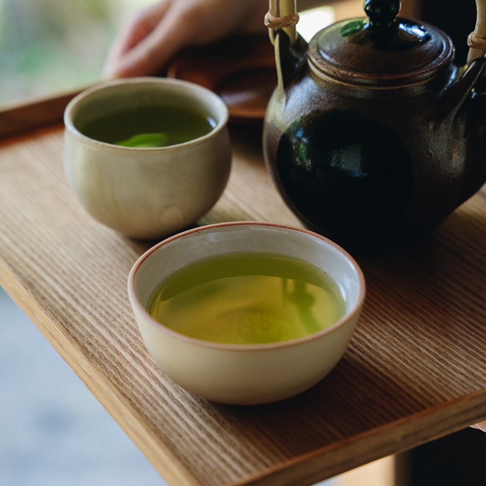 型染めは、日本の伝統的な染色技法のひとつ。地の部分には糊を置いて防染してから、図案の部分を一色ずつ染めていきます。パーツがバラバラにならないよう型をつなげる「ツリ」の部分があるのも味わいのひとつ。今回、私たちの新しいパッケージのために型染めでお茶の道具を描いてくださったのは、染色家の宮入圭太さん。一杯のお茶をいただく時間は、私たちの生活の中に根付き、豊かな心をもたらします。その様子を端的に、美しく表現してくださいました。縁起のよい色合いで、贈り物にもおすすめです。